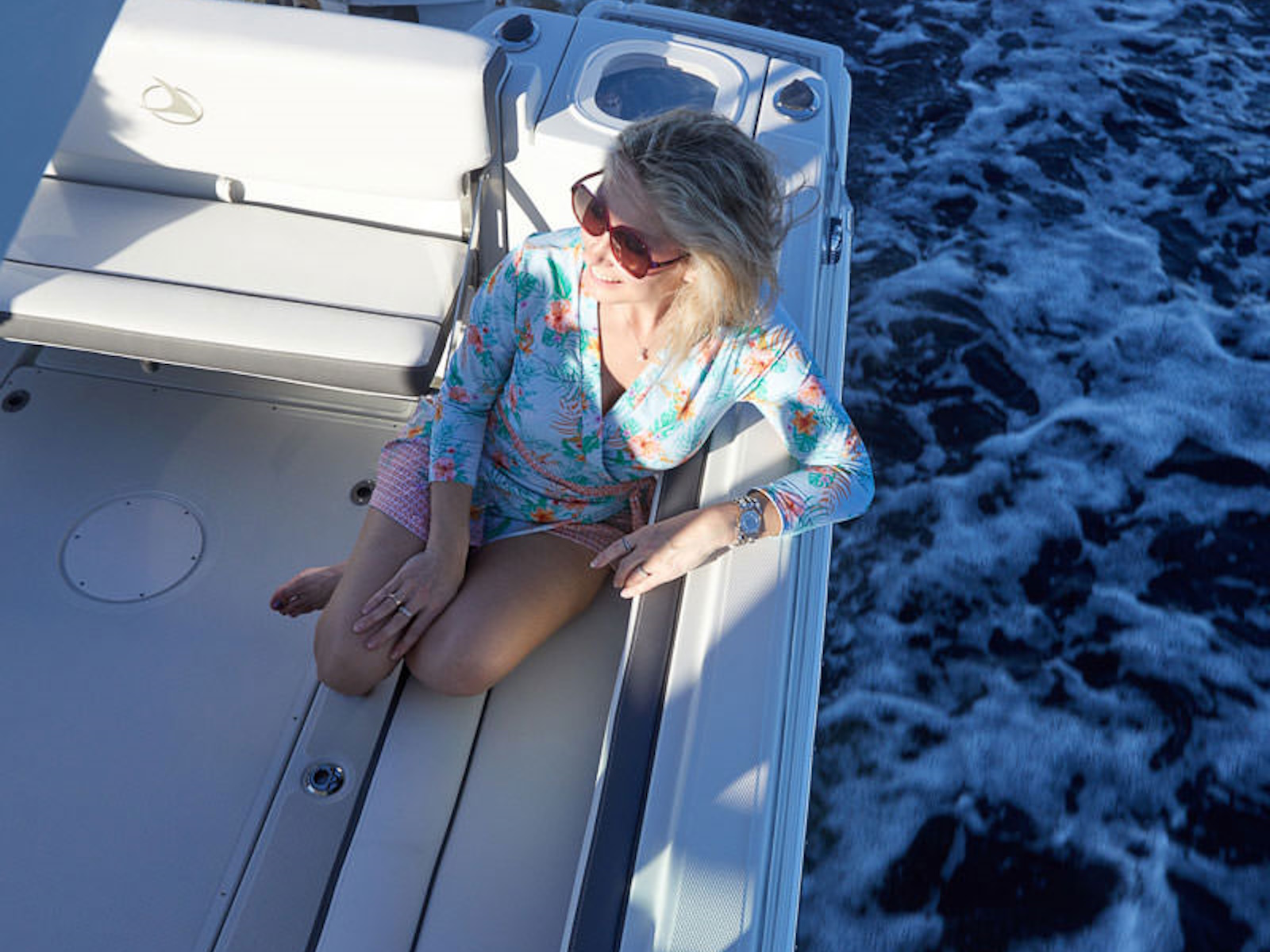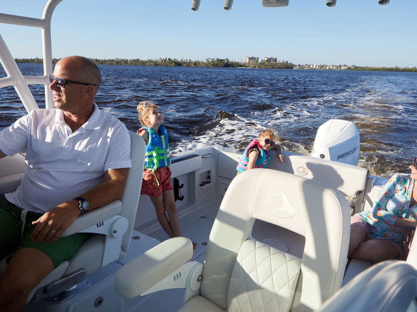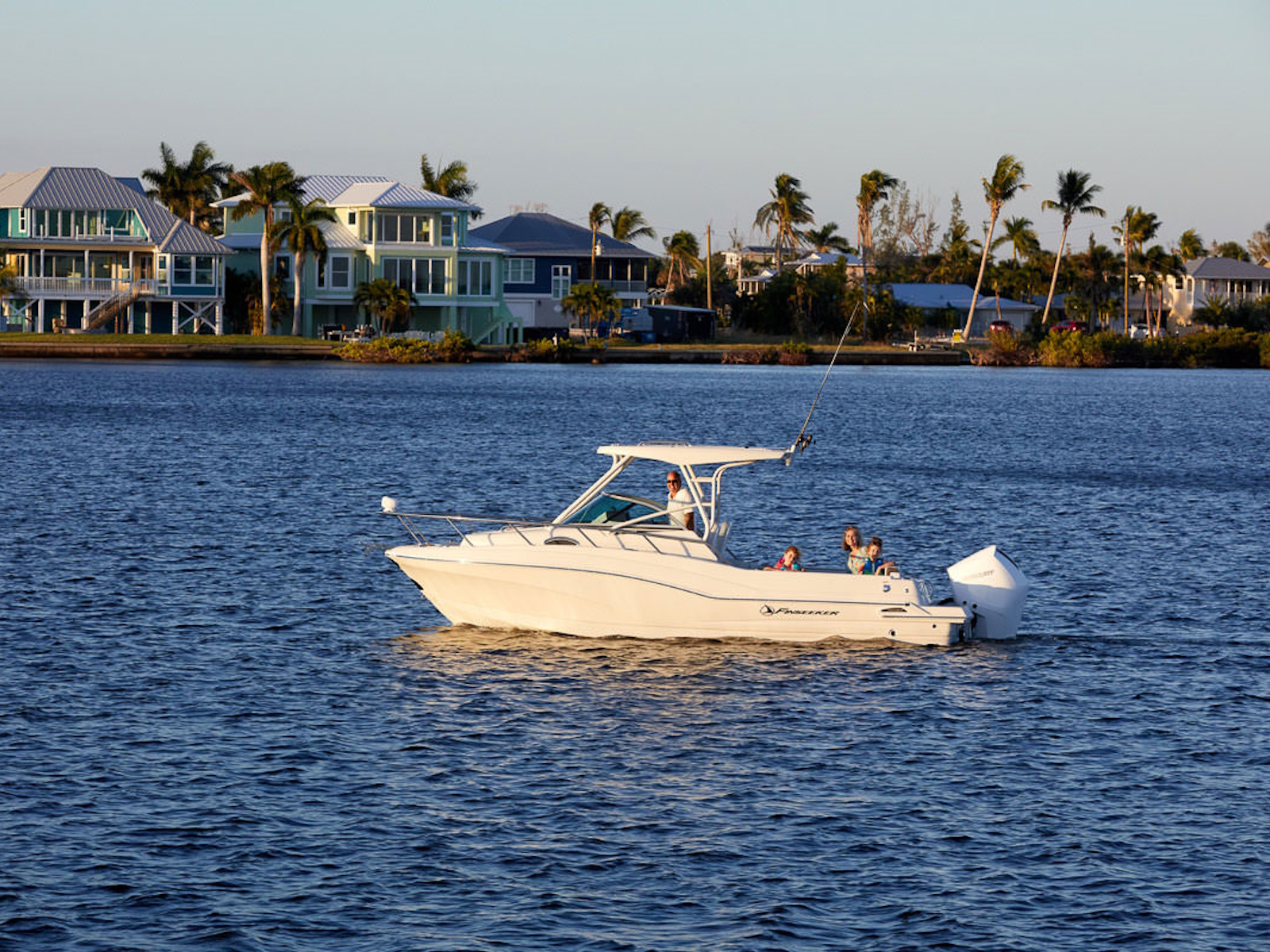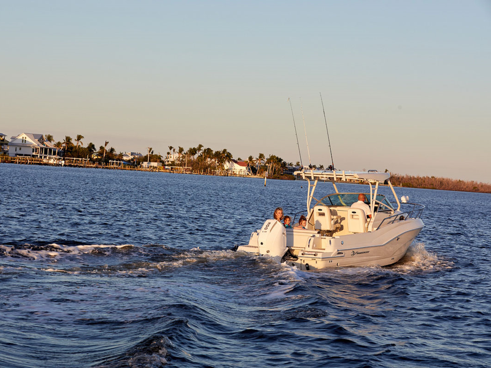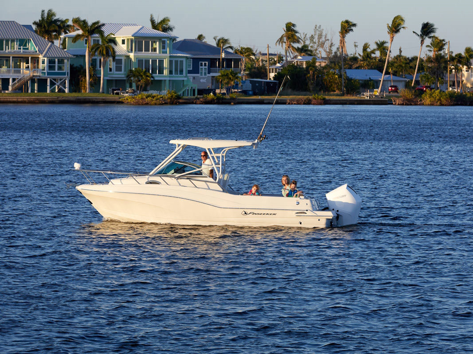 The new Finseeker by Crownline 245 WA features a 360-degree walk-around for increased fishability. A great fishing / family boat, the 245 WA is trailerable and has a small cabin area with more than 6 feet of headroom, U-shaped seating with filler cushions to form a sleeping area, a portable head, microwave, and sink. The cockpit area seats six, with flip-up features for enhanced fishing capability. The standard fiberglass hard top has rear-facing LED work lights, 4 rod holders, overhead lights and walk-around grab rails, providing protection from the elements during a full day out on the water.