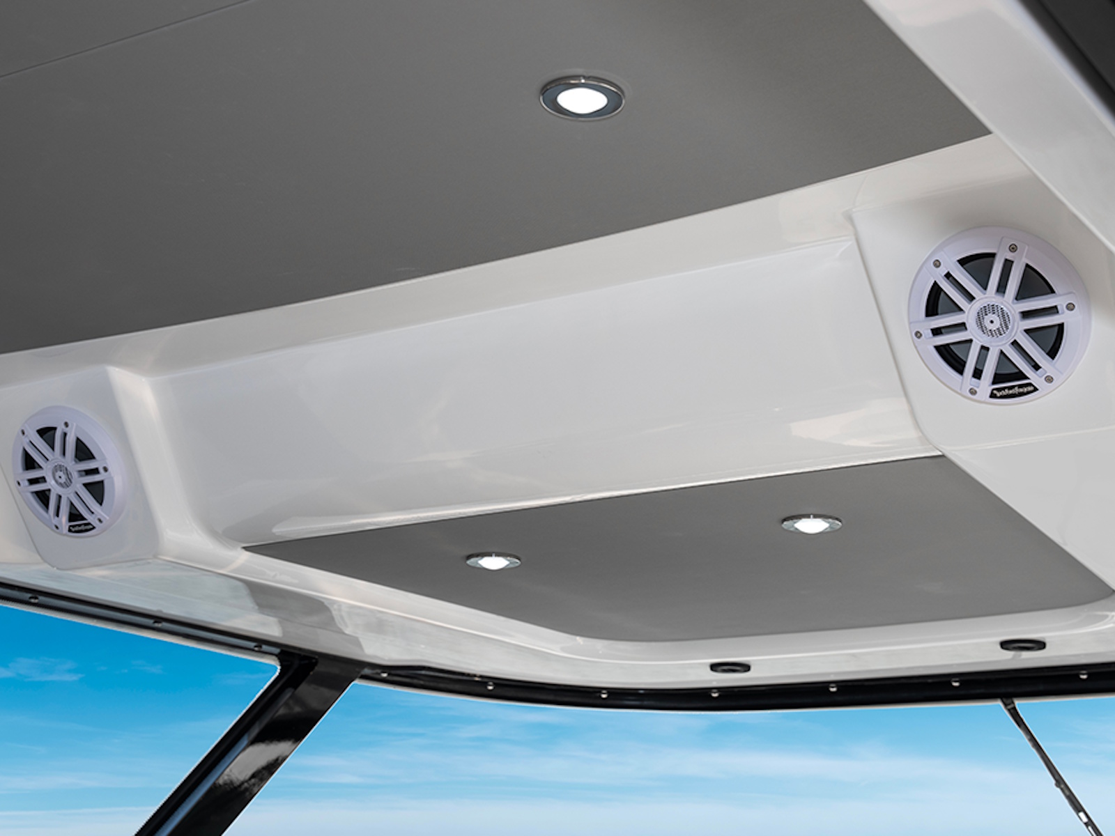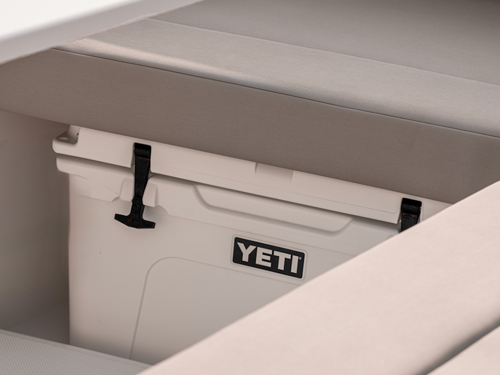 - From a serene cove to the open water, the bow lounge flexes to fit the day – a table that converts into a sunpad, Rockford Fosgate stereo system sets the vibe, and plenty of cupholders are within reach. With the optional foredeck shade and a stocked Yeti cooler, your crew stays refreshed and ready for wherever the horizon leads.