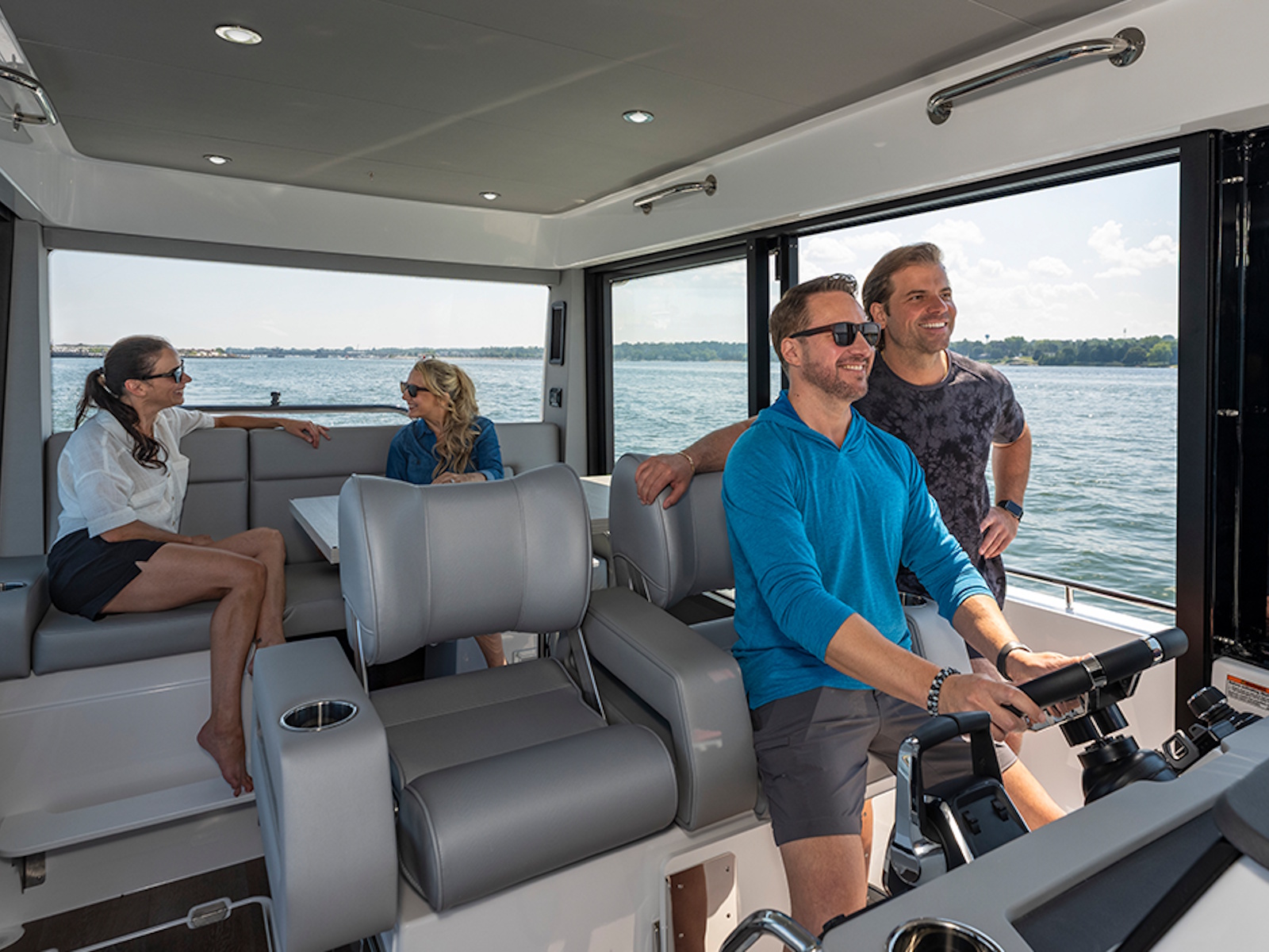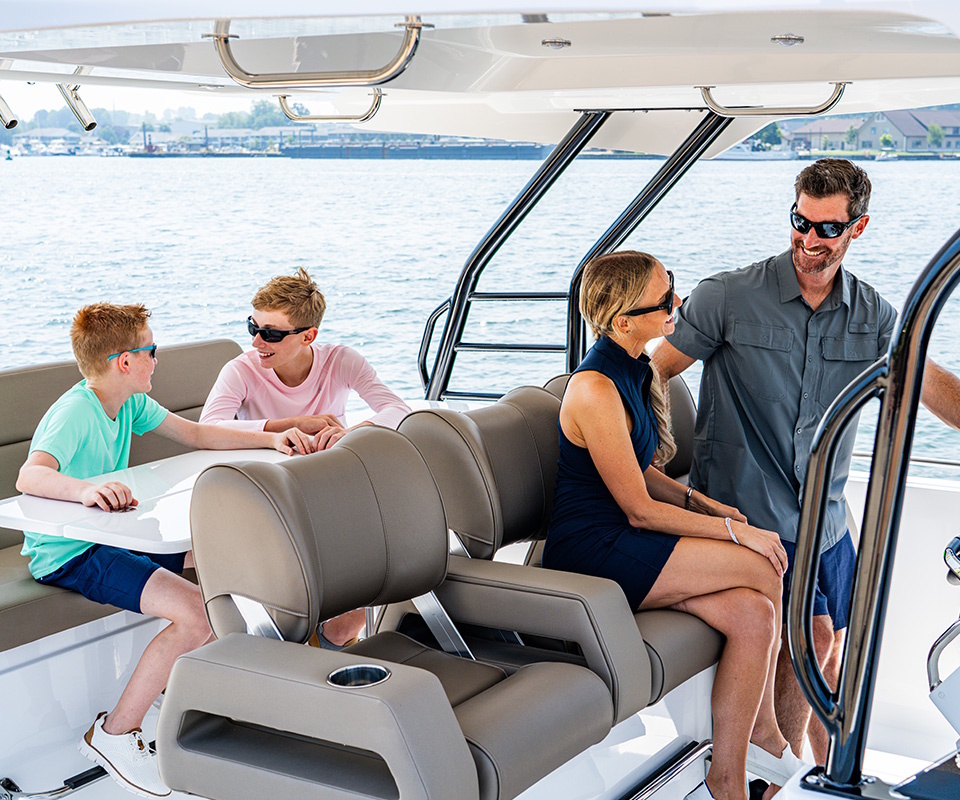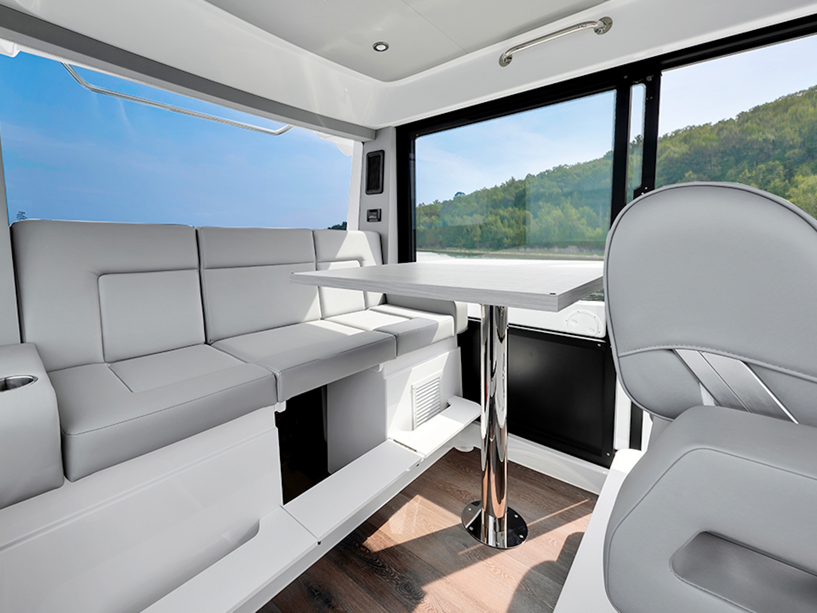 - When the helm seats flip to face aft, the cockpit becomes a versatile dining space. Pair them with the bench and you’ve got seating for five to share a meal, swap stories, and prepare for the next stretch.