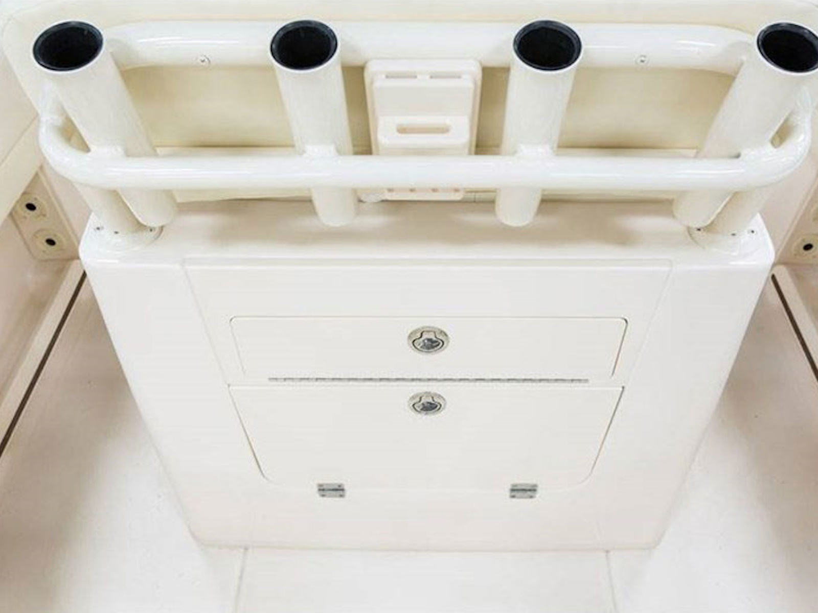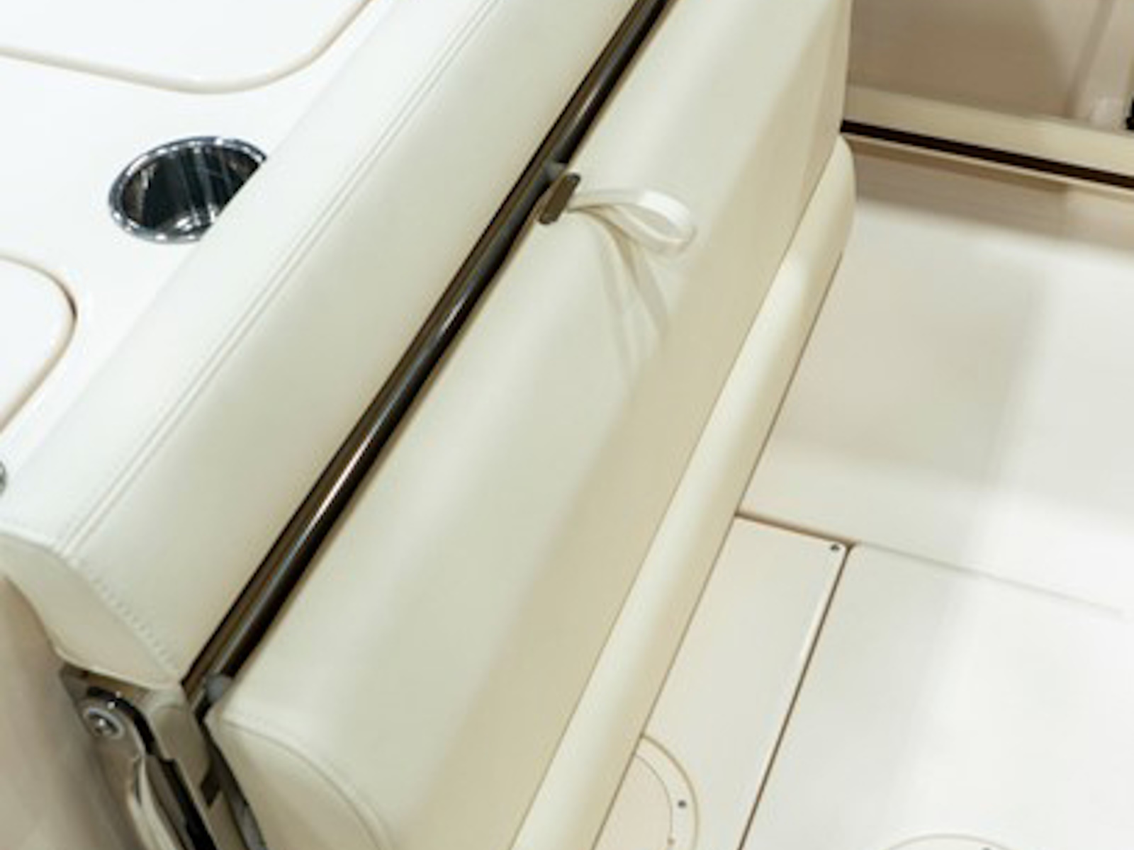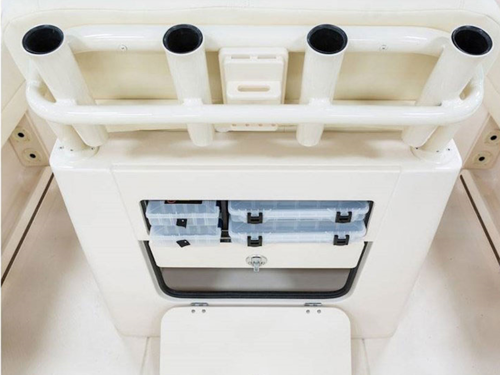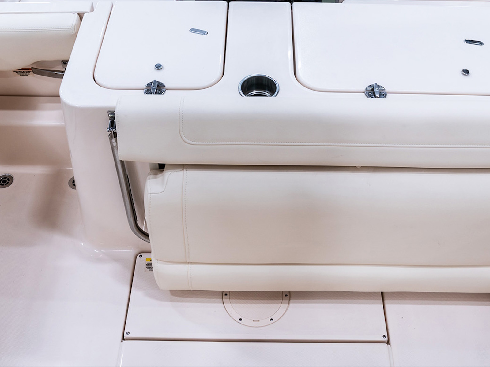 - Seating - Deluxe lean bar w/backrest, lockable storage, rod holders (4), 25-gal. (95 l) insulated raw water livewell (under seat) w/light, full column distribution inlet & ob drain (800 GPH pump) (3028 LPH)