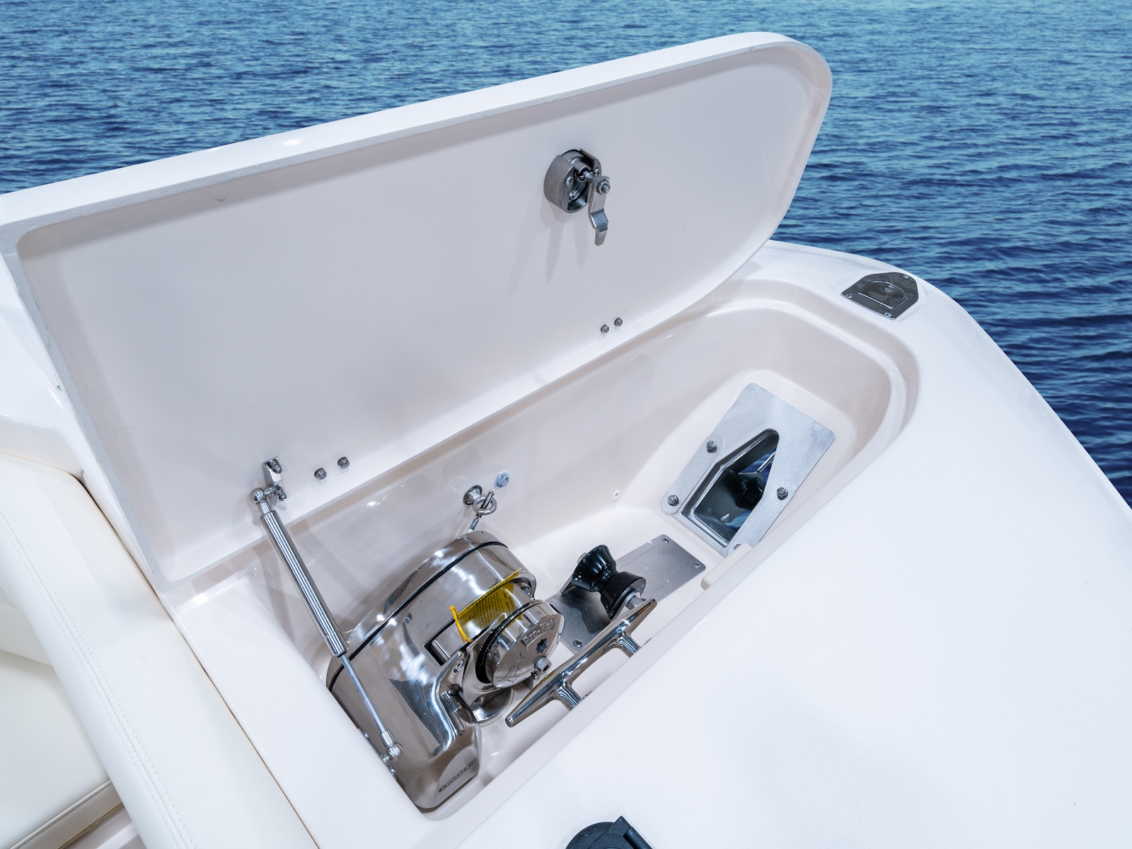 Drawer at helm | Forward anchor locker w/rode storage | Lockable starboard console compartment w/light