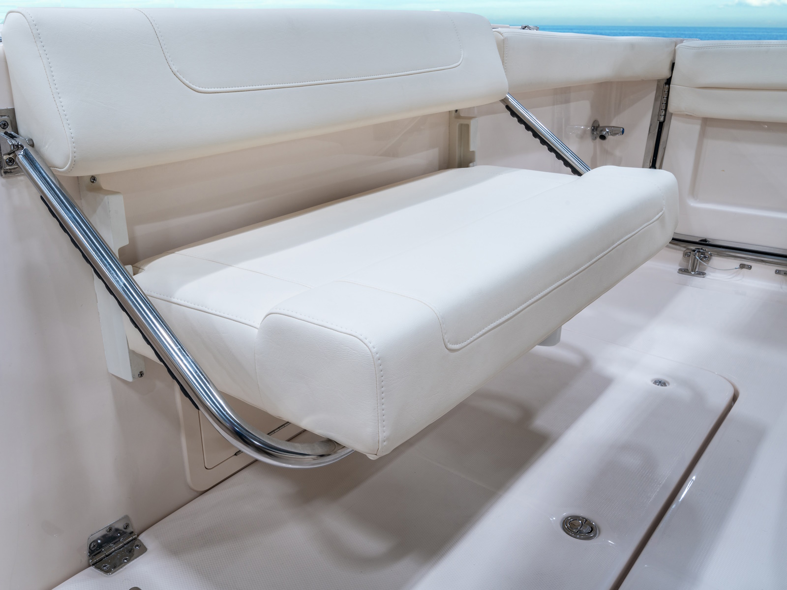 Electromechanically adjustable helm bench seat w/flip-up bolster | Poldaway aft bench seat w/cushion