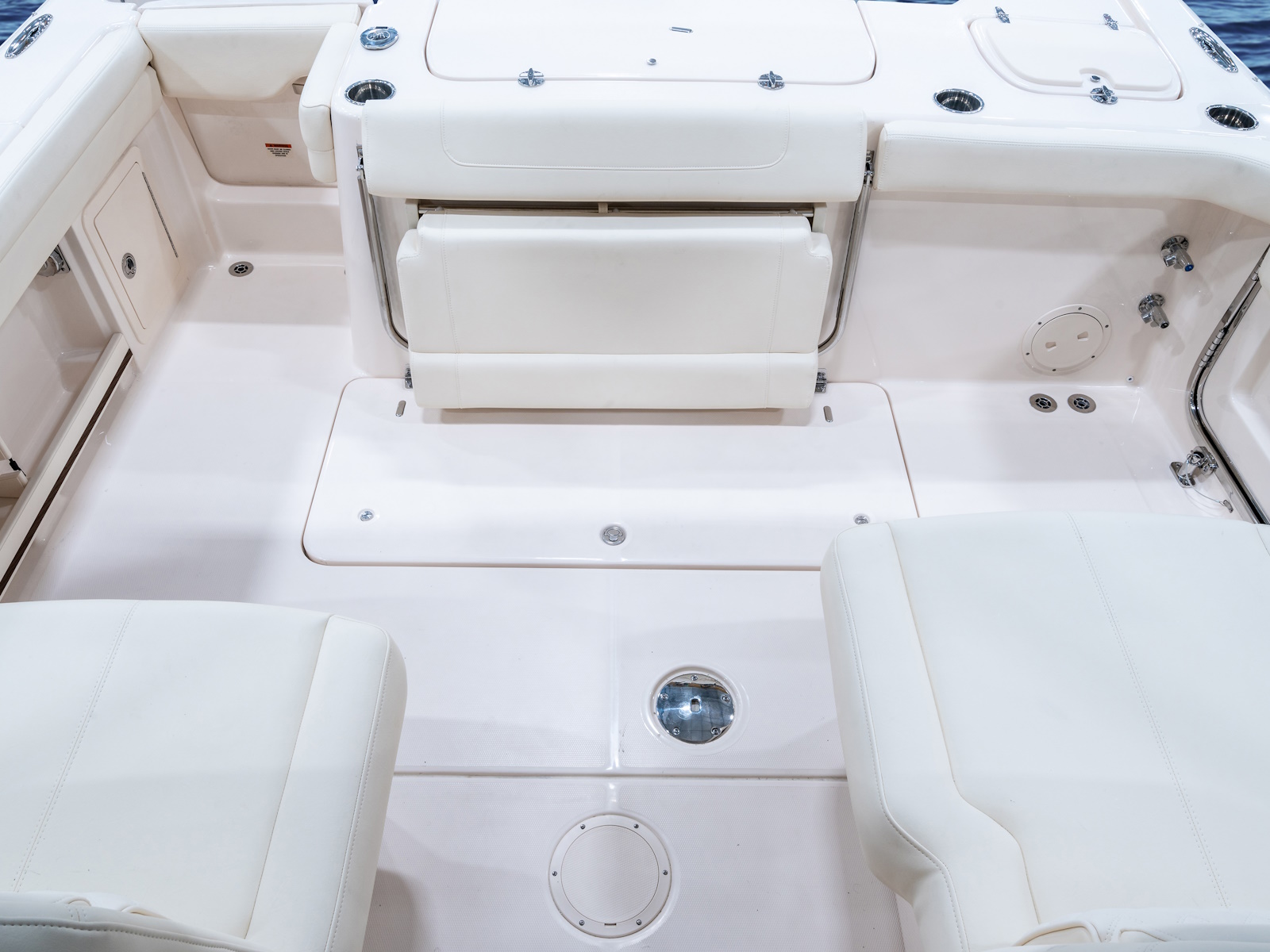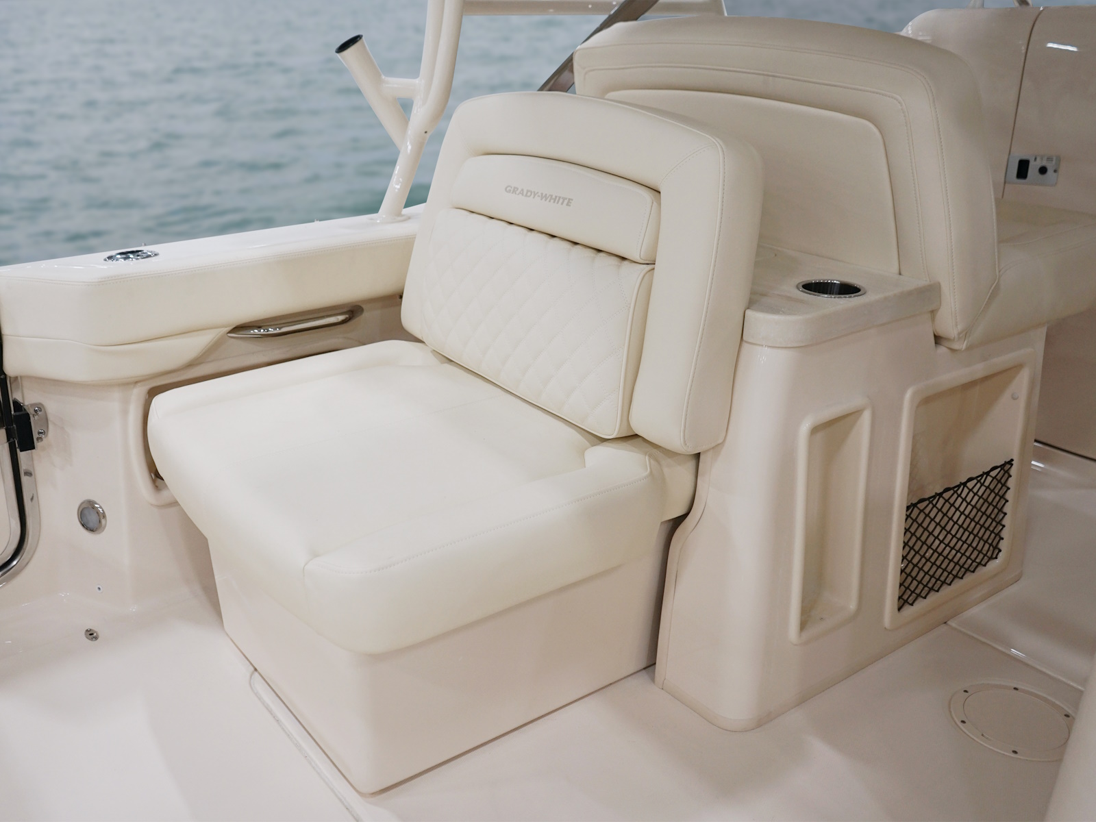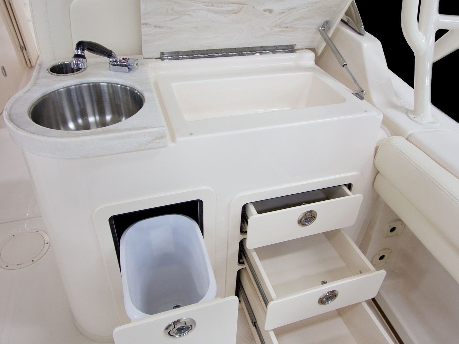 - Wet bar w/sink, storage drawers (3), trash bin & drink holders (2) (integrated with electromechanically adjustable helm seat)