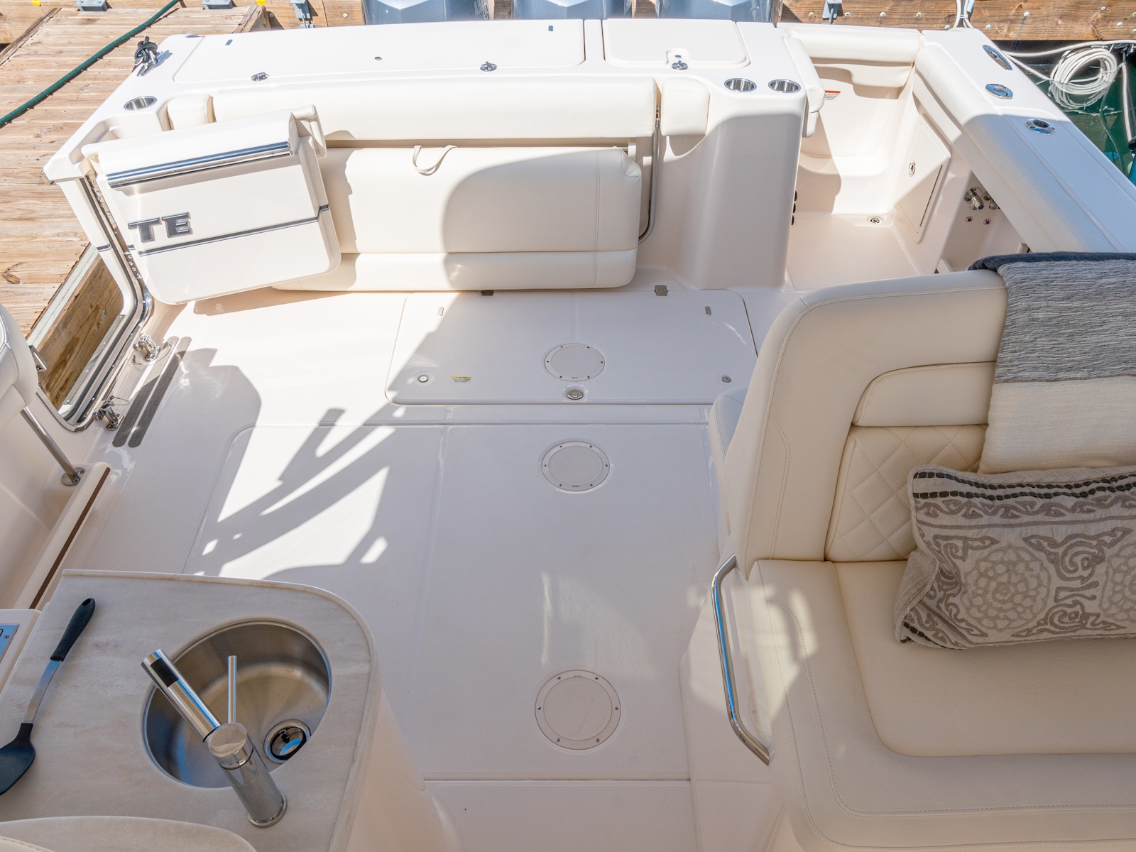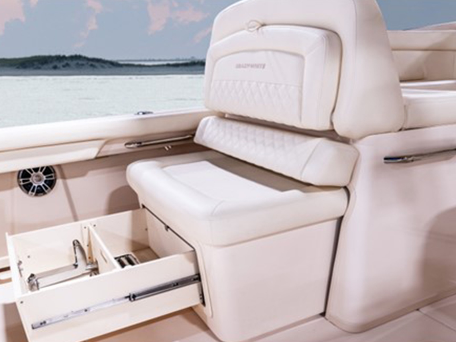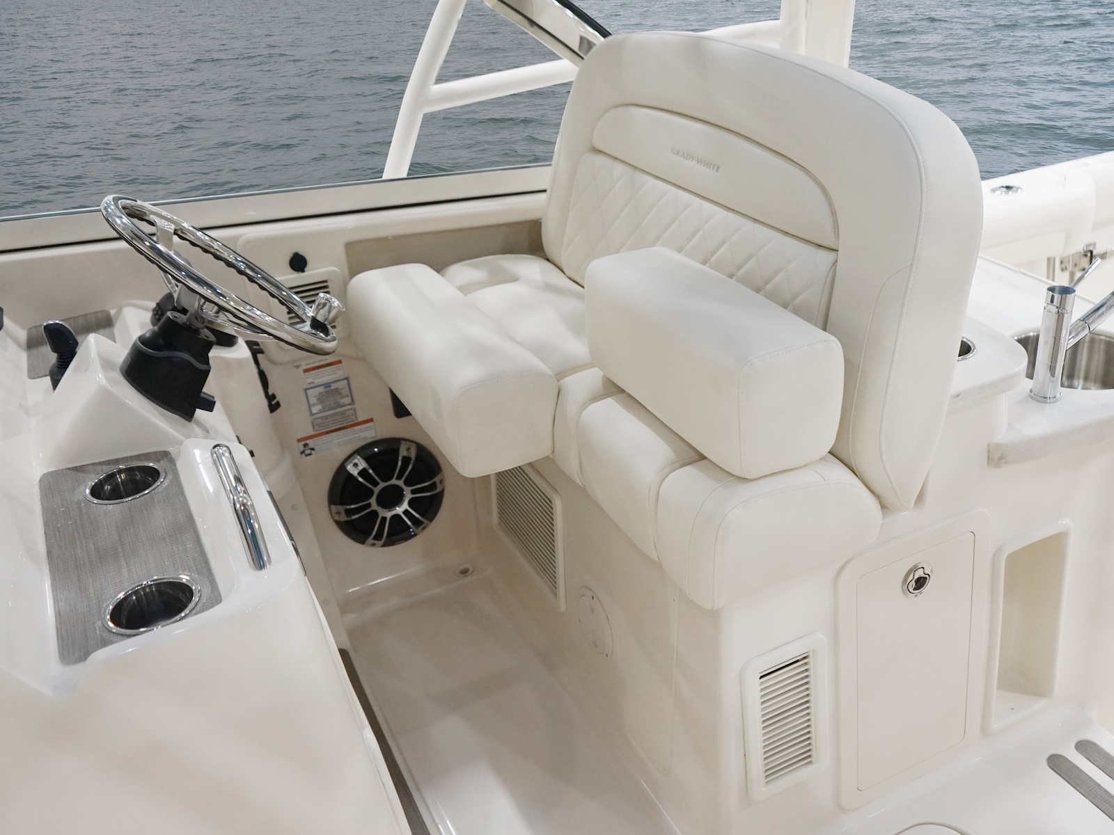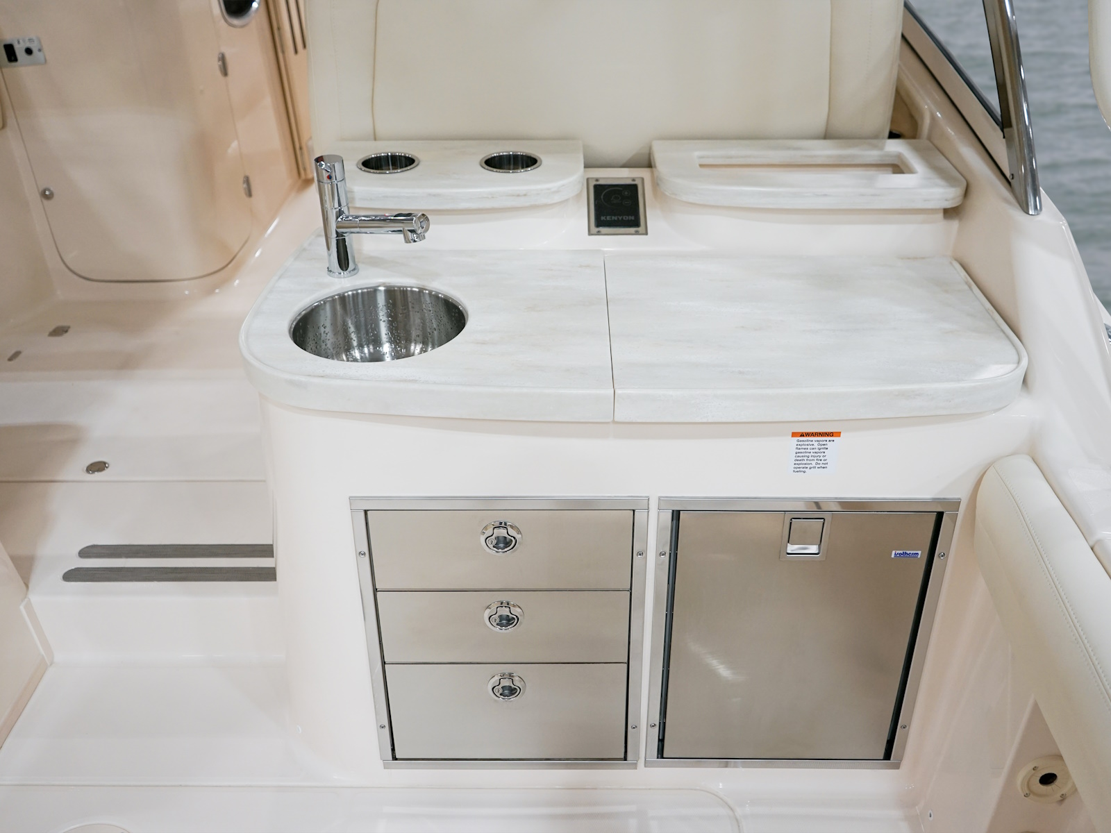 - Wet bar w/refrigerator, sink, storage drawers, trash bin & drink holders (2) (integrated with electromechanically adjustable helm seat)