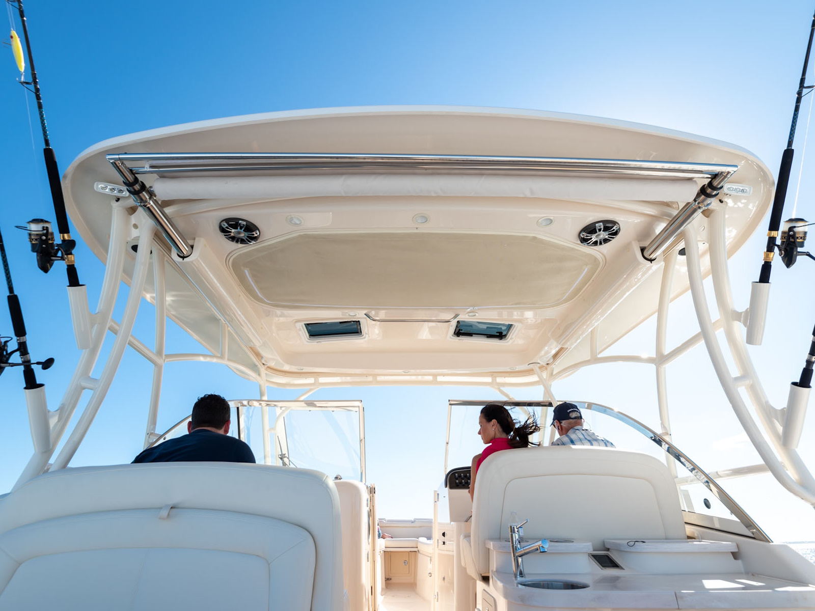 - Hardtop w/painted aluminum frame, grab rail, storage net, LED spreader lights, tri-colored (red, blue, white) LED recessed lights (8), hatches (2), side mounted rod holders (4), outrigger plates, SureShade® electrically retractable hardtop shade w/Sunbrella® canvas (oyster) & Clear2Sea™ front & side curtains (ivory)