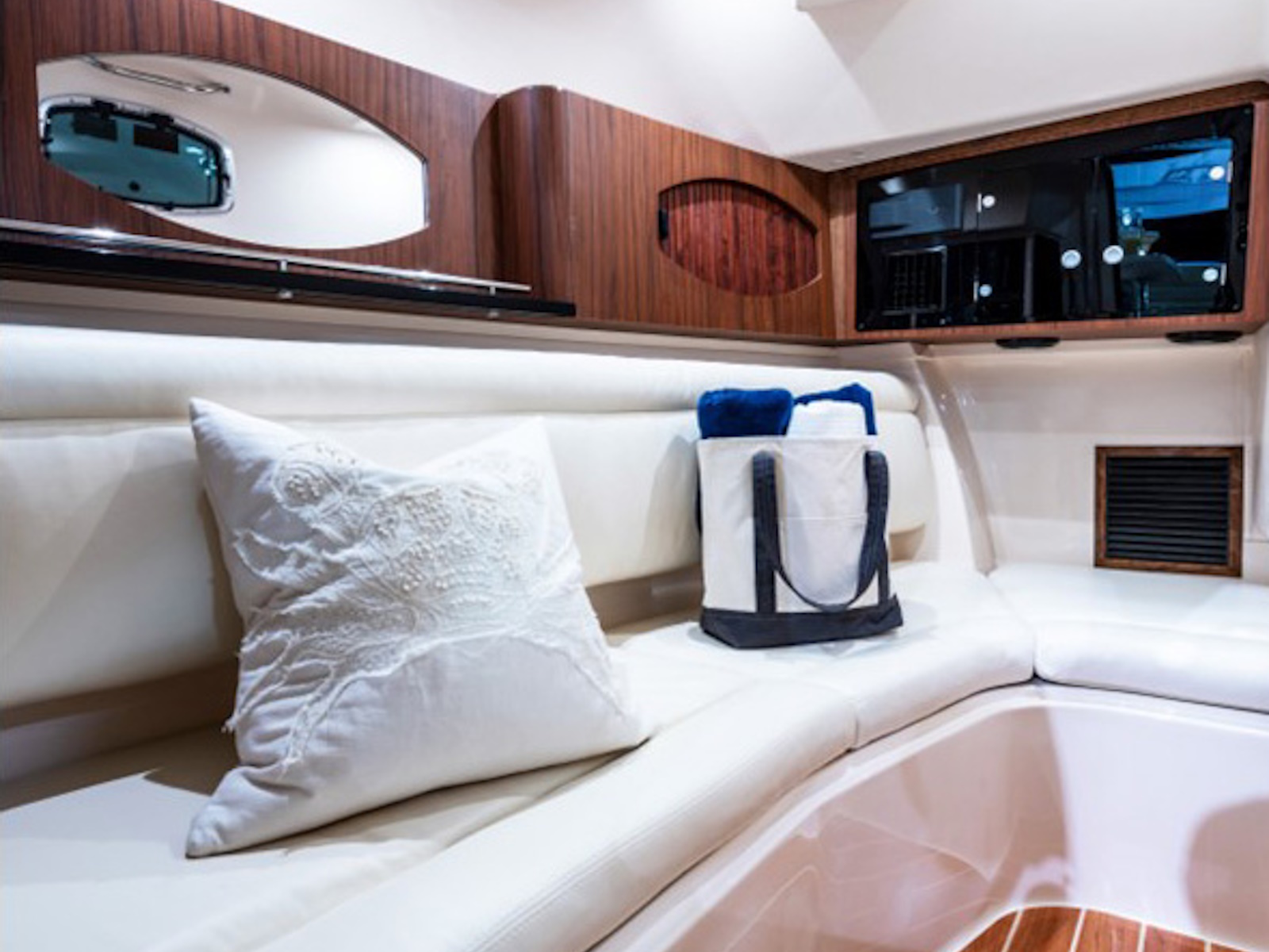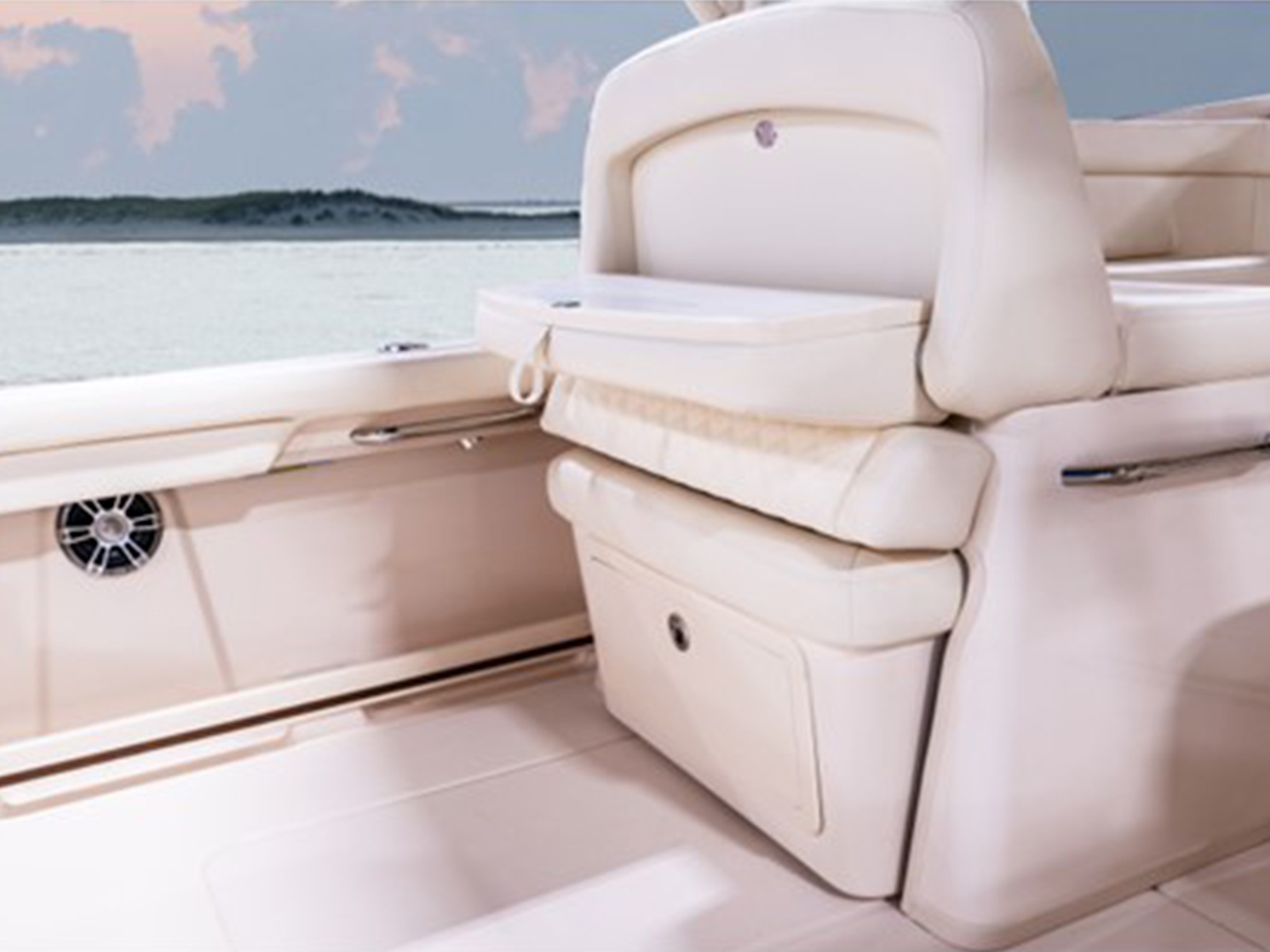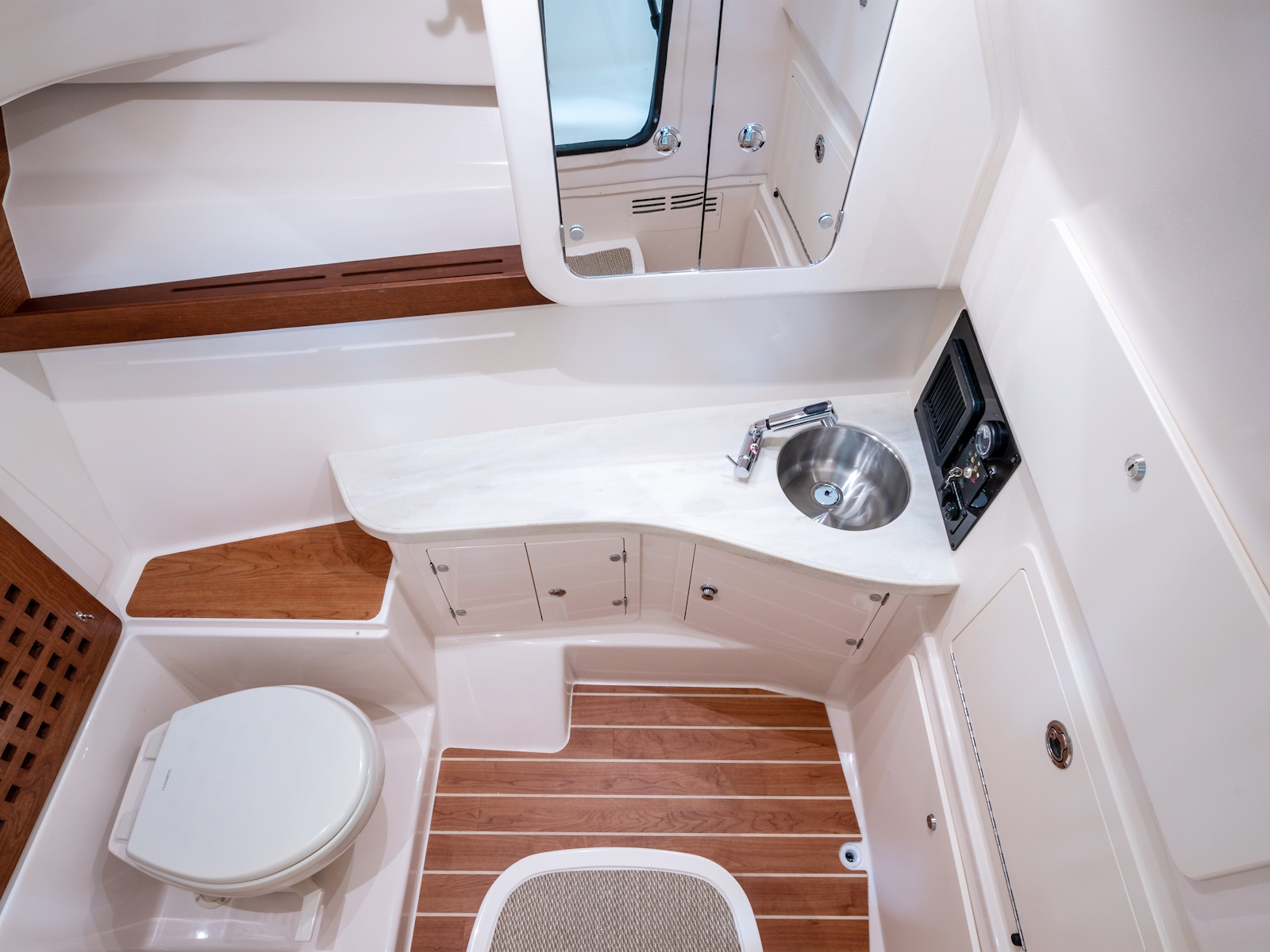 - Starboard console w/shower, sink, drawers, microwave, lighting, bulk storage, fold down seat & VacuFlush® head w/freshwater supply, 10-gallon (38 l) holding tank, overboard discharge & deck pump out