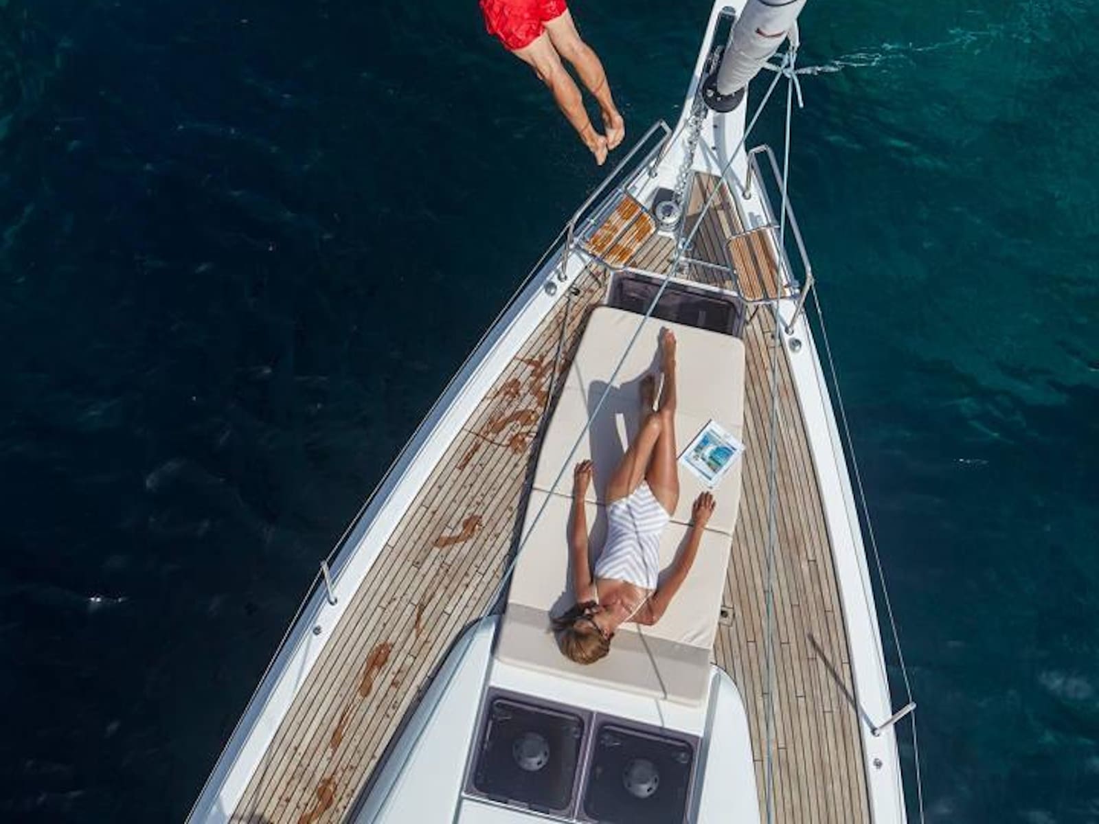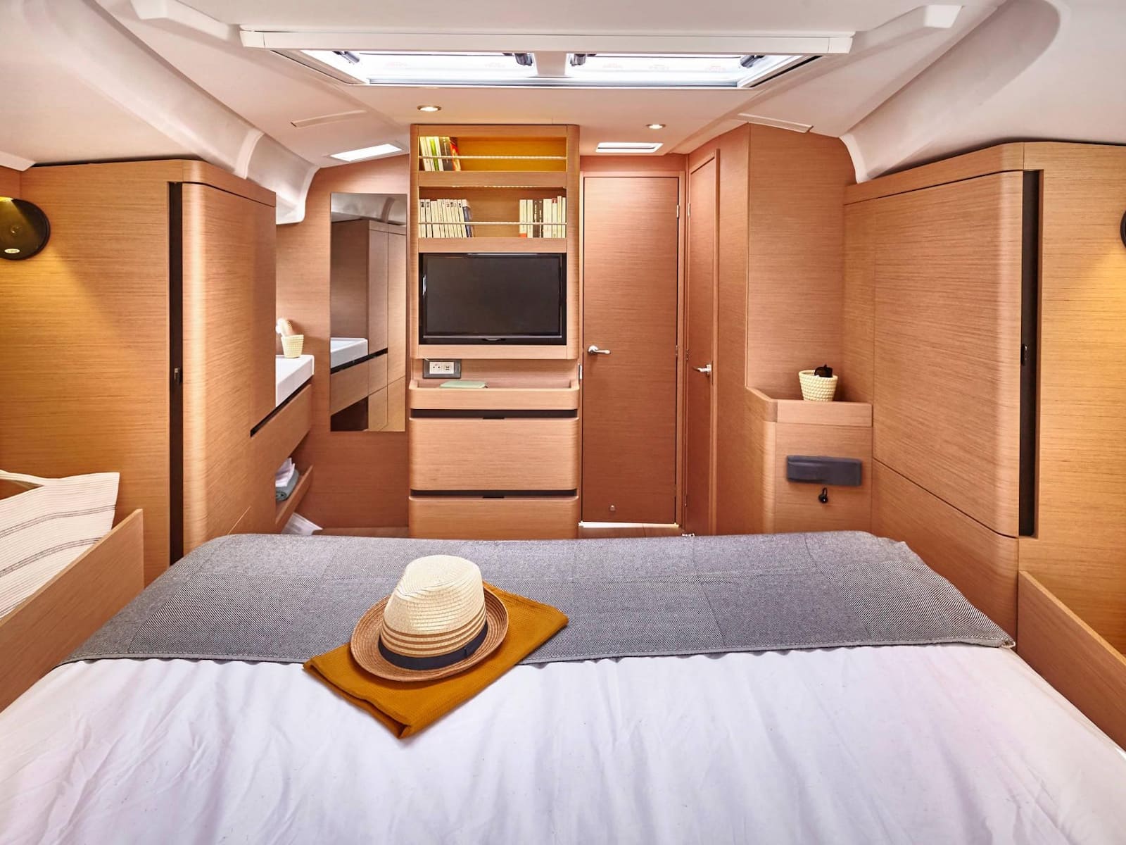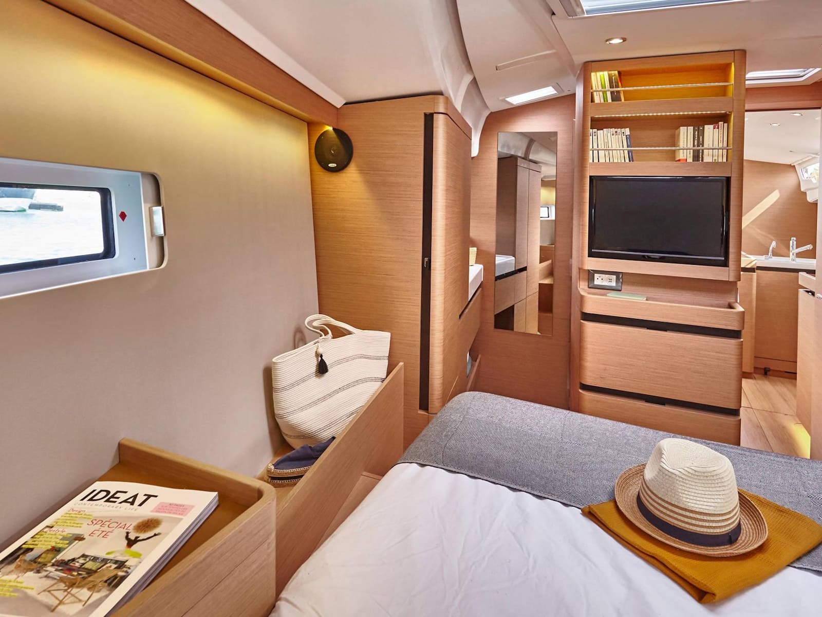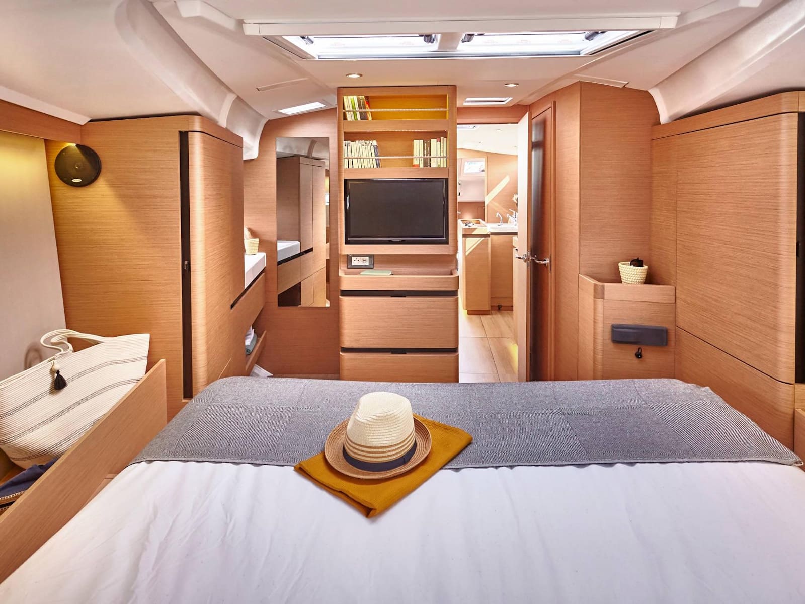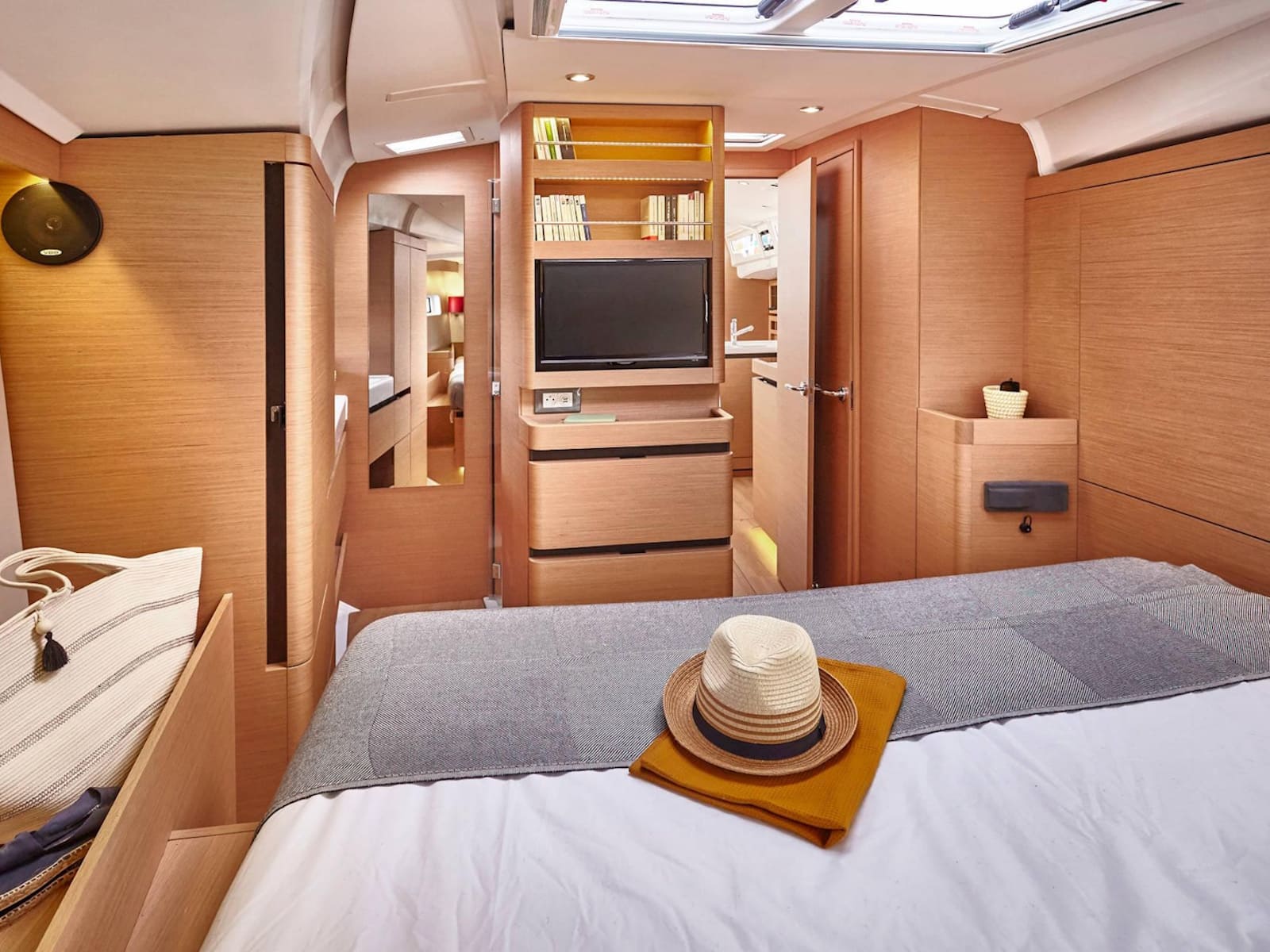 As with every Sun Odyssey, the cockpit ergonomics are second to none. Every sheet is cleverly led to the helm station, where the boat can be easily single or double-handed. The massive cockpit lounge is framed by the iconic walk-around decks, which make movement around the boat easier than ever before. However, the game-changer comes when the convertible coamings, the unfolding seat backs, are set up as beds. The entire aft eight feet of the boat transforms into a cushioned sunbathing deck!