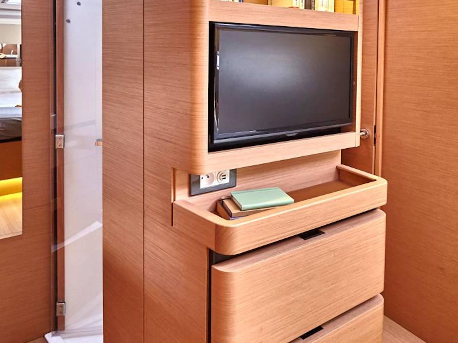 The open concept interior is bathed in light, as the main salon features many rows of windows and hatches. The central U-shaped galley is optimally placed for comfort while underway, as well as serving meals in the salon. In the 490, the nav station is particularly emphasized, as there is an aft-facing bench added to it, elevating this feature into a coffee nook or home office. However, it's the forward stateroom where this boat really sets itself apart. The square queen bed has plenty of space to walk around on all sides, and the large central armoire is perfect for mounting a television for viewing in bed. The gorgeous shower stall is placed on centerline, allowing for 6'6” headroom; a luxury usually only found on much larger boats.