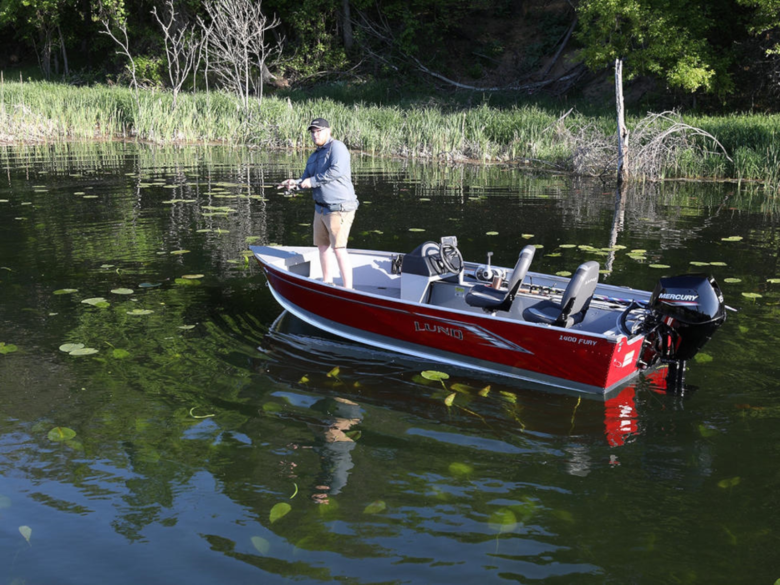 The affordable Lund 1400 Fury SS (side console) aluminum fishing boat features a convenient side console dual cockpit-side rod storage aerated livewell and a large bow casting deck. The 1400 Fury SS provides the ultimate convenience and power in a smaller sized 14 feet 9 inch side console fishing boat. The Fury is built with Lunds traditional quality and fishability.