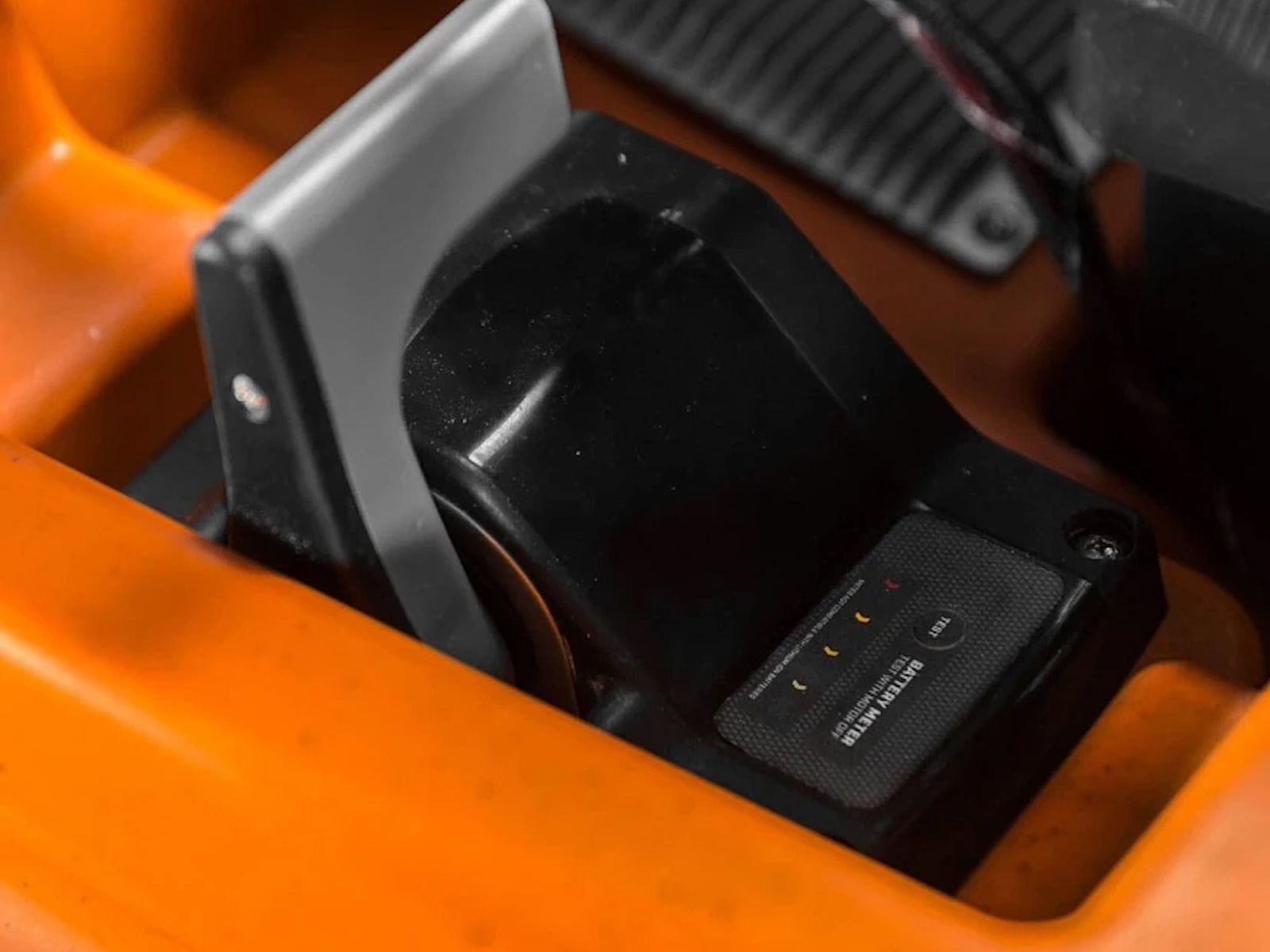 - Powerboat style throttle for intuitive forward and reverse. Built-in battery meter