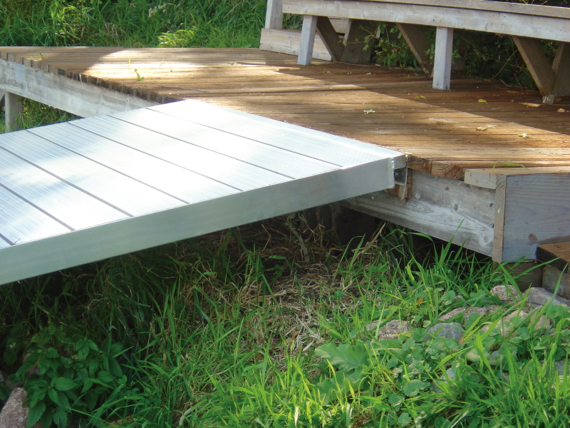 Available 4’x8′, 5’x8′ and 6’x8′ sections are connected end to end and side to side by Pier Pleasure’s unique interlocking hinge. The first sections can form a ramp up or down allowing the dock system to adapt to any shoreline.