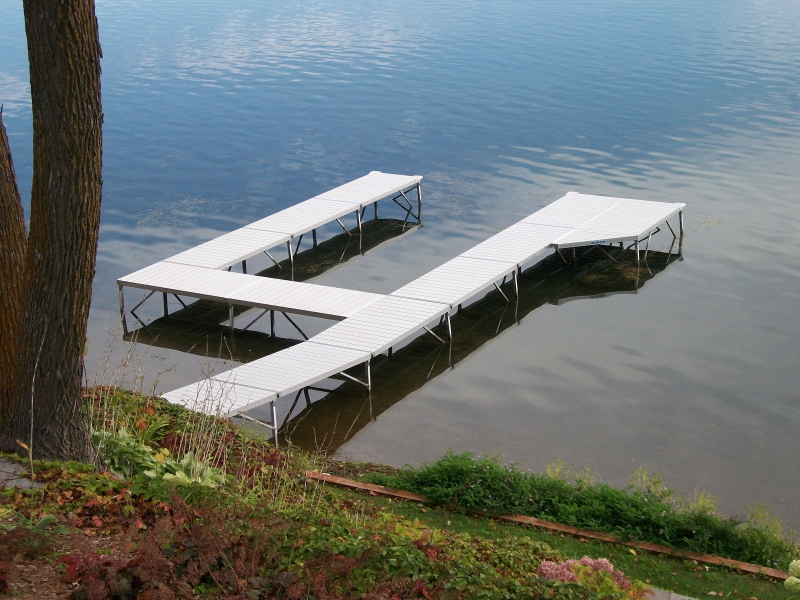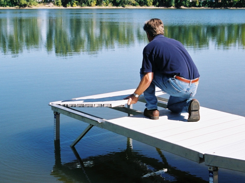 Available 4’x8′, 5’x8′ and 6’x8′ sections are connected end to end and side to side by Pier Pleasure’s unique interlocking hinge. The first sections can form a ramp up or down allowing the dock system to adapt to any shoreline.