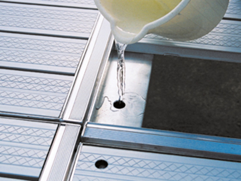 Each dock section is designed to hold 60 lbs. of water in its 100% welded frame. This feature adds stability during normal use and helps to hold the dock system in place during storms, high winds and wave action. Water is drained by removing the plugs under each section before removal in the fall. This is a great feature!