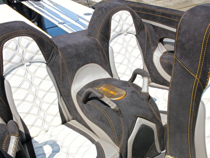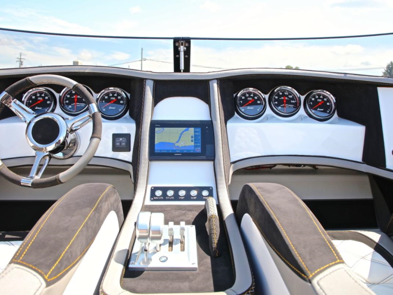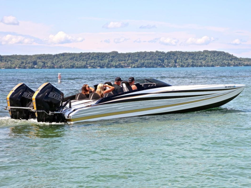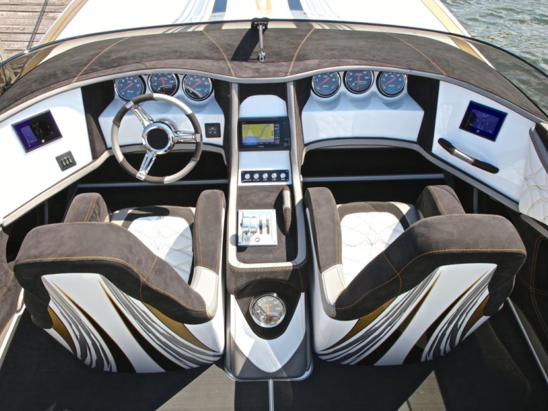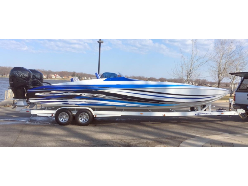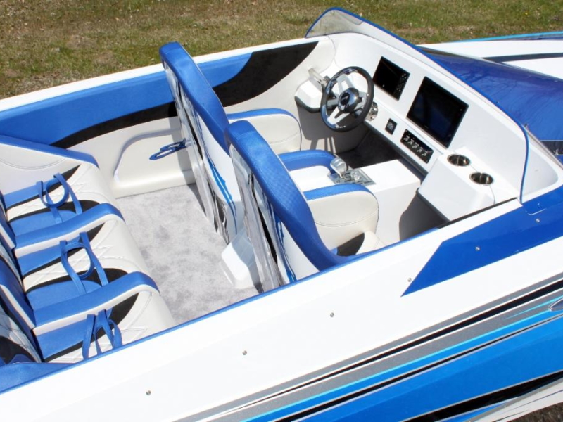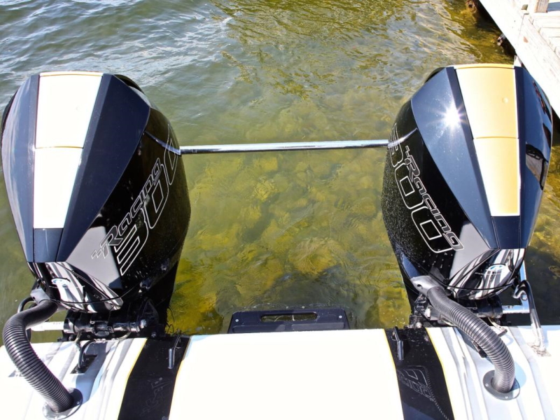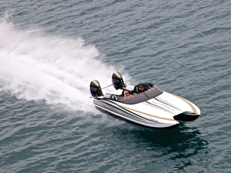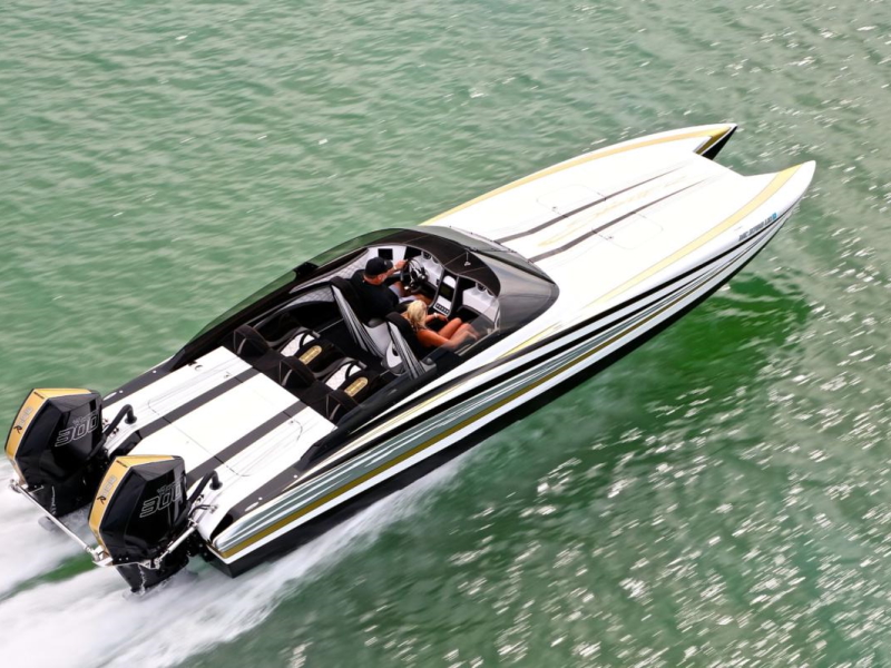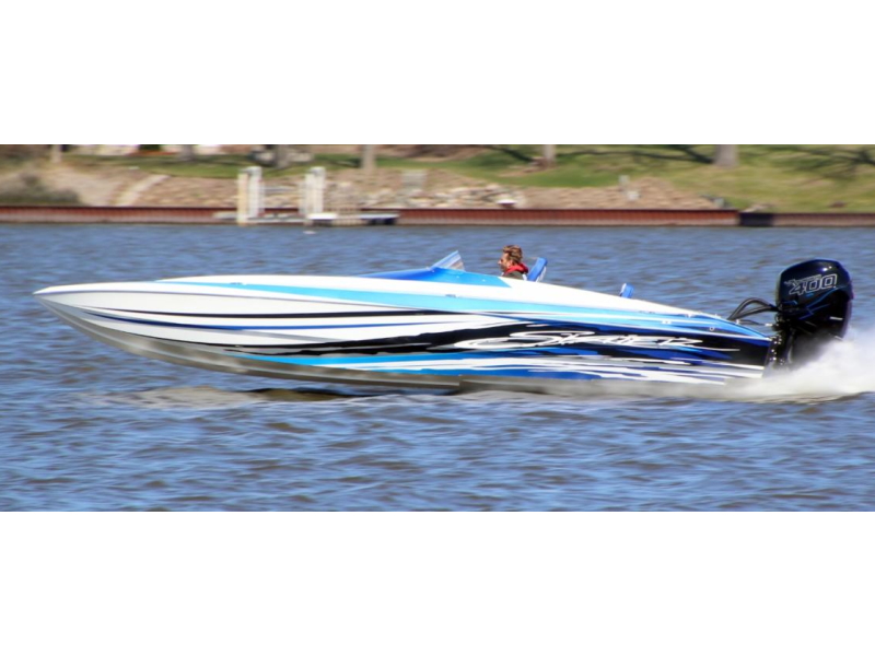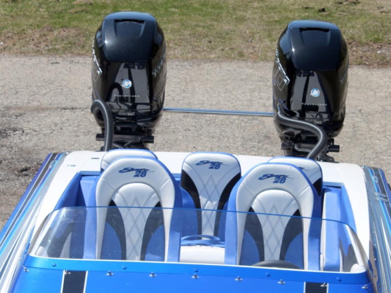 The 28 Skater has many times been described as a Porsche on the water. It’s light weight, nimble handling, combined with real offshore capabilities make it one of the most sought after outboard performance catamarans of all time. The cost effective standard deck provides seating for 5, with a sleek fairing on the deck, and a large rear hatch for accessing storage in the rear. An optional 6” molded-in windshield is available for those wanting to get out of the wind at 110+ mph speeds. Fuel tanks holding 70 gallons per side give this efficient hull a range of almost 400 miles at cruise speeds of 80+ mph with either the new 300R, or 400R Mercury Racing outboards. This outboard catamaran continues to be the performance leader in its class.