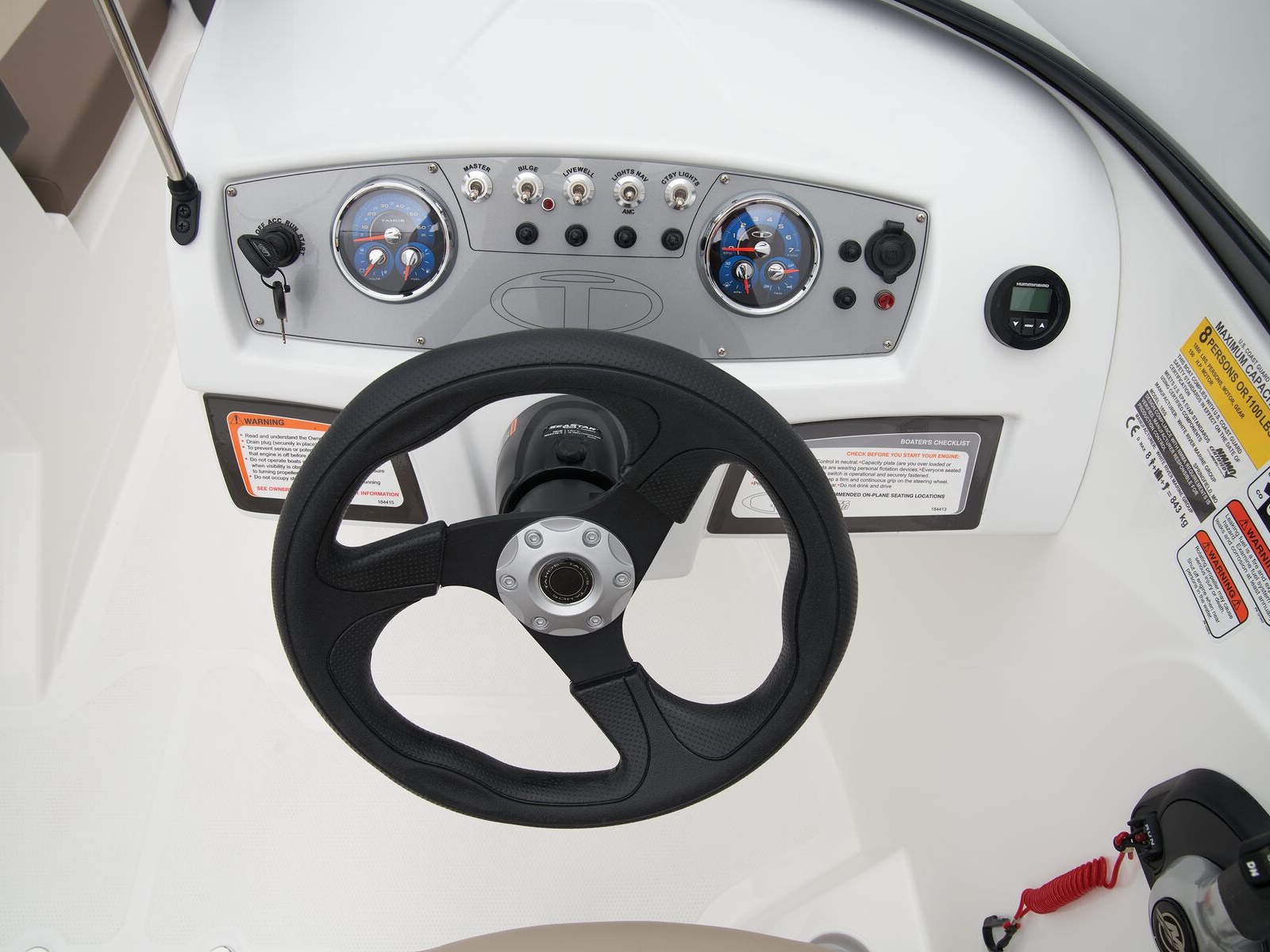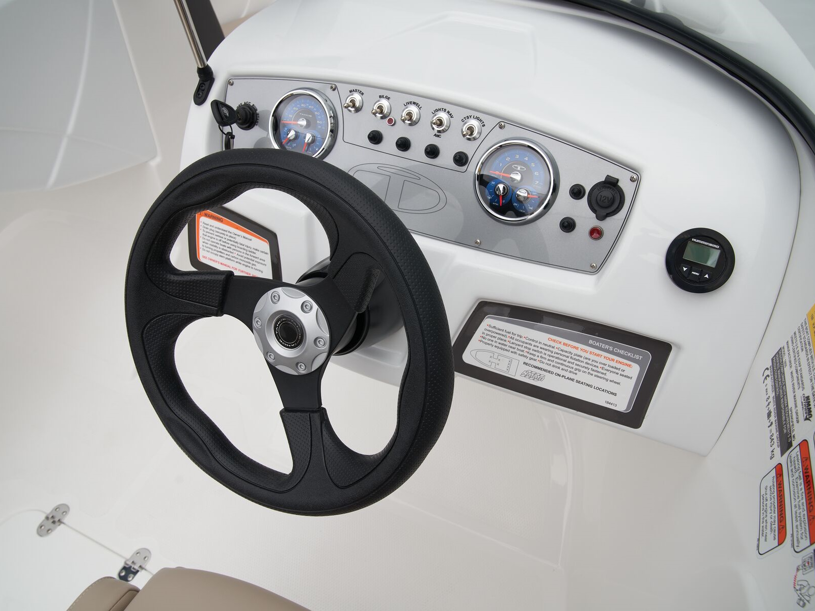 - Helm console w/speedometer, tachometer, fuel gauge, trim gauge, water pressure gauge & voltmeter