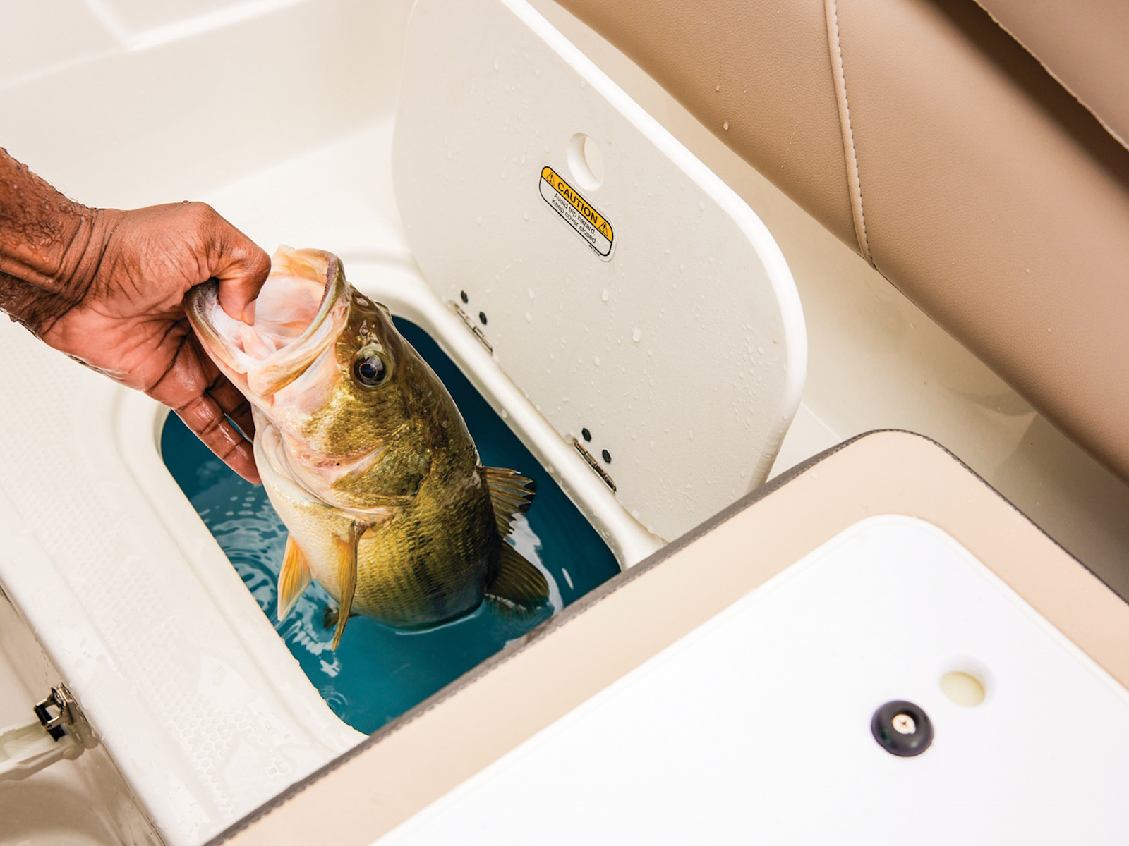 - 10-gal. (37.85 L) plumbed, insulated & aerated livewell w/500 GPH (1,892.71 LPH) pump, adjustable spray head & overflow drain