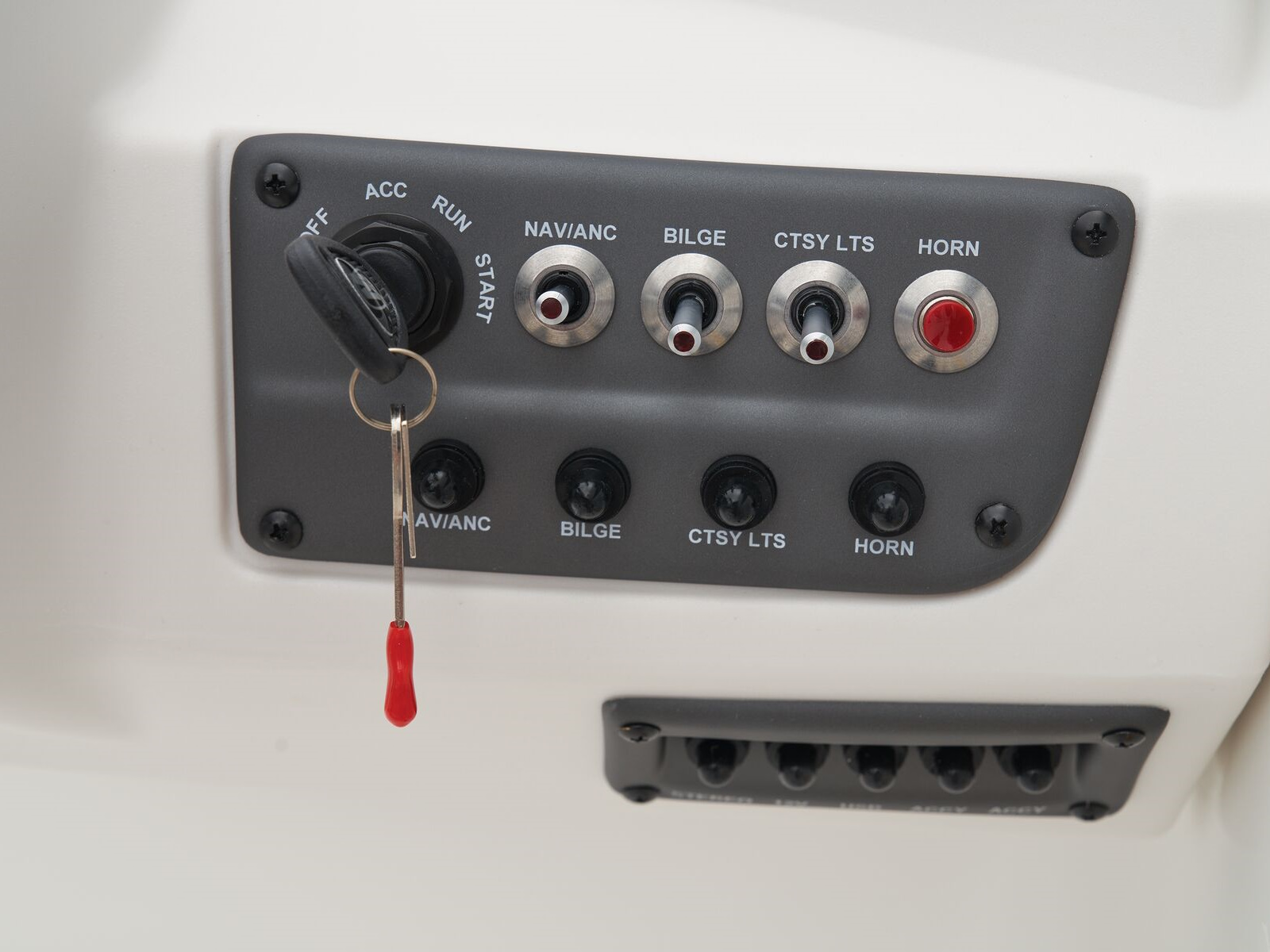 - Ice White console w/acrylic windscreen & soft-lined storage trays w/phone connectors