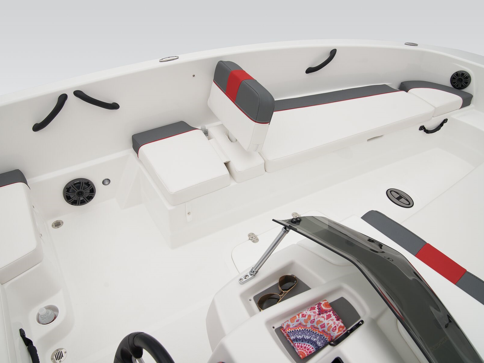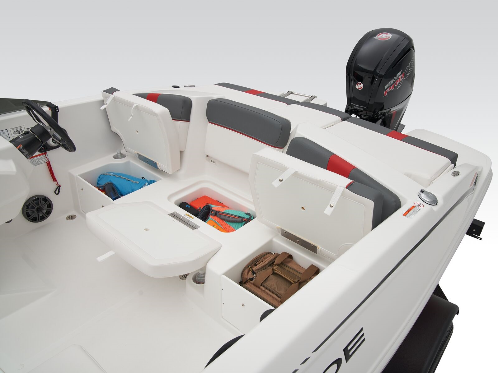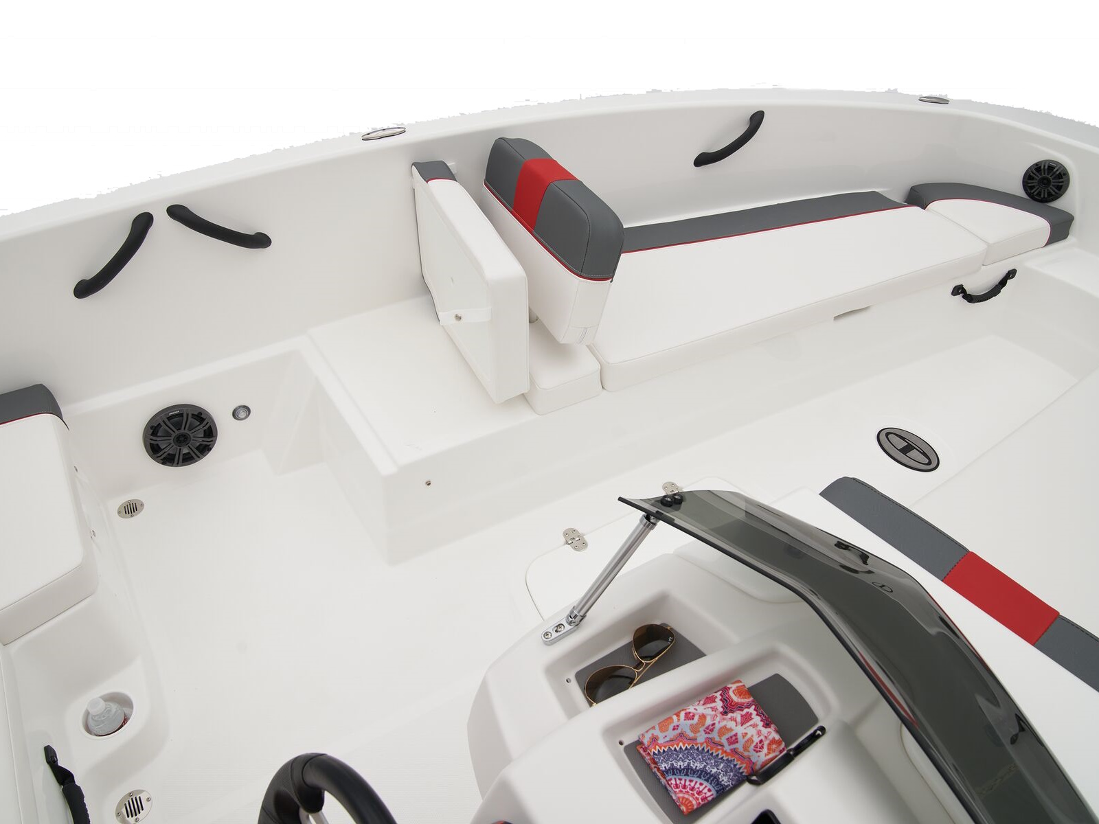 - Bow seating w/molded-in storage & reversible backrest for use as spotter seat