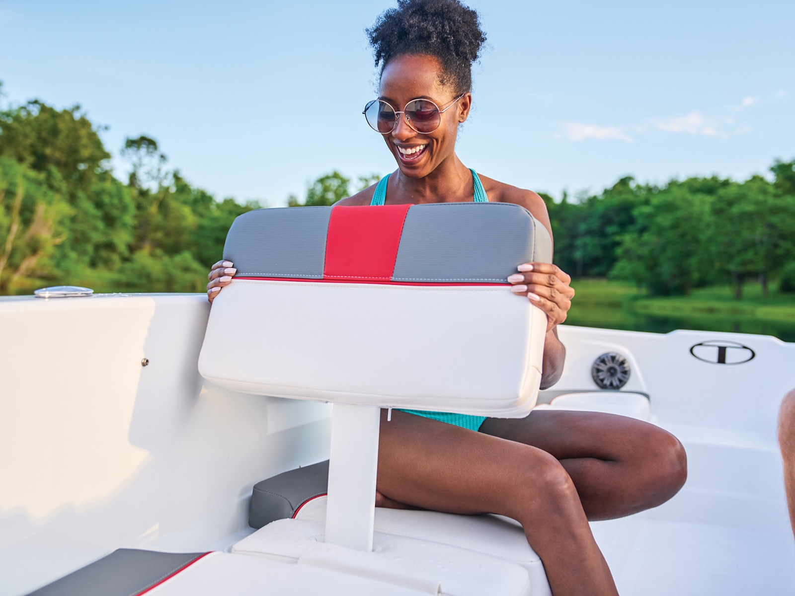 - Hinged mid-cushion for aft sunpad & fold-down seatback allows easy entry w/out stepping on upholstery