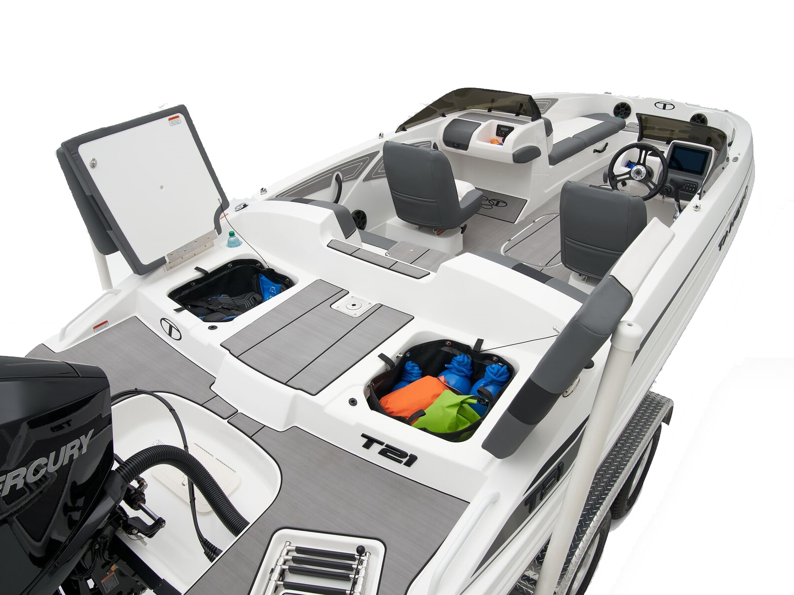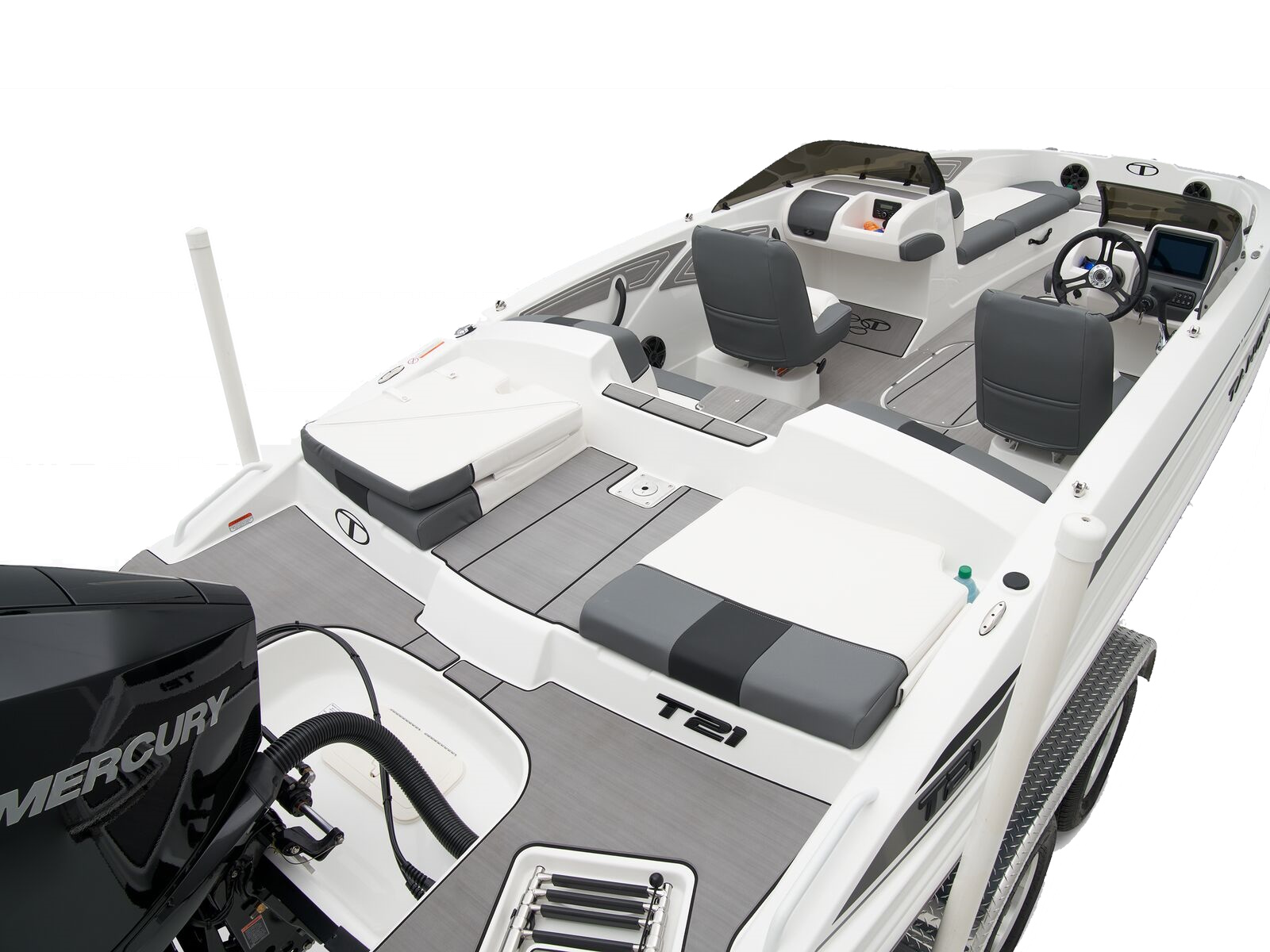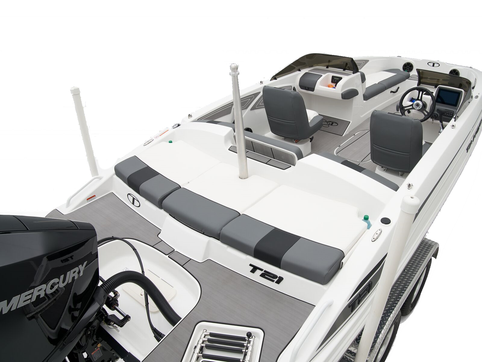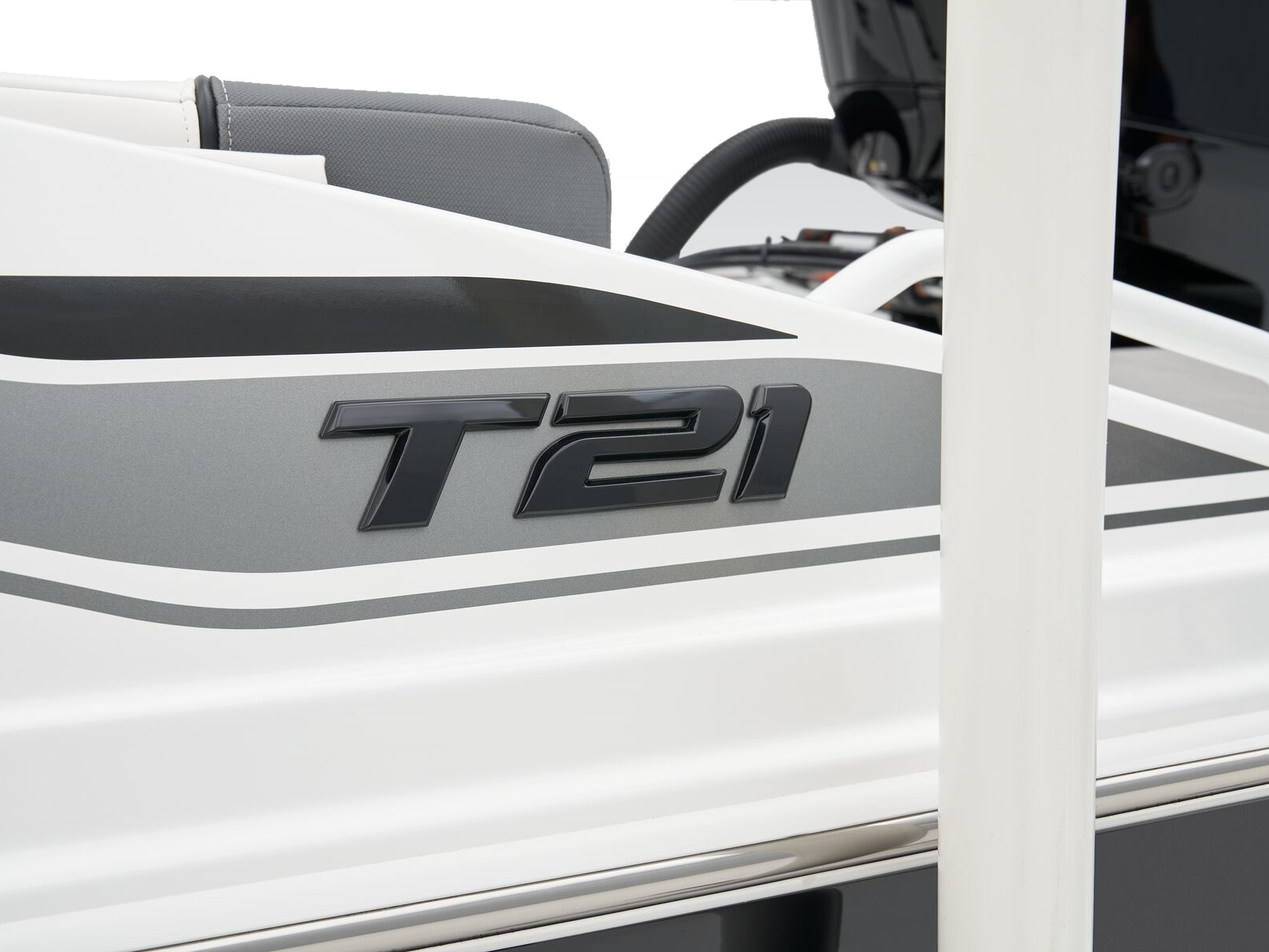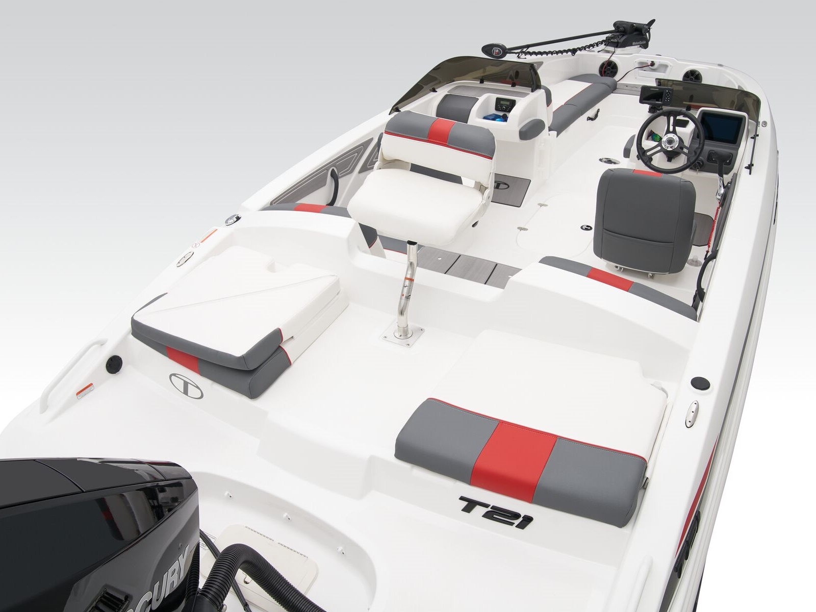Up to 11 passengers can feel the thrill thanks to the T21’s POWERGLIDE® hull with HYDROSTEP strakes that enhance stability and overall performance. Raise the standard removable ski-tow pylon to take on your exciting watersports. The console’s 8” touch screen with digital switches updates you with information such as your motor’s vitals, the water’s depth, and your current speed. Play DJ with the Bluetooth®-compatible Kicker® stereo.