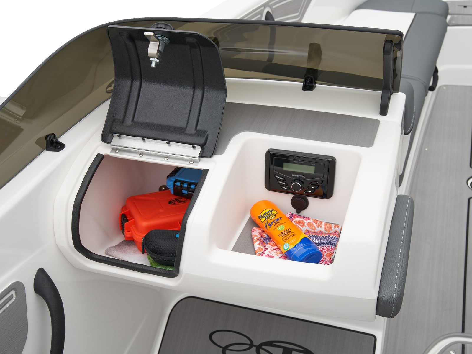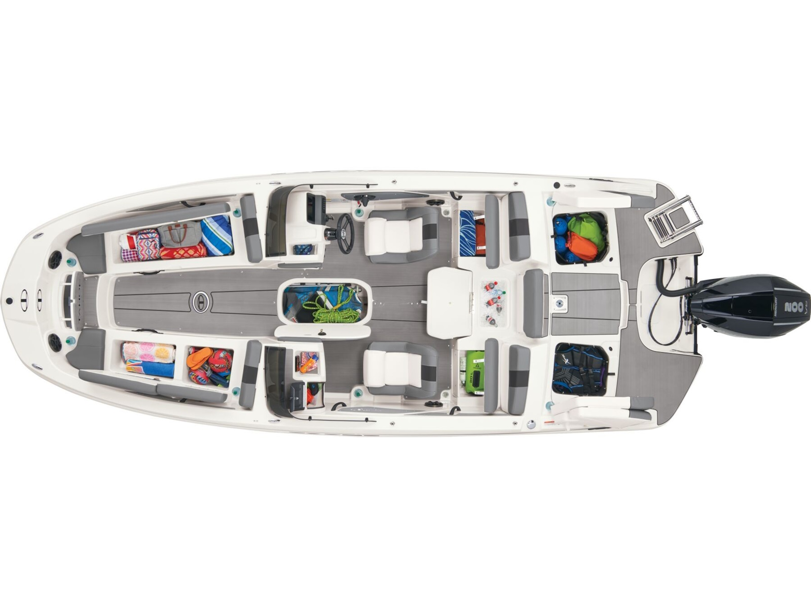 - Bow seating w/molded-in storage & insulated cooler compartment w/overboard drain