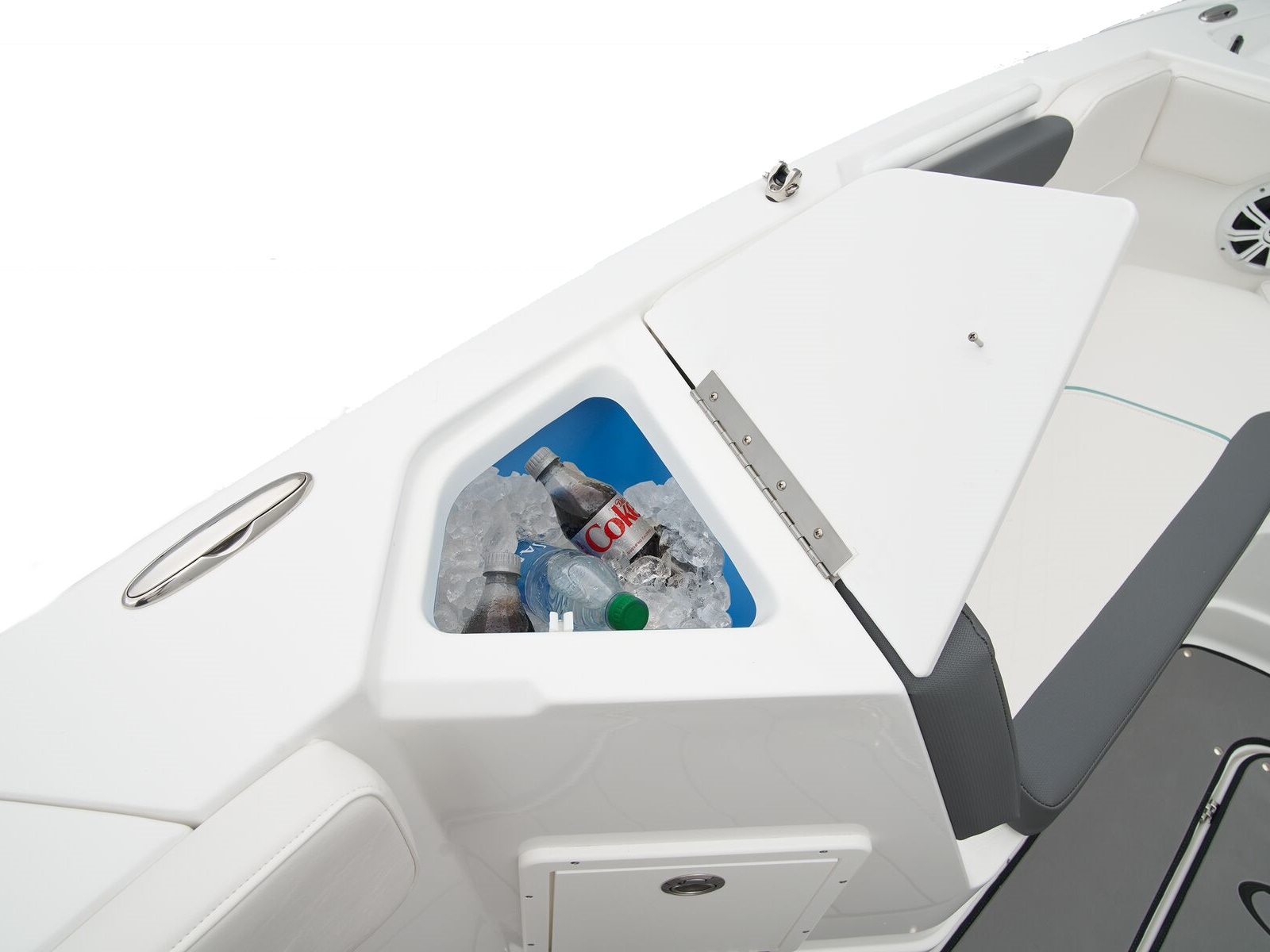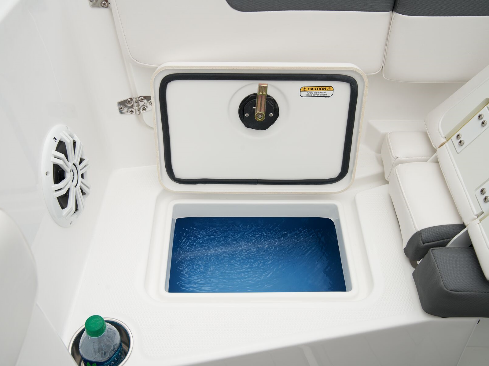 - Midship port 18-qt. (17.03 L) integrated cooler w/storage compartment below w/overboard drainage