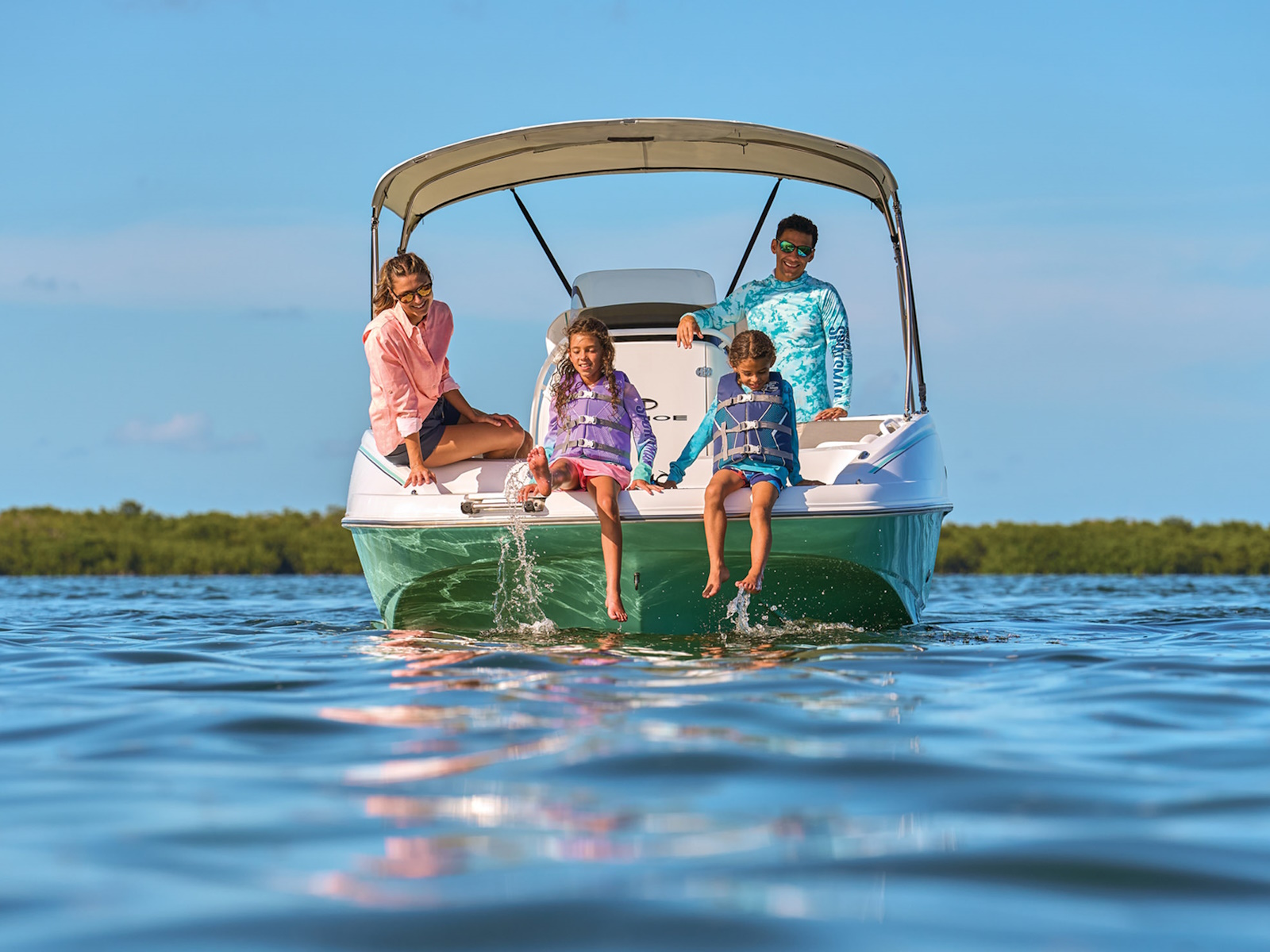 - NEW Bimini top w/aluminum frame & boot—Charcoal (Trigger Gray hull), Light Gray (Mint hull), Harbor Blue (Harbor Blue hull) or Sand (White hull)