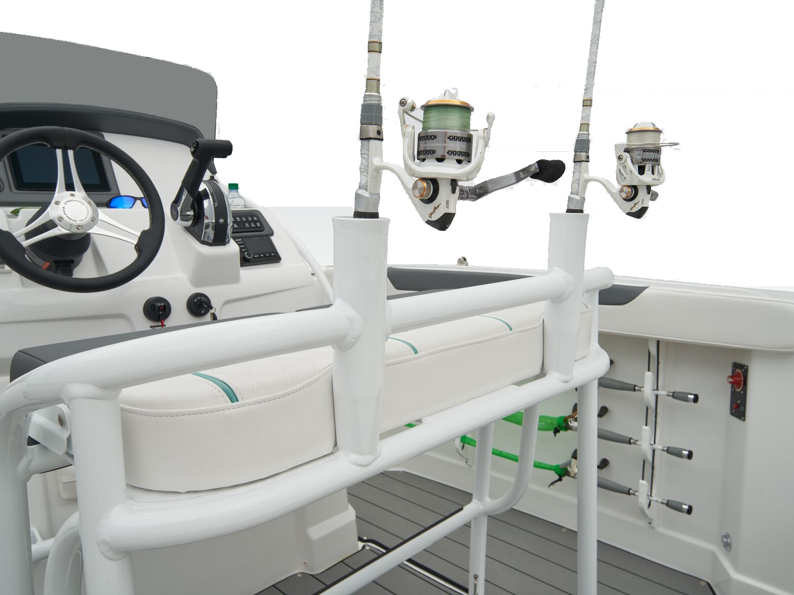 Its centralized helm boasts an 8" touch screen, a digital switch panel, and hydraulic steering. It's placed before a versatile leaning post with flip-up bolsters and a removable backrest that's hiding fishing rod holders. You'll also find under-gunnel rod holders that can carry up to 6 combos. Speaking of fishing, this boat has plenty to offer anglers, such as two 84-qt. insulated compartments for fish boxes and coolers, a 17-gal. aerated livewell, and an optional fishing package that adds plenty more exciting features.