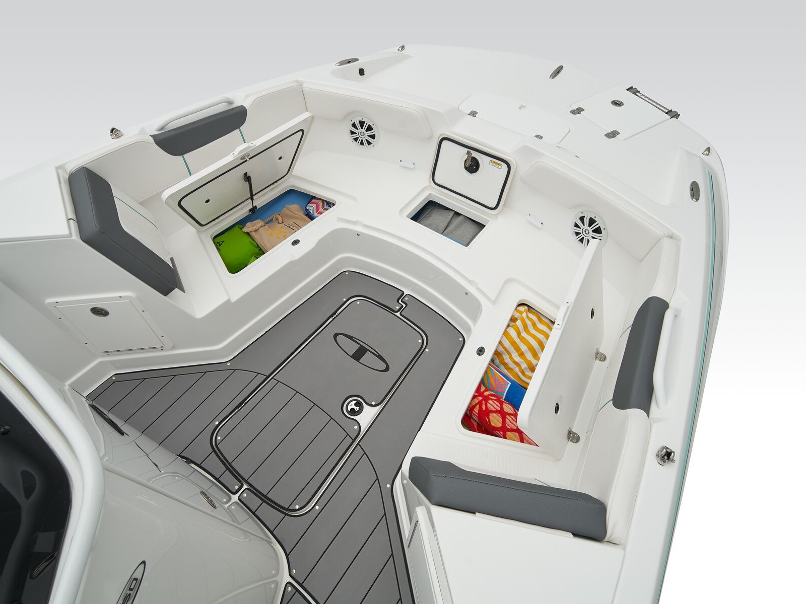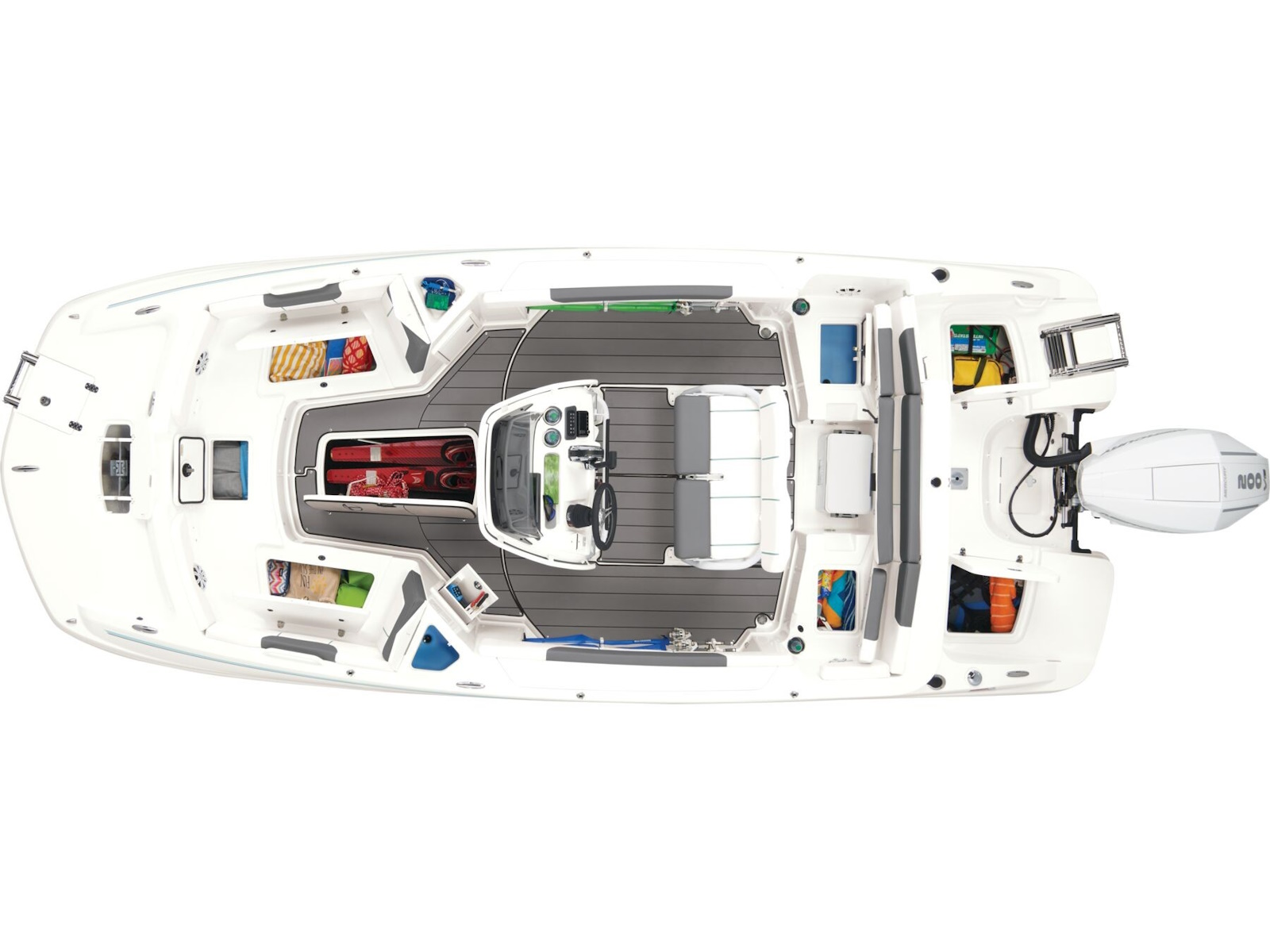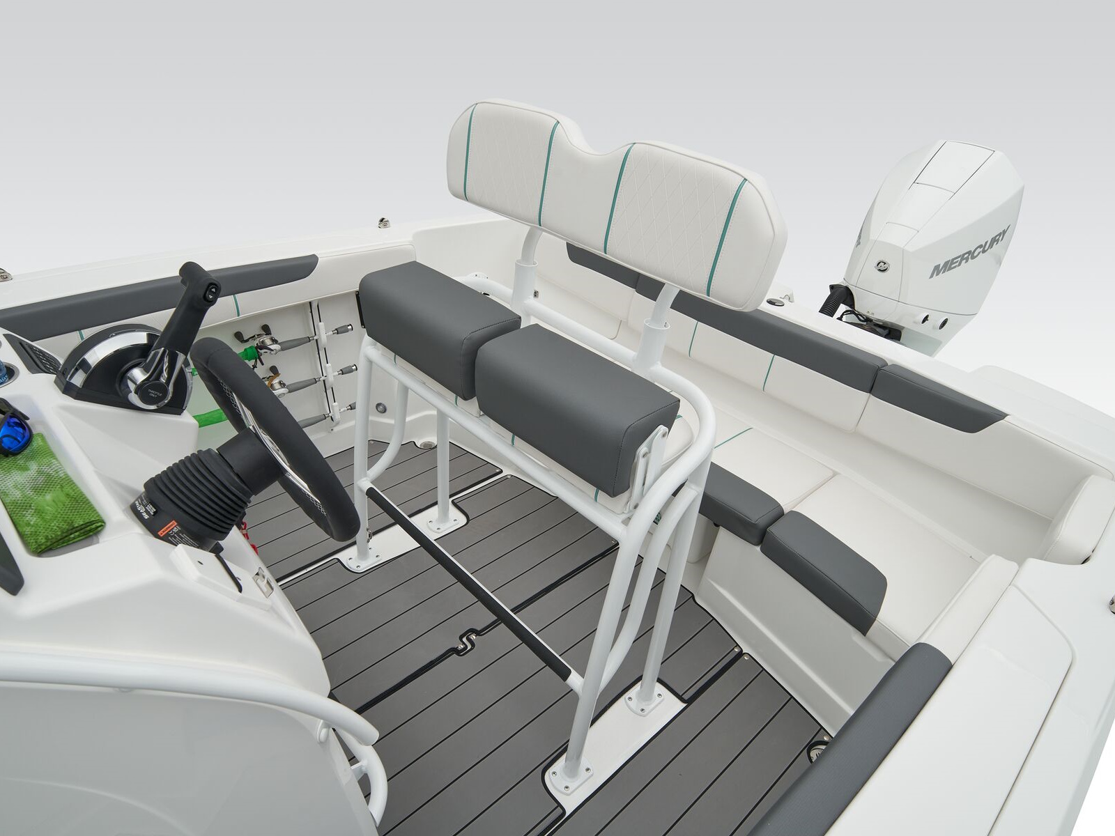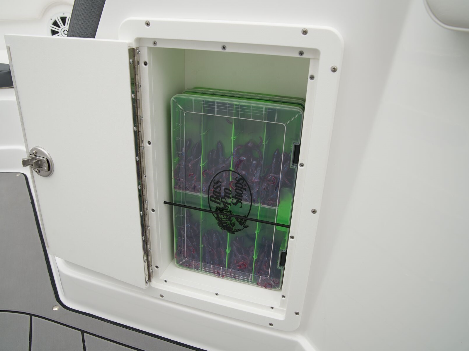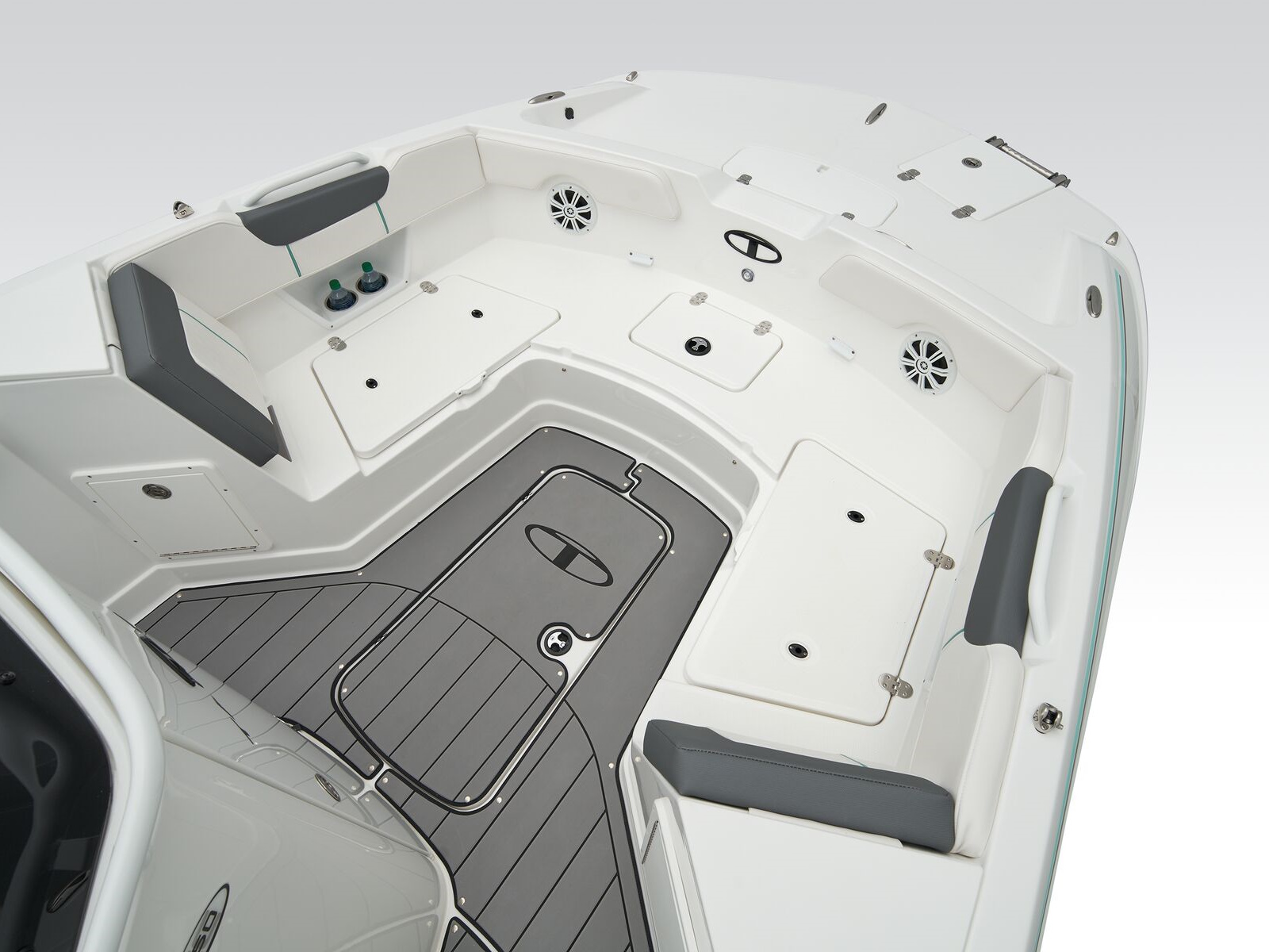 Its centralized helm boasts an 8" touch screen, a digital switch panel, and hydraulic steering. It's placed before a versatile leaning post with flip-up bolsters and a removable backrest that's hiding fishing rod holders. You'll also find under-gunnel rod holders that can carry up to 6 combos. Speaking of fishing, this boat has plenty to offer anglers, such as two 84-qt. insulated compartments for fish boxes and coolers, a 17-gal. aerated livewell, and an optional fishing package that adds plenty more exciting features.
