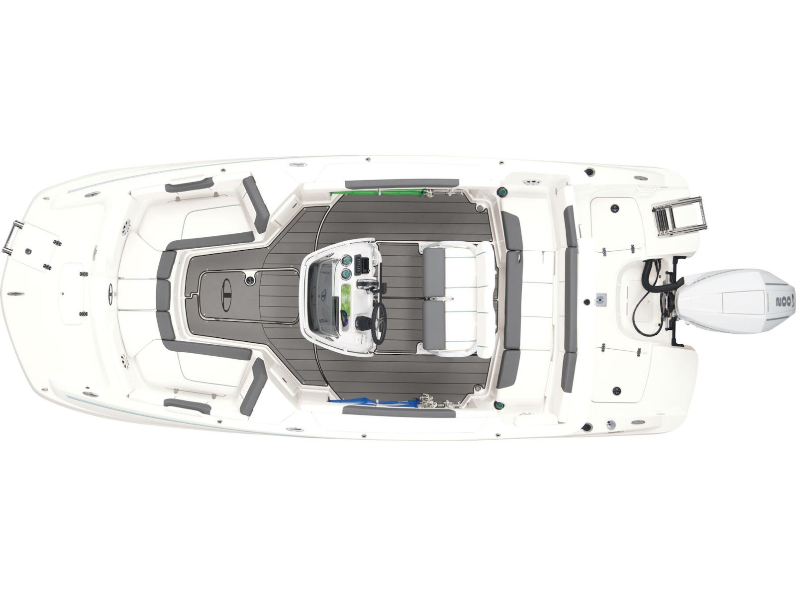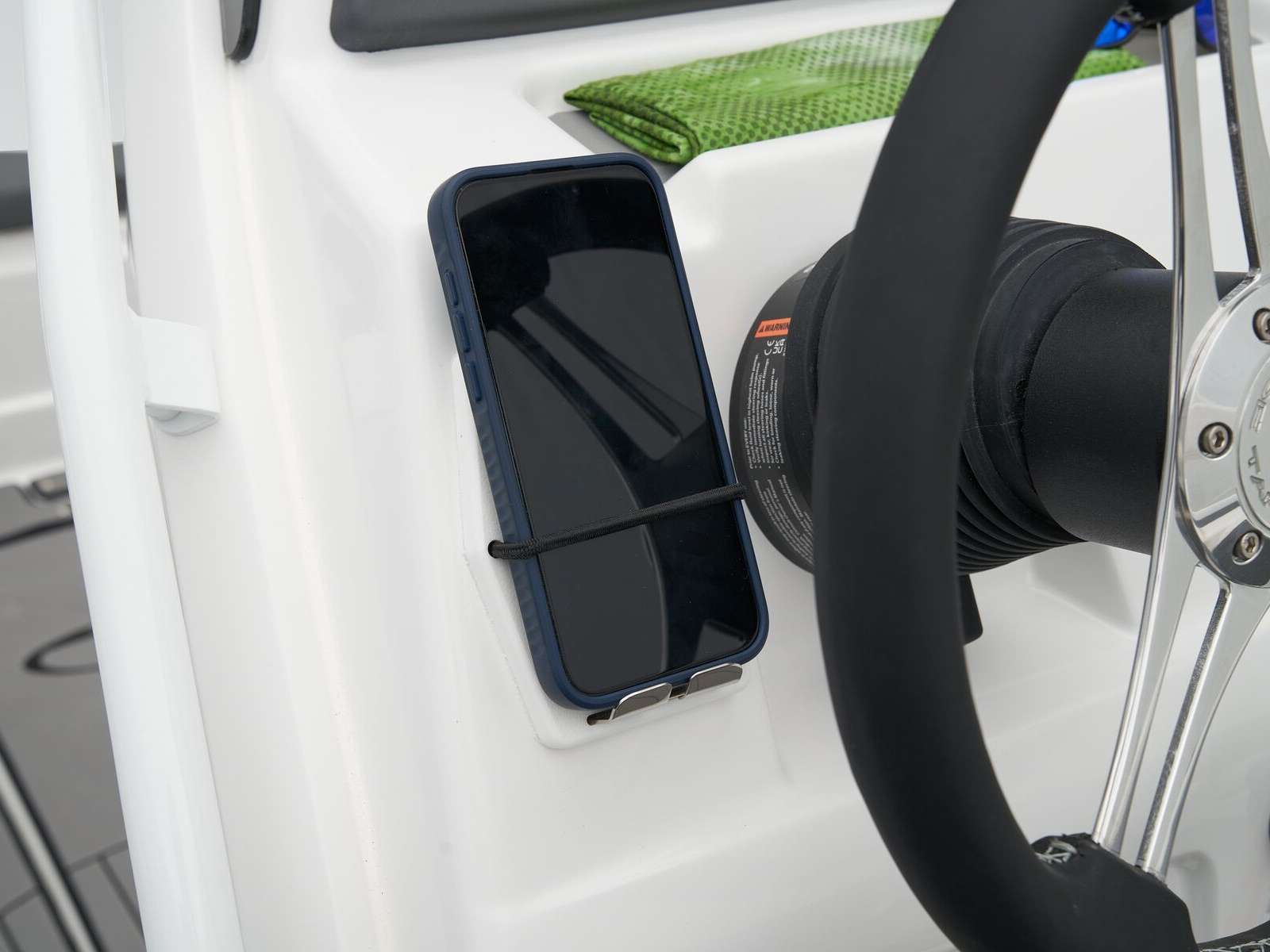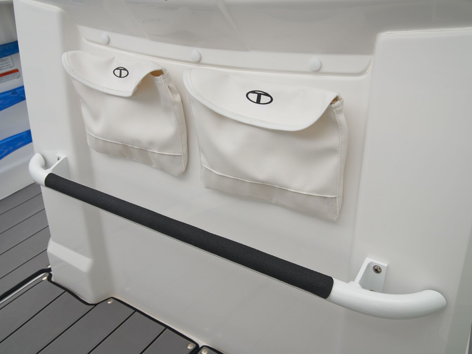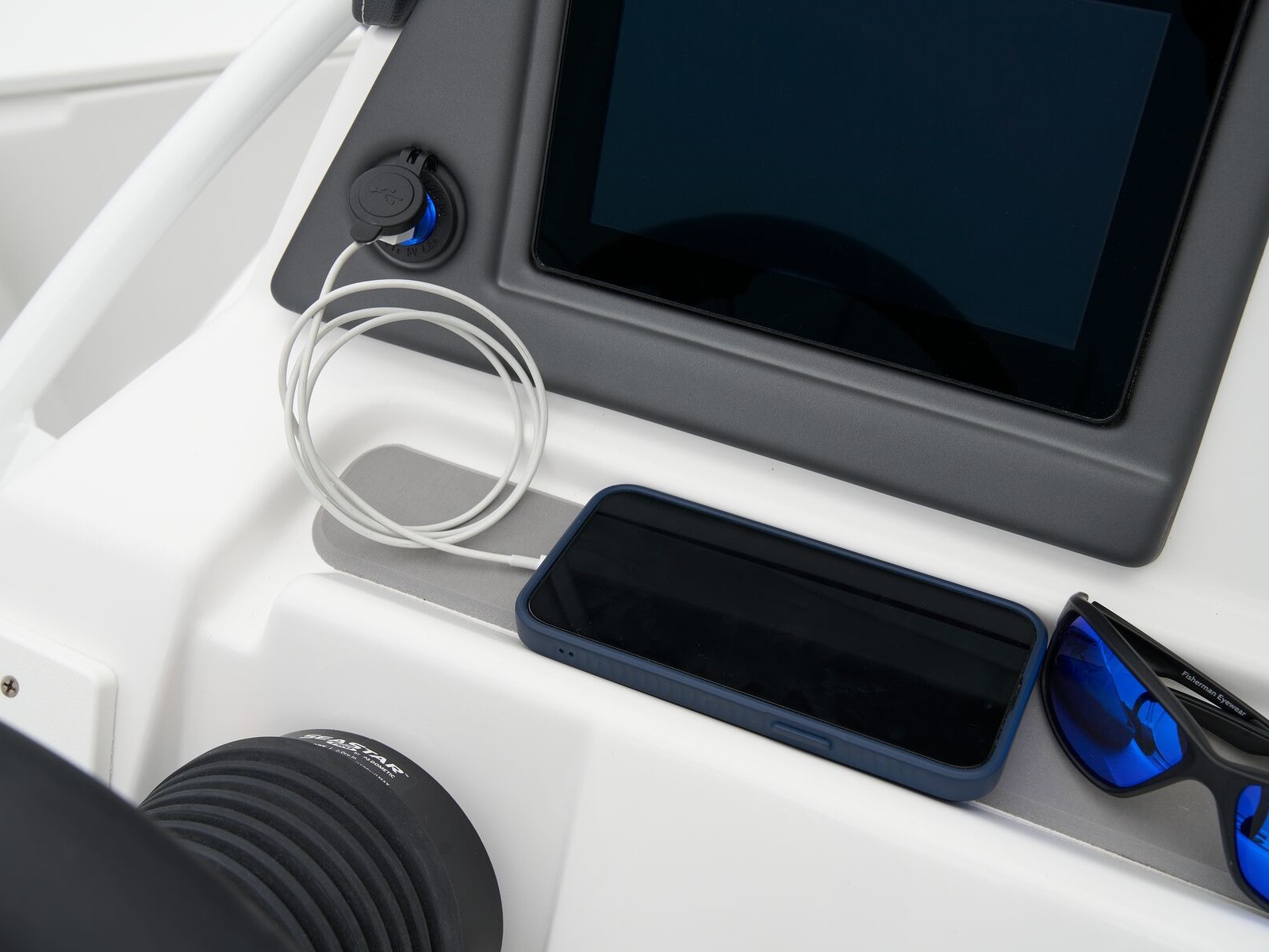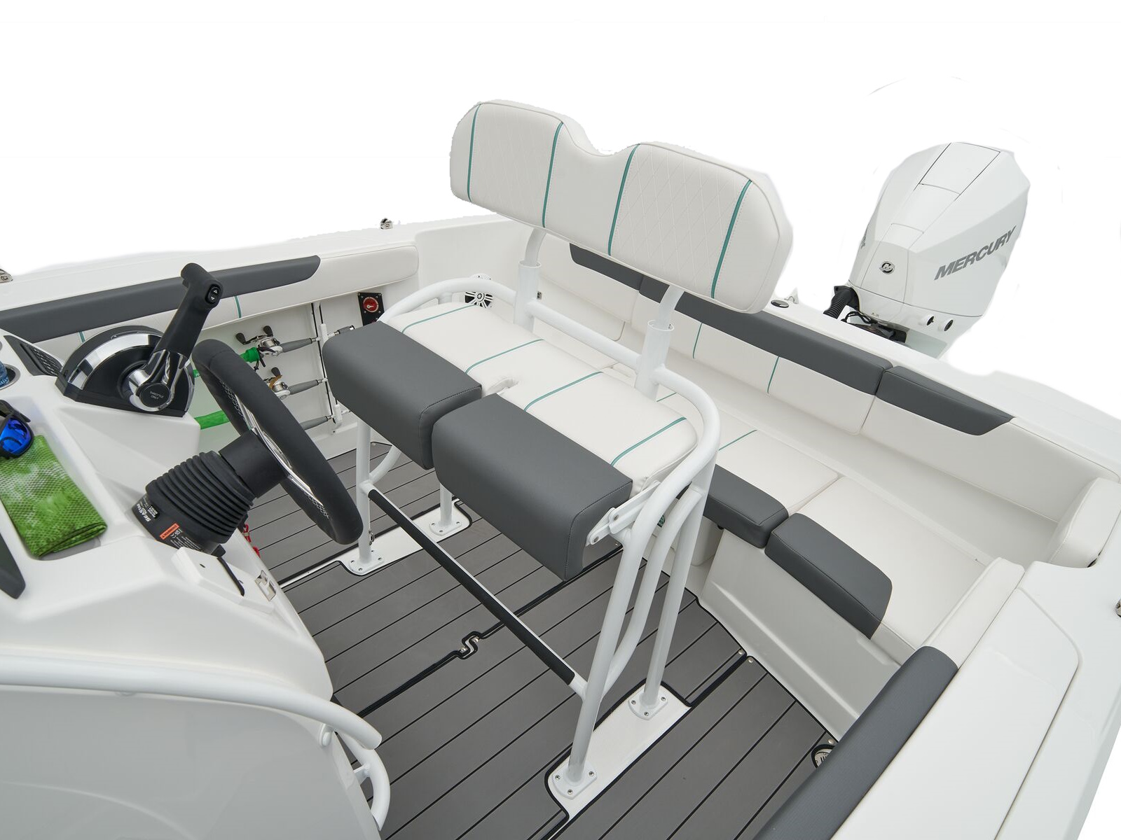 Its centralized helm boasts an 8" touch screen, a digital switch panel, and hydraulic steering. It's placed before a versatile leaning post with flip-up bolsters and a removable backrest that's hiding fishing rod holders. You'll also find under-gunnel rod holders that can carry up to 6 combos. Speaking of fishing, this boat has plenty to offer anglers, such as two 84-qt. insulated compartments for fish boxes and coolers, a 17-gal. aerated livewell, and an optional fishing package that adds plenty more exciting features.