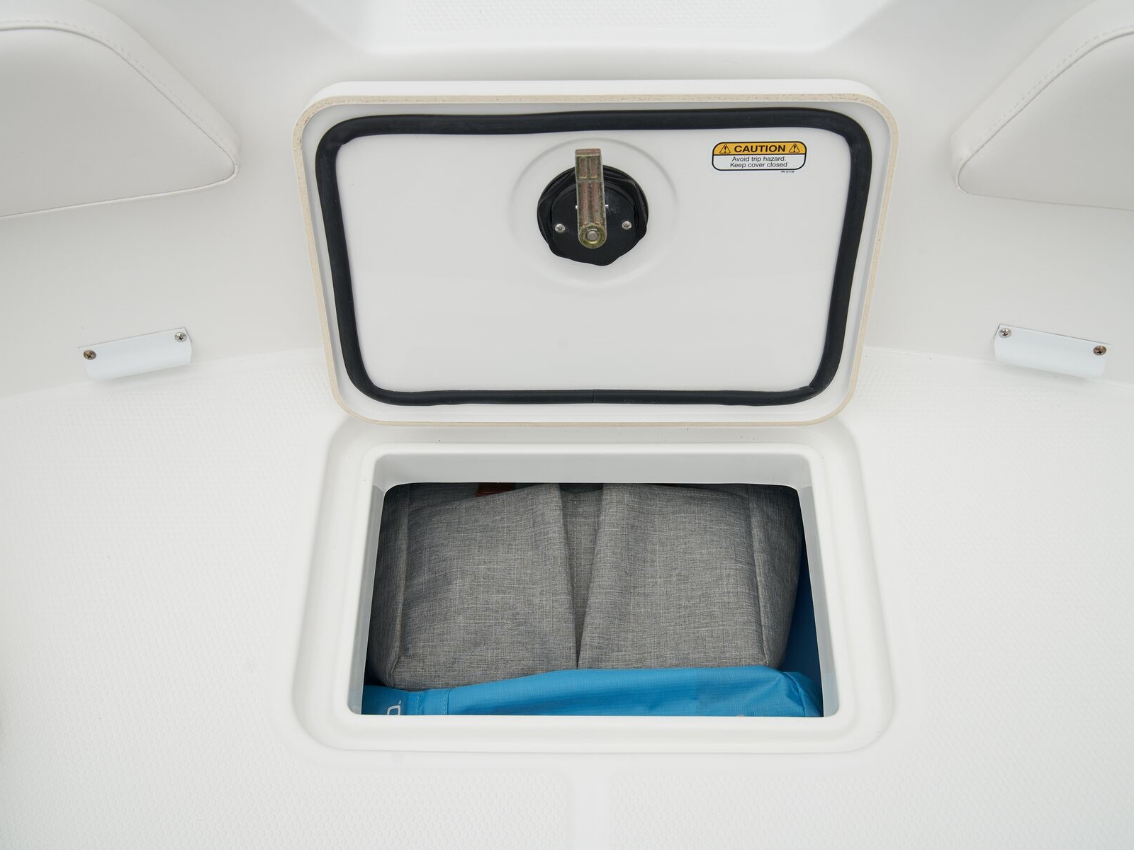 - Front-access, in-console storage compartment w/room for optional portable toilet (works w/drop-down Bimini top curtain)