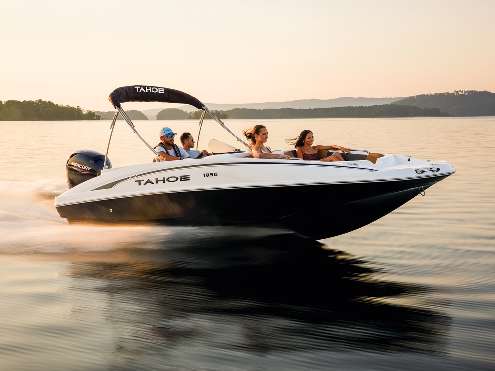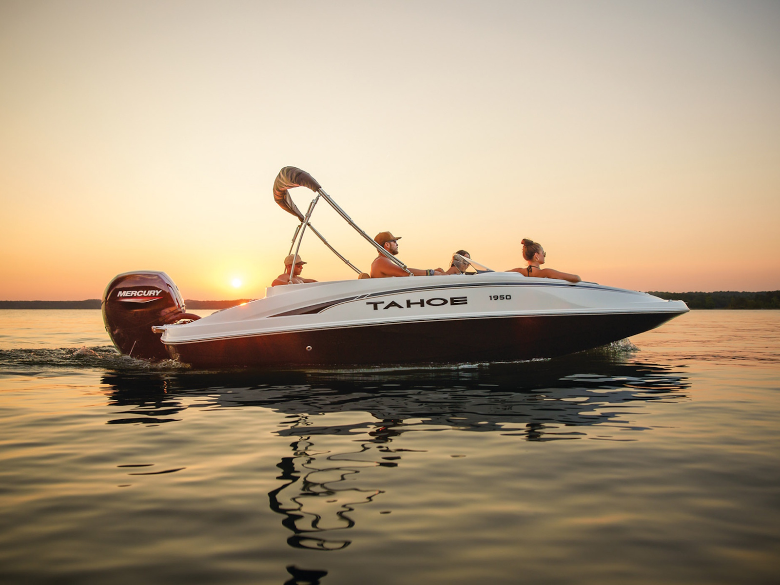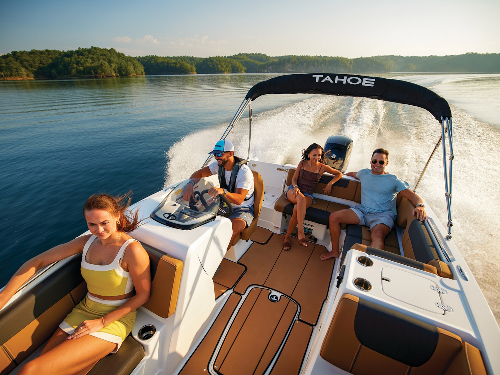 The helm boasts traditional gauges and switches for a more hands-on pilot experience. This TAHOE® is always ready to cast a line with its in-gunnel rod storage, standard 11.5-gal. livewell, and large swim platforms that can be upgraded with fishing seats. If the bites are slowing down, bring up the party playlist on the 4-speaker, Bluetooth®-compatible Kicker® stereo. After cooling off in the water, reboard with ease thanks to swim ladders at either end of the boat.