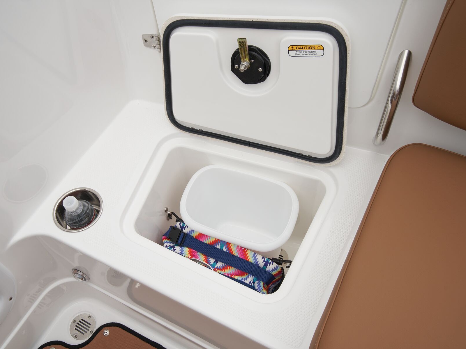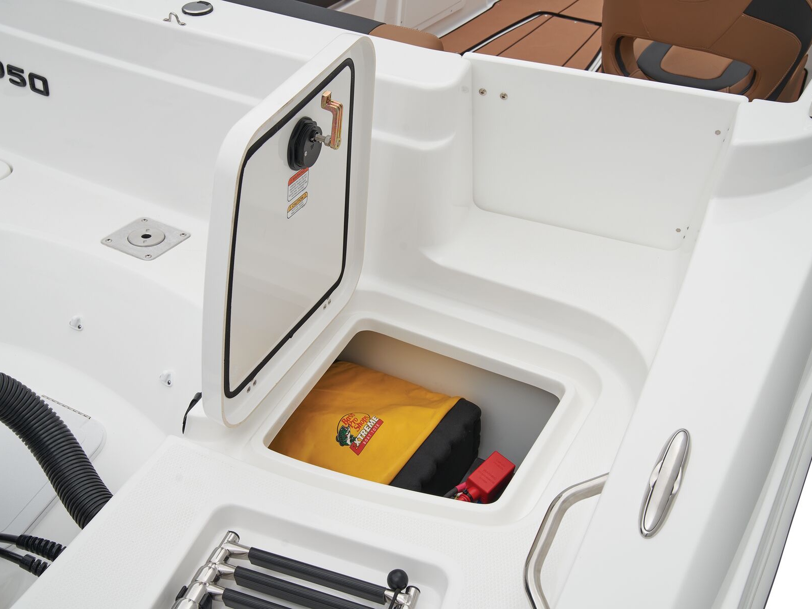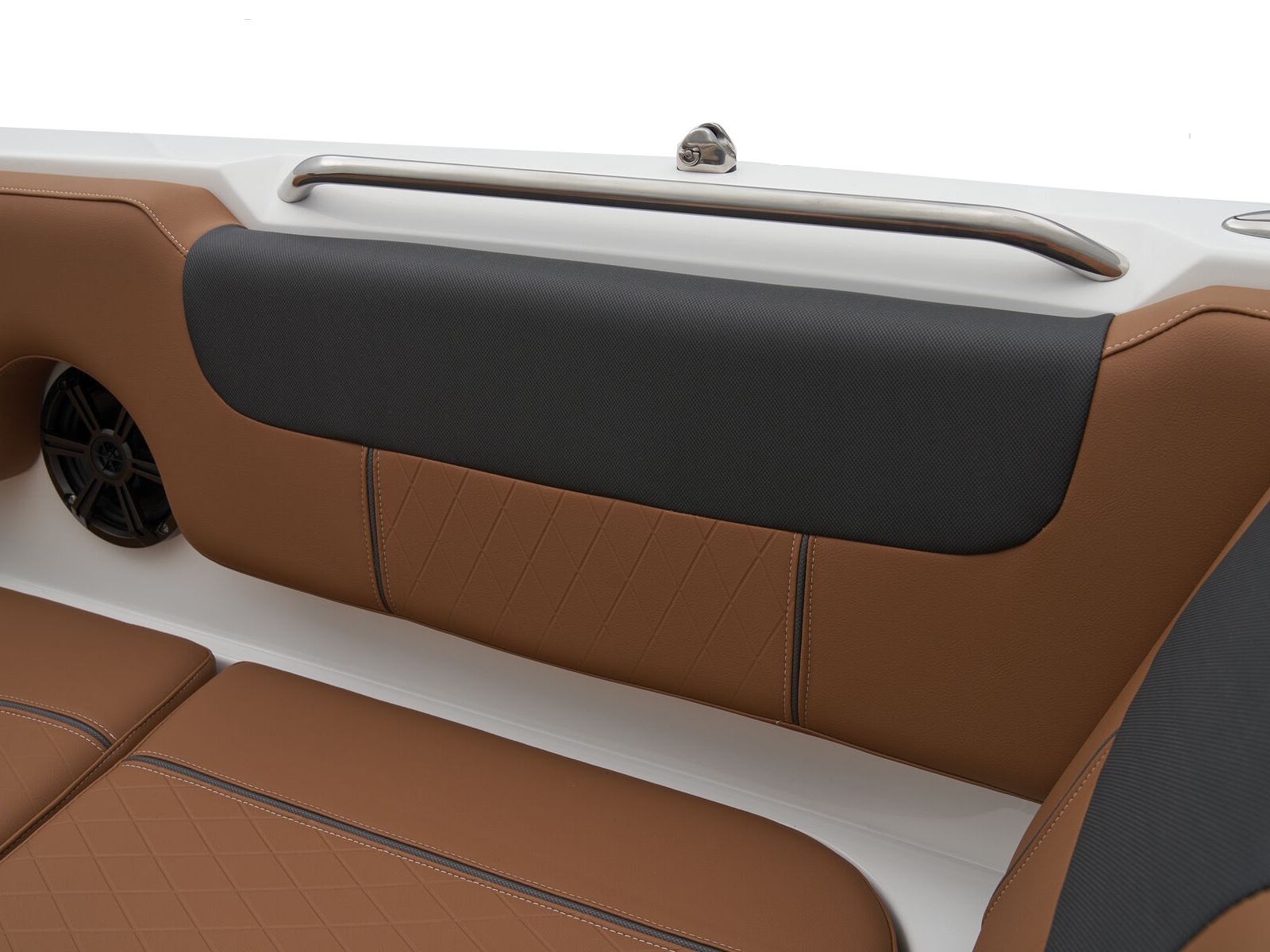 The ample lounges and benches hold a crew of 10. Stow gear, supplies, and more in the hidden storage compartments under the seats and elsewhere. Keep the drinks and snacks cold in the removable 25-qt. cooler. A standard bimini top helps you cool off when the sun is high. This model's removable aluminum ski-tow pylon and in-floor wakeboard/ski storage makes preparing for watersports a snap.