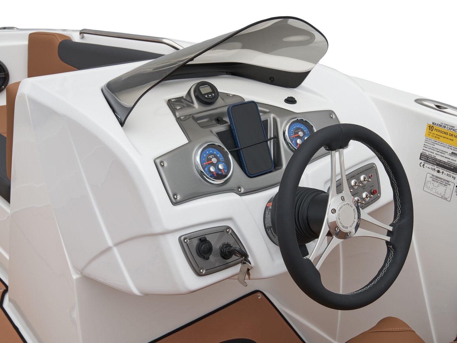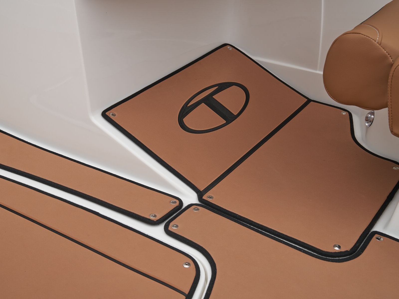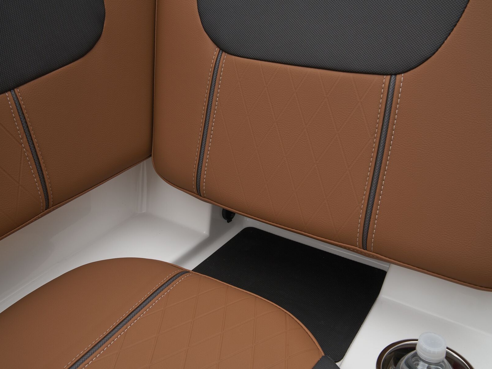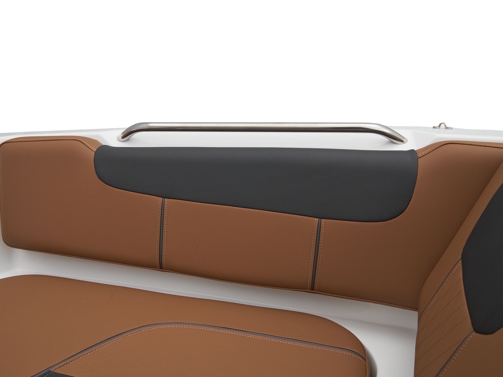 The ample lounges and benches hold a crew of 10. Stow gear, supplies, and more in the hidden storage compartments under the seats and elsewhere. Keep the drinks and snacks cold in the removable 25-qt. cooler. A standard bimini top helps you cool off when the sun is high. This model's removable aluminum ski-tow pylon and in-floor wakeboard/ski storage makes preparing for watersports a snap.