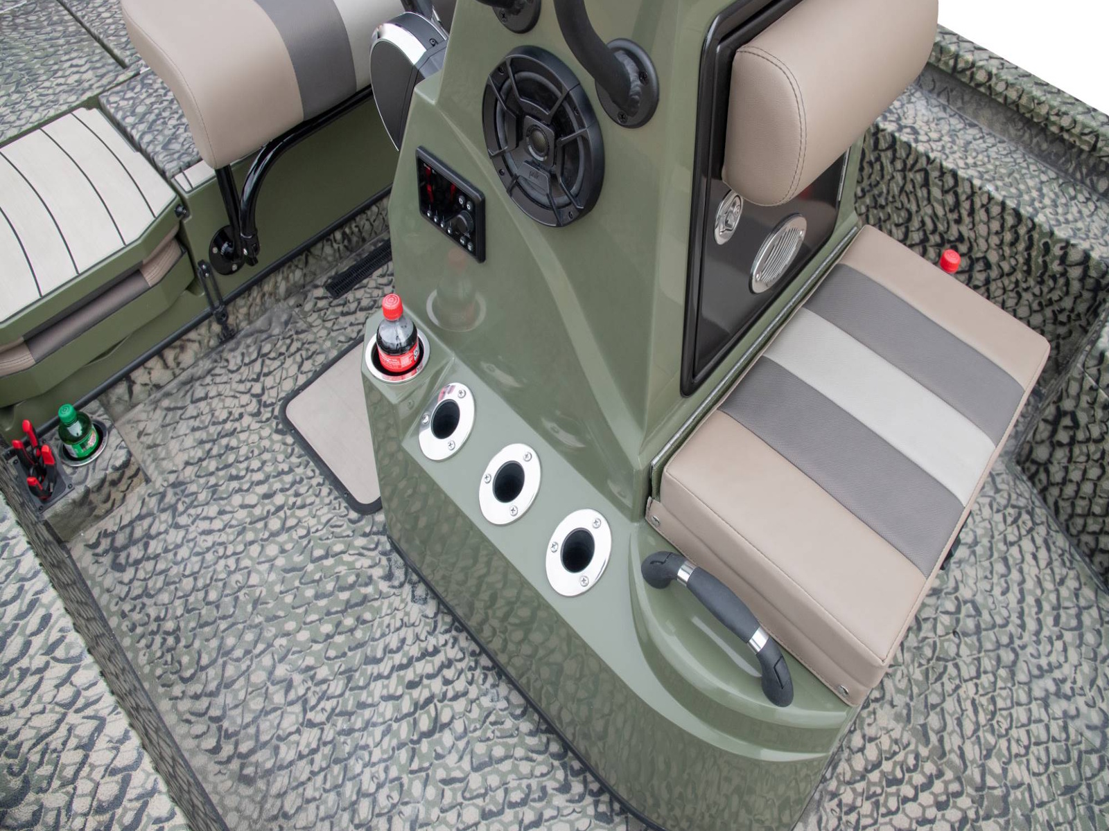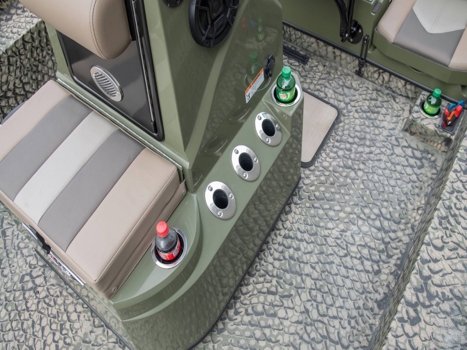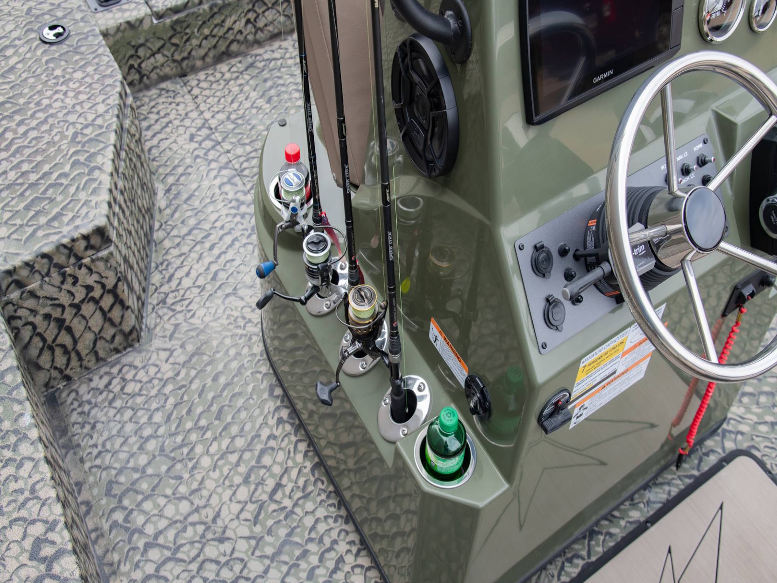 We don't simply screw our console to the floor. It's mounted to a fiberglass island, providing a toe rail that increases floor space and hides strip LED lighting. Inside, you'll find easy access to your battery charger and rigging. We even go so far as to mount the charger plug outside the console, saving that unnecessary climb back into the boat when the day is done. At the front of the console, you'll find an integrated baitwell with additional seating on top. Cupholders, rod holders, windshield, and grab rail make this console a true workstation.