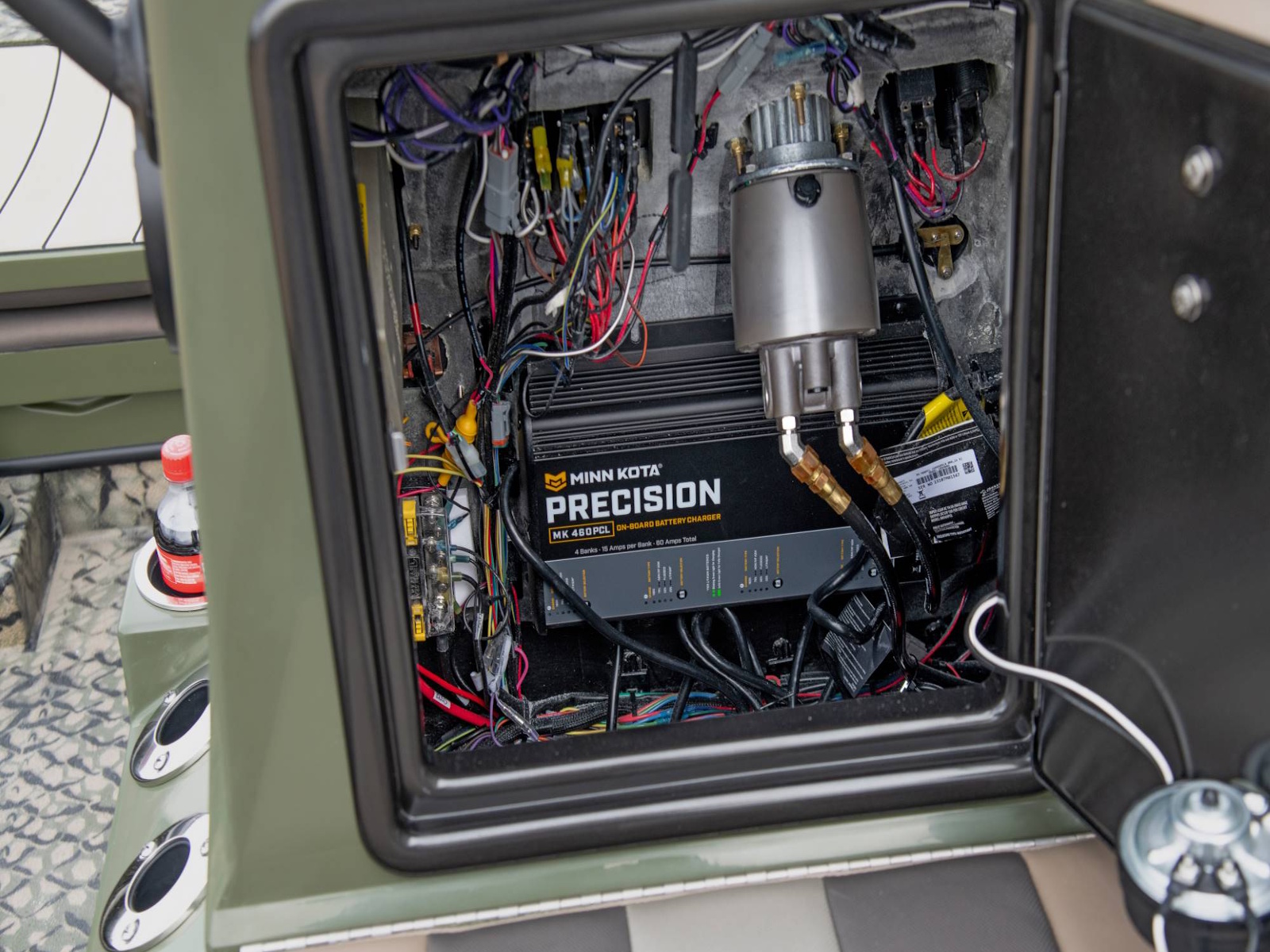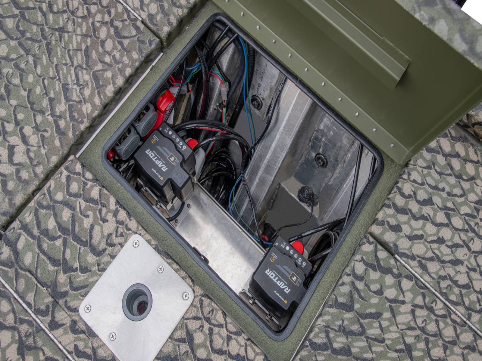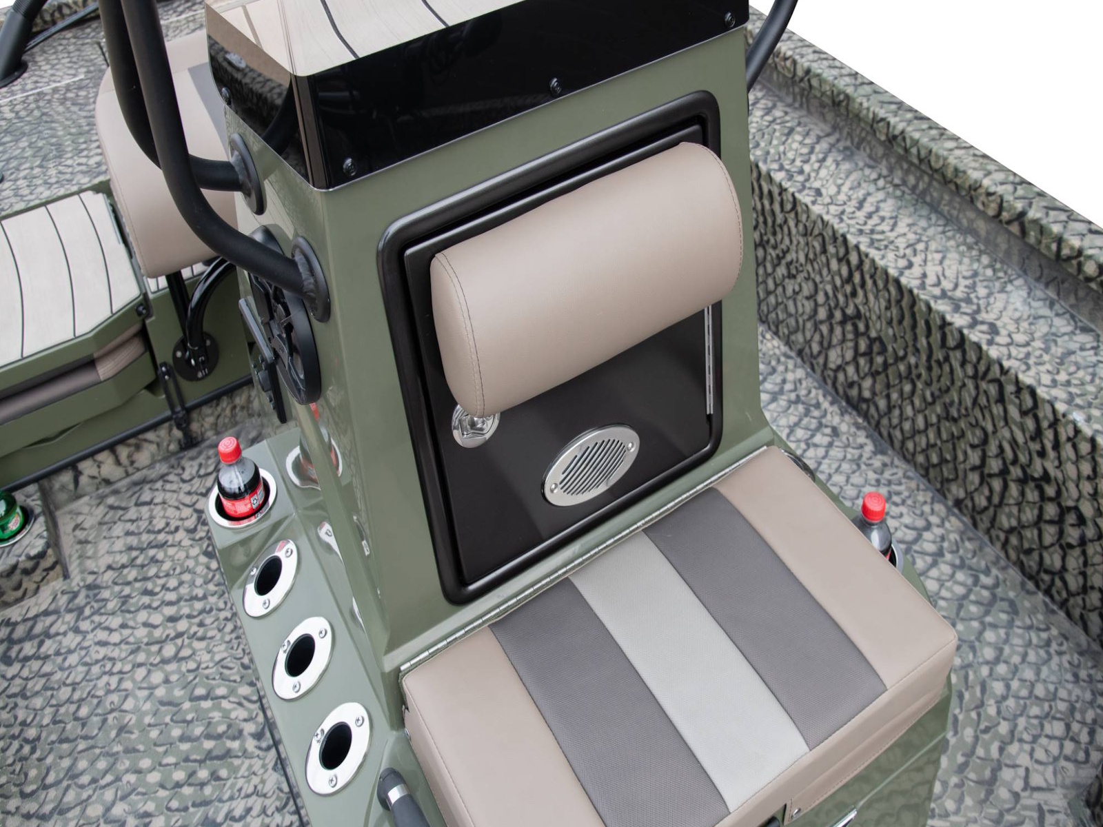 We don't simply screw our console to the floor. It's mounted to a fiberglass island, providing a toe rail that increases floor space and hides strip LED lighting. Inside, you'll find easy access to your battery charger and rigging. We even go so far as to mount the charger plug outside the console, saving that unnecessary climb back into the boat when the day is done. At the front of the console, you'll find an integrated baitwell with additional seating on top. Cupholders, rod holders, windshield, and grab rail make this console a true workstation.