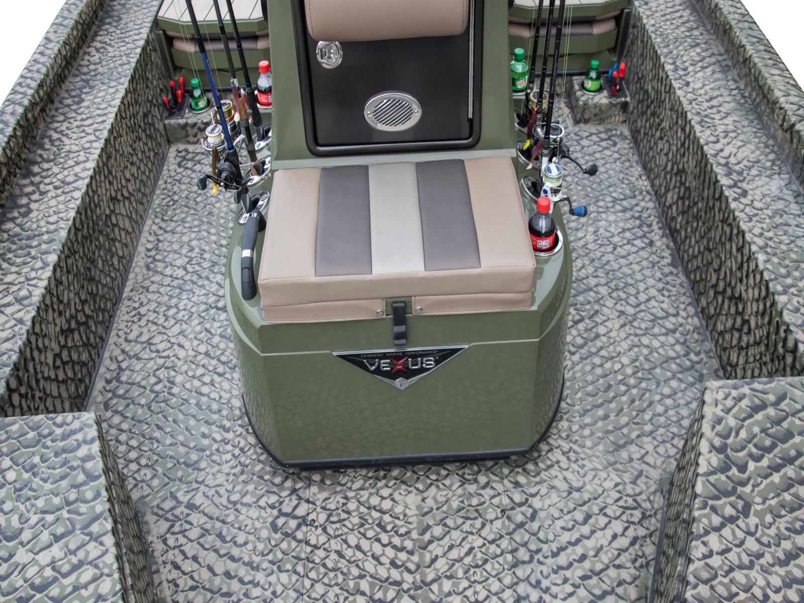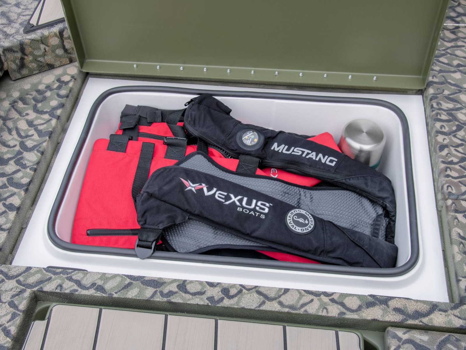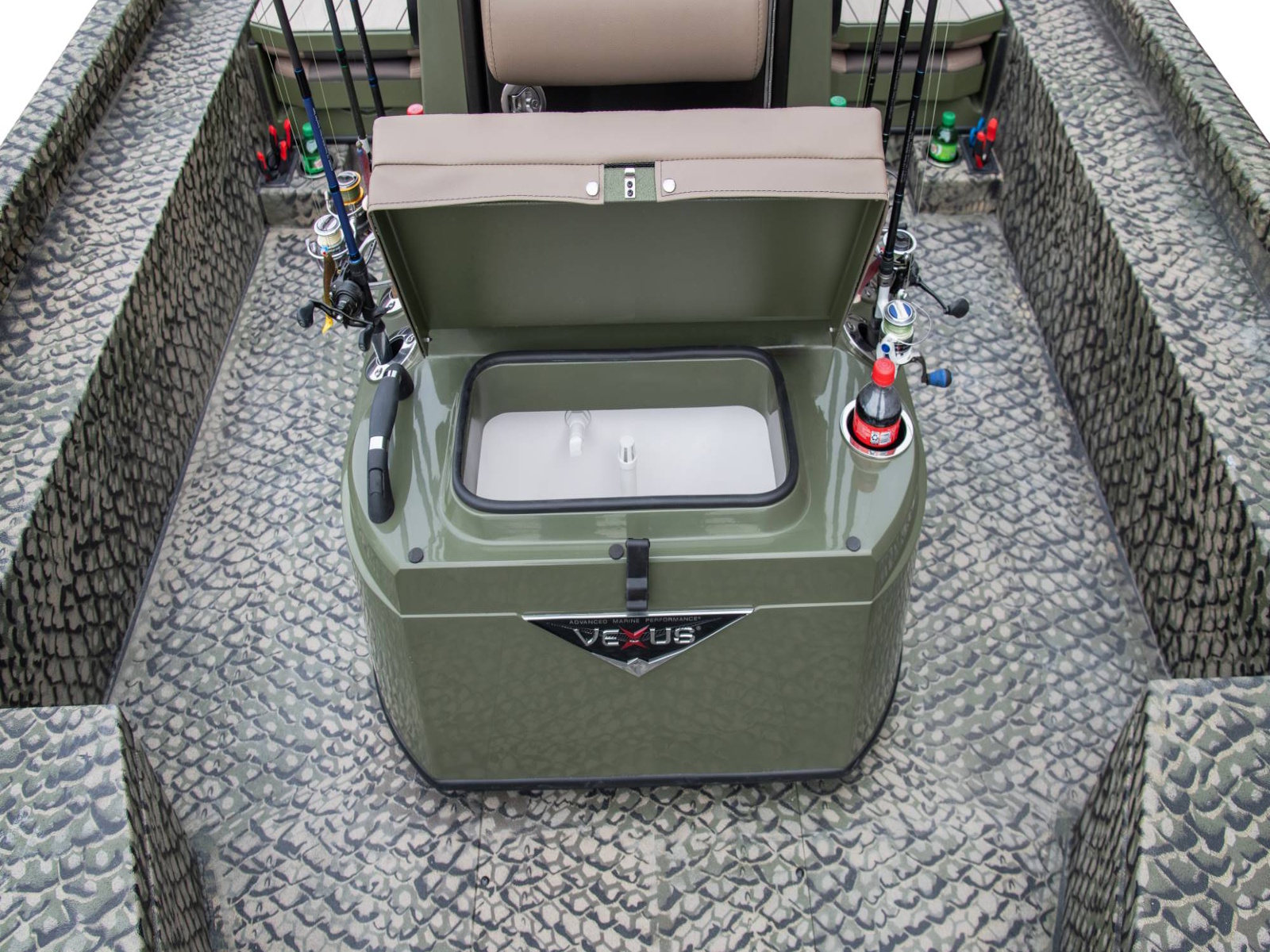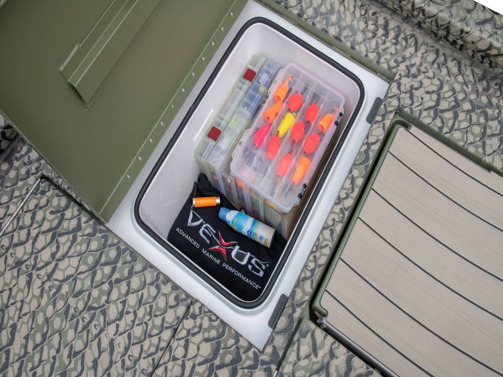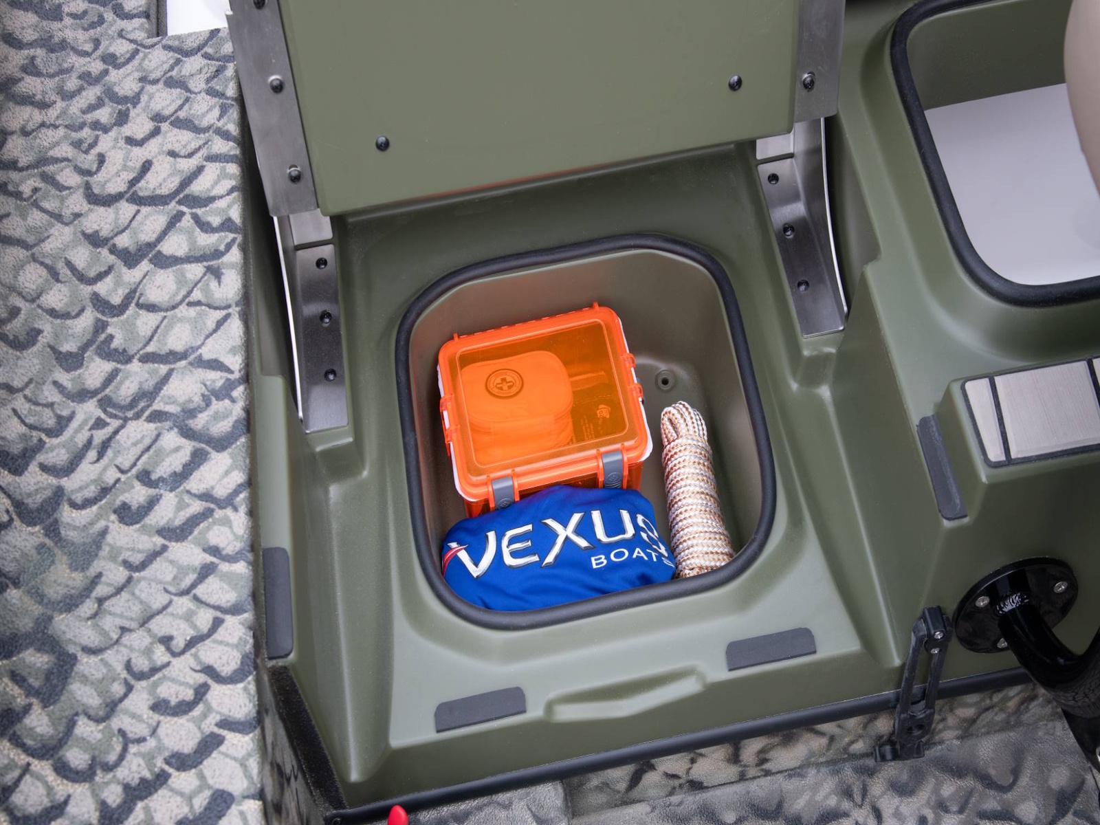 Inside, the wide open layout is engineered for quick, fluid movement bow to stern. Even at a glance, it’s easy to see the front deck is huge, far exceeding the cramped designs found in other aluminum rigs. It’s another Vexus-sized advantage accomplished by taking our stretch-formed gunnels and bringing the beam even farther forward. Ultimately, it creates a front deck so massive that, not only is there a world of room for multiple anglers up front, but gear storage dominates, and both rod compartments are built for an arsenal of sticks. Centering the forward deck, another large storage box includes a reinforced lid, insulated and gel-coated interior, compression latch, and an available recessed tray for the trolling motor pedal.