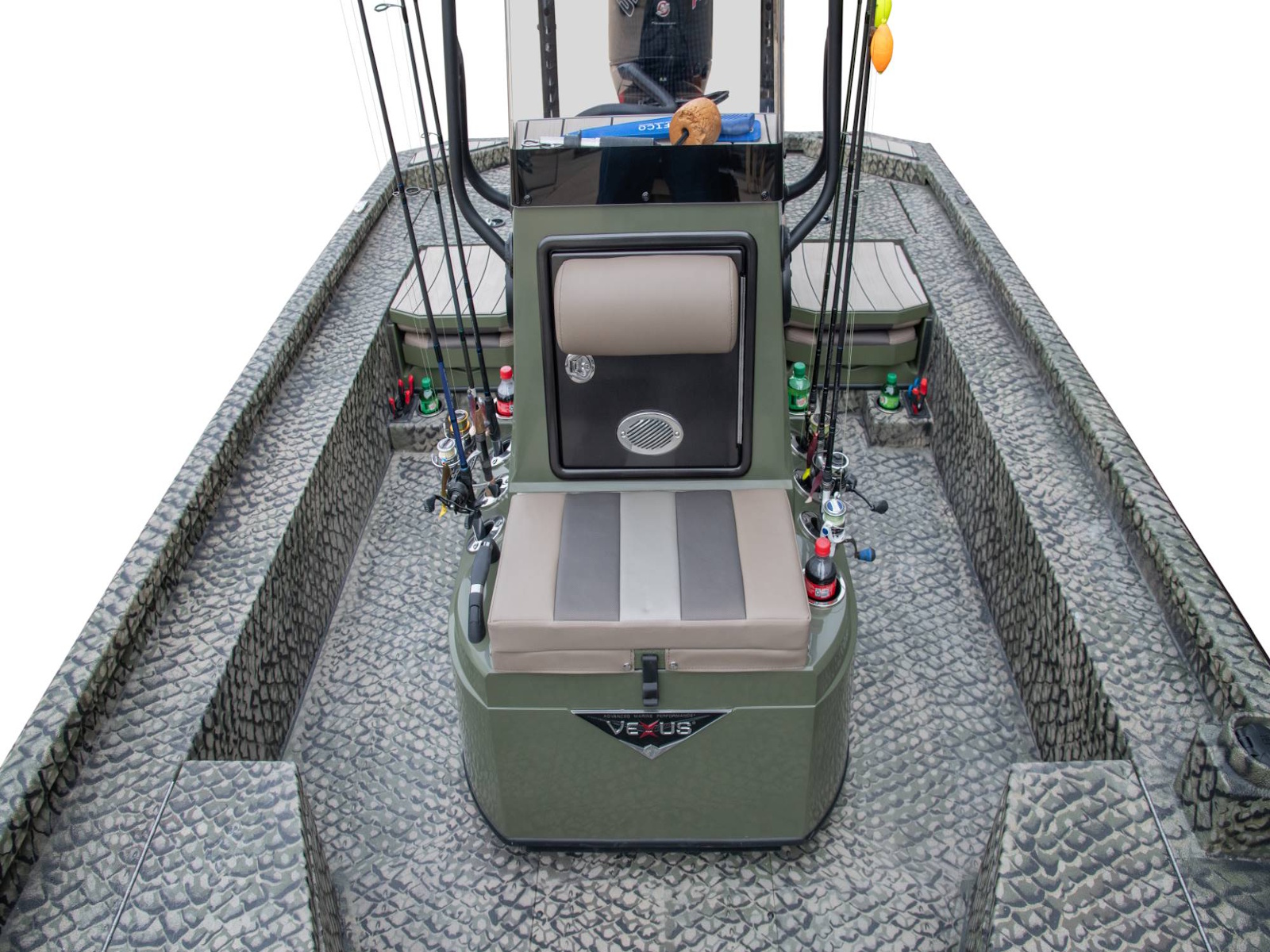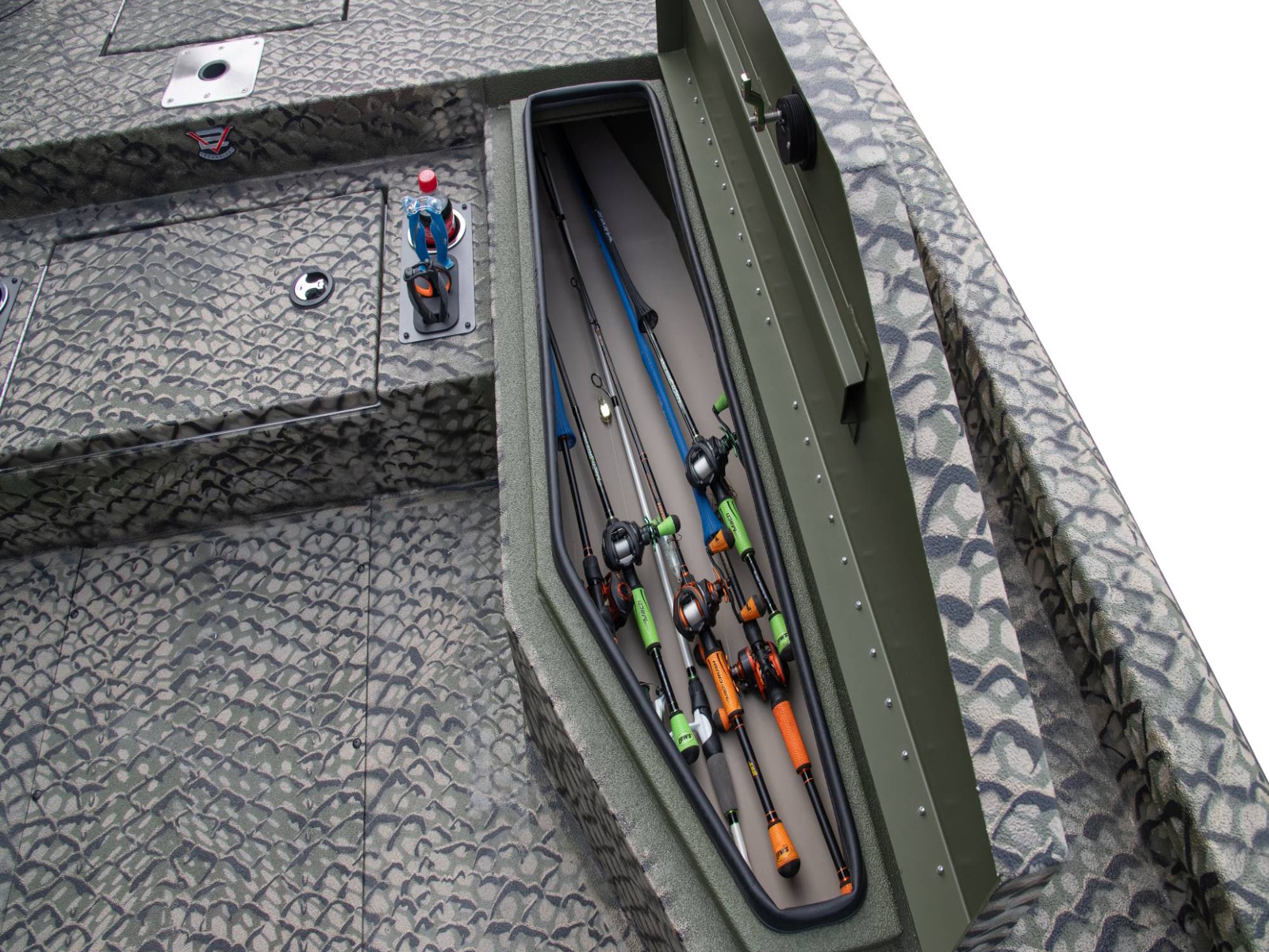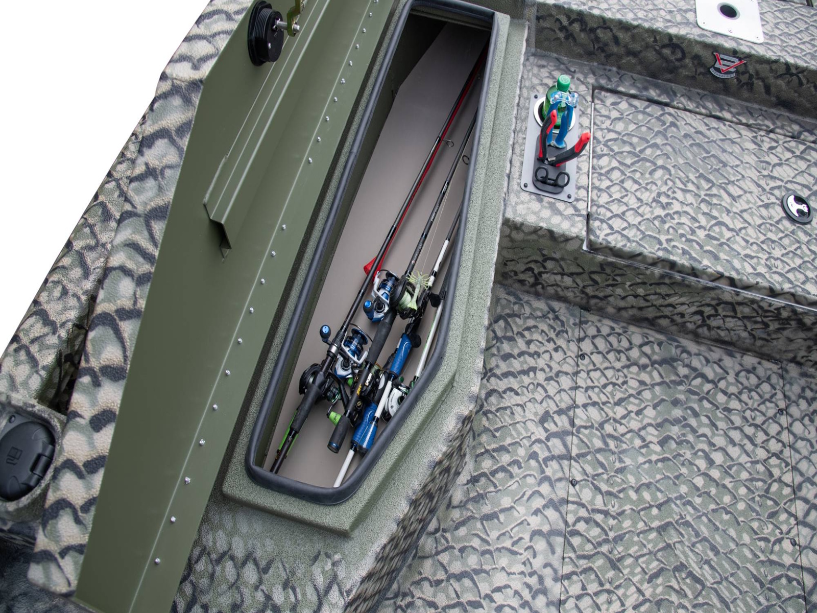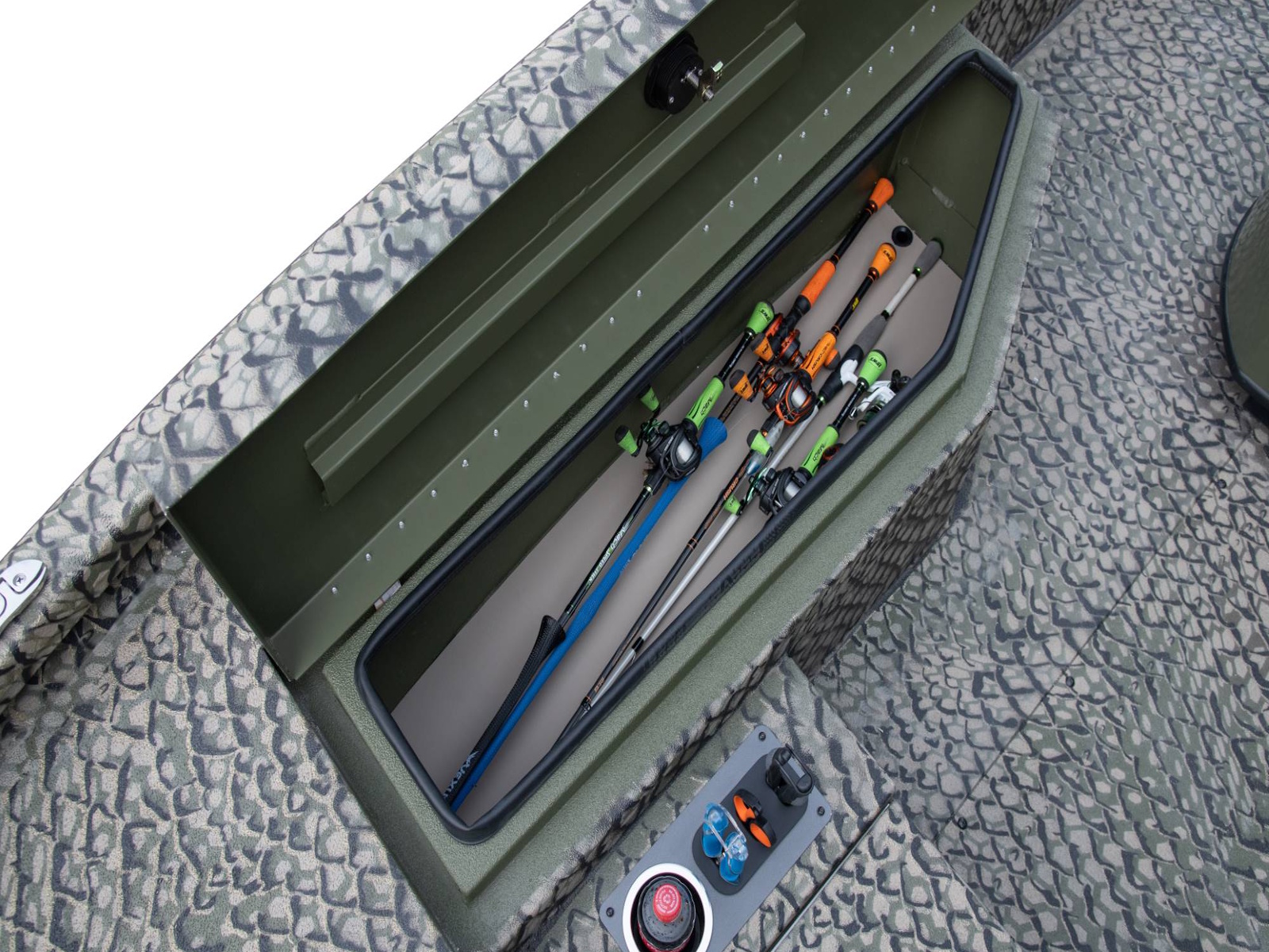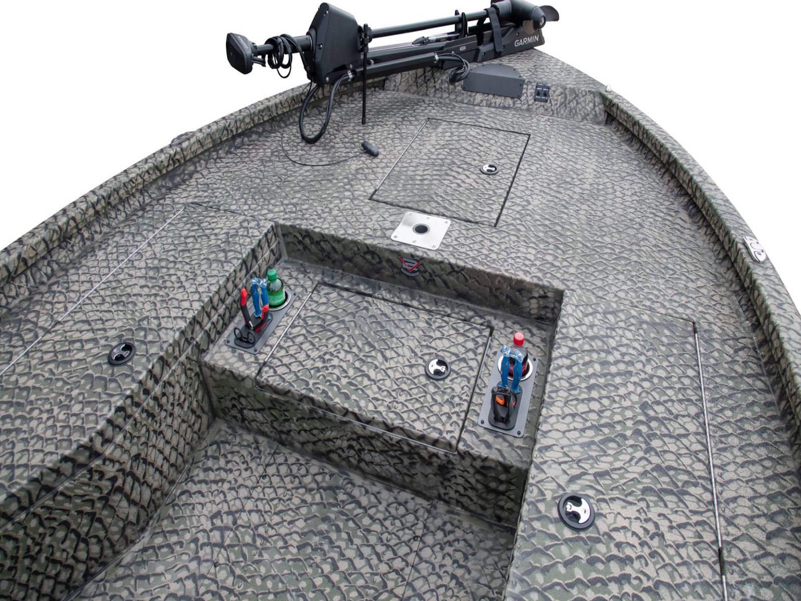 Inside, the wide open layout is engineered for quick, fluid movement bow to stern. Even at a glance, it’s easy to see the front deck is huge, far exceeding the cramped designs found in other aluminum rigs. It’s another Vexus-sized advantage accomplished by taking our stretch-formed gunnels and bringing the beam even farther forward. Ultimately, it creates a front deck so massive that, not only is there a world of room for multiple anglers up front, but gear storage dominates, and both rod compartments are built for an arsenal of sticks. Centering the forward deck, another large storage box includes a reinforced lid, insulated and gel-coated interior, compression latch, and an available recessed tray for the trolling motor pedal.