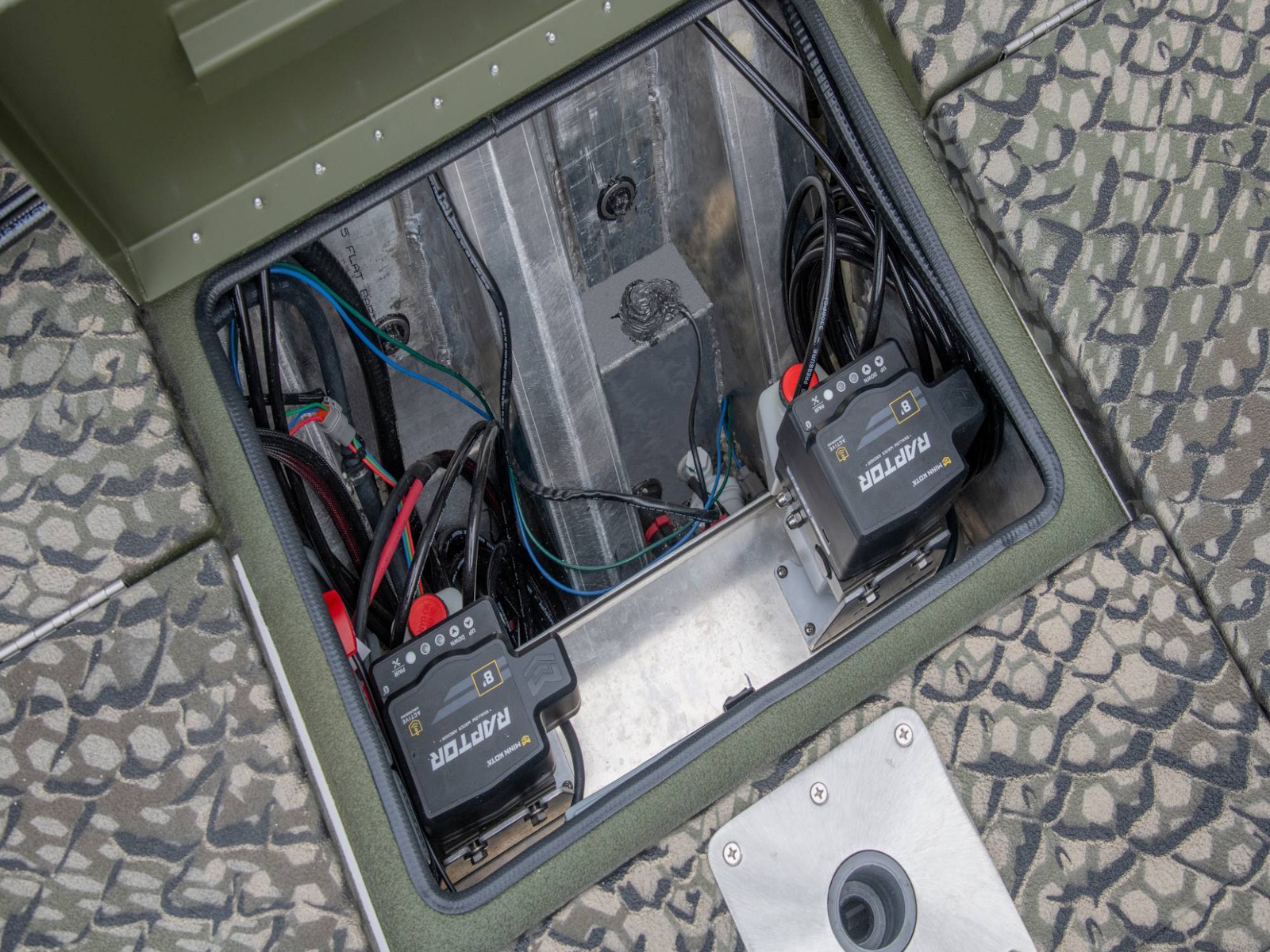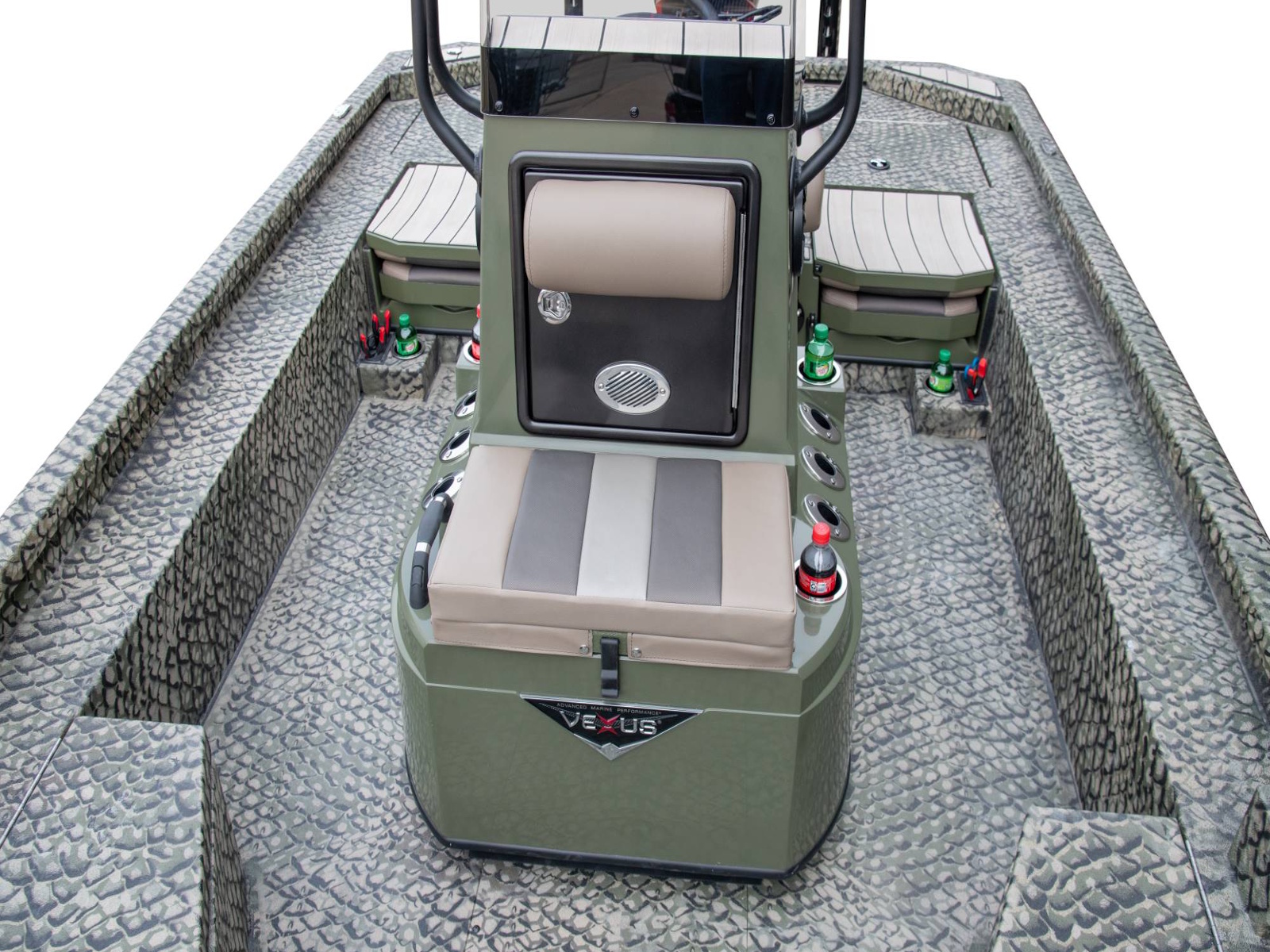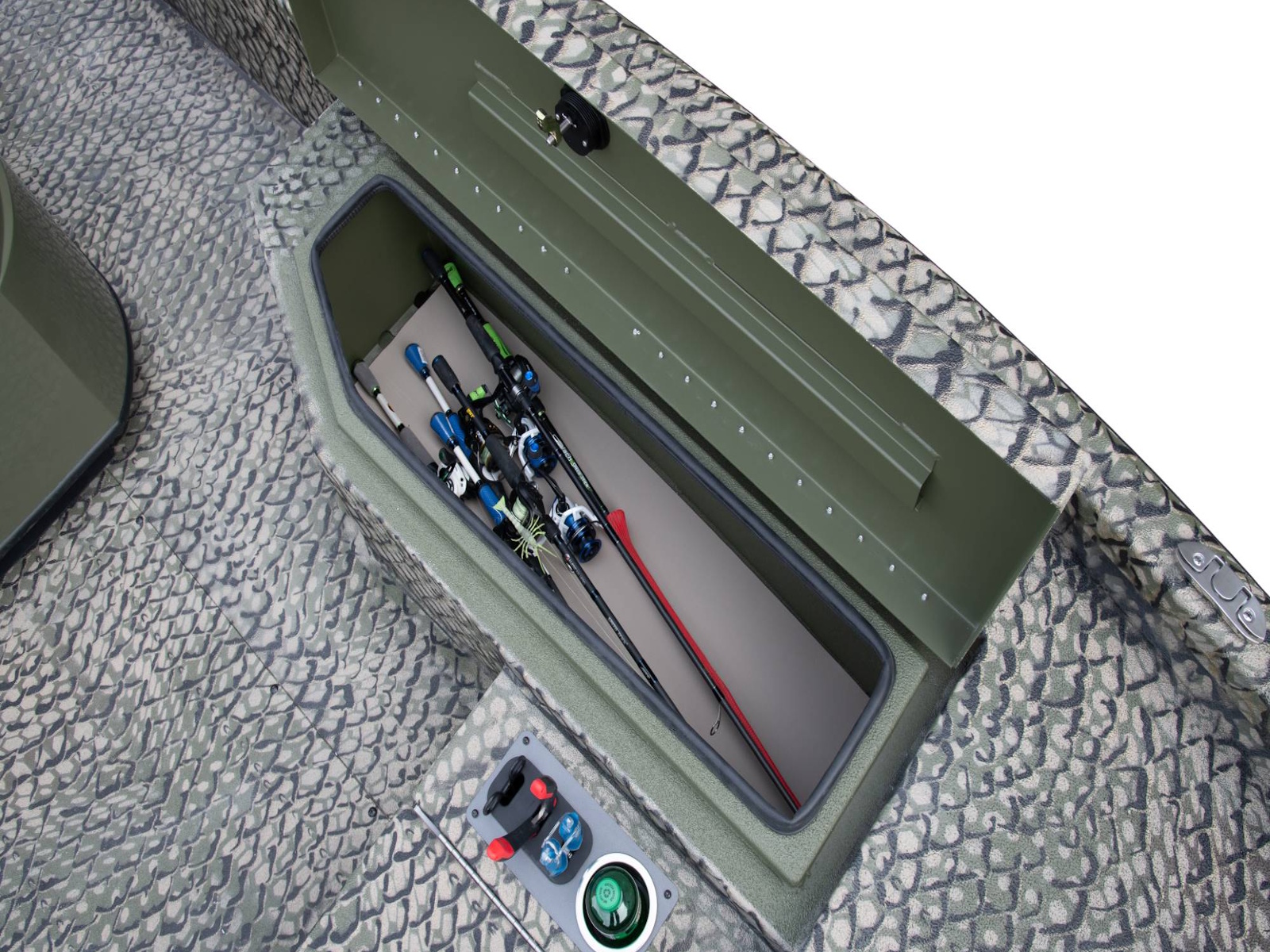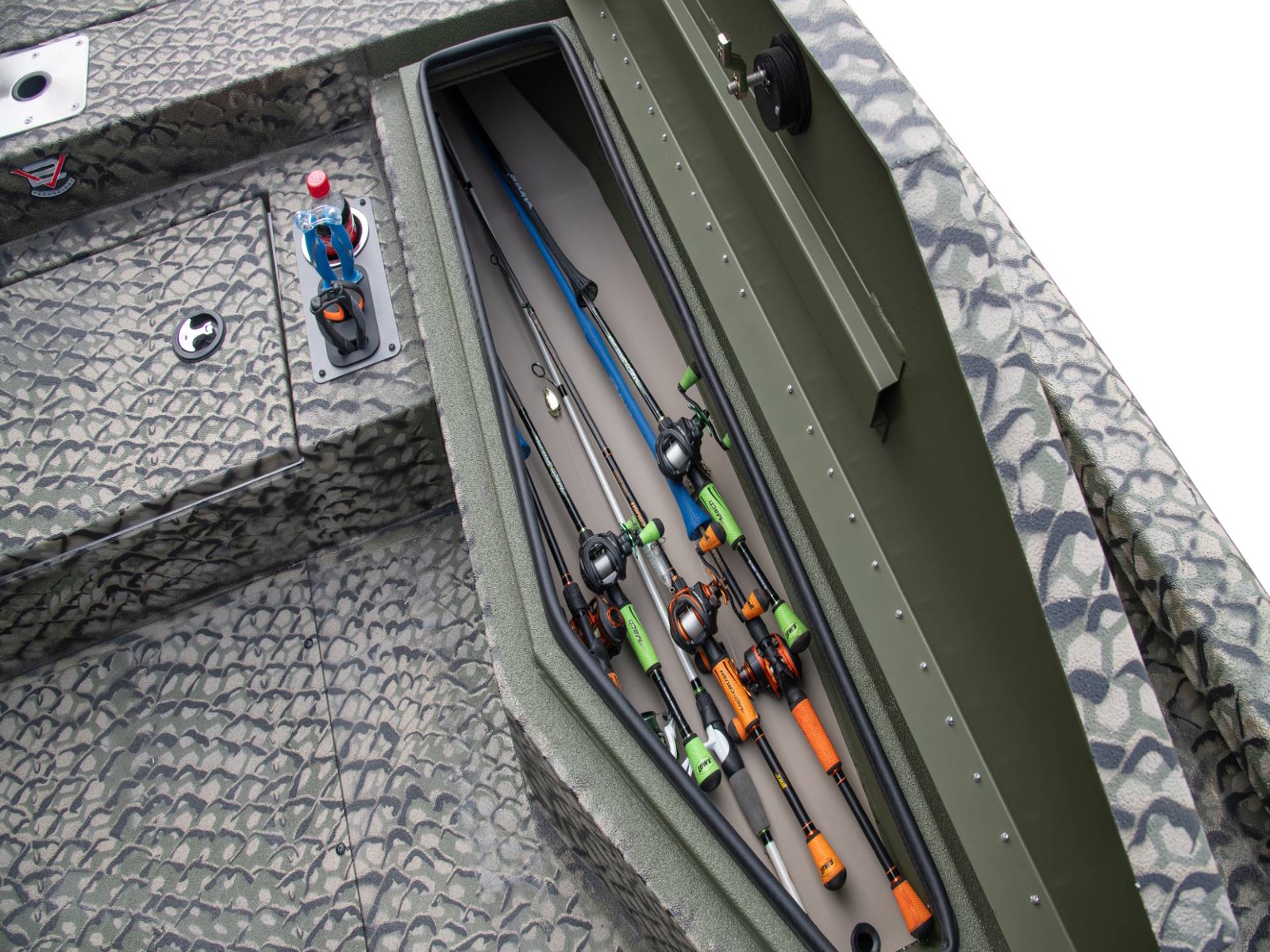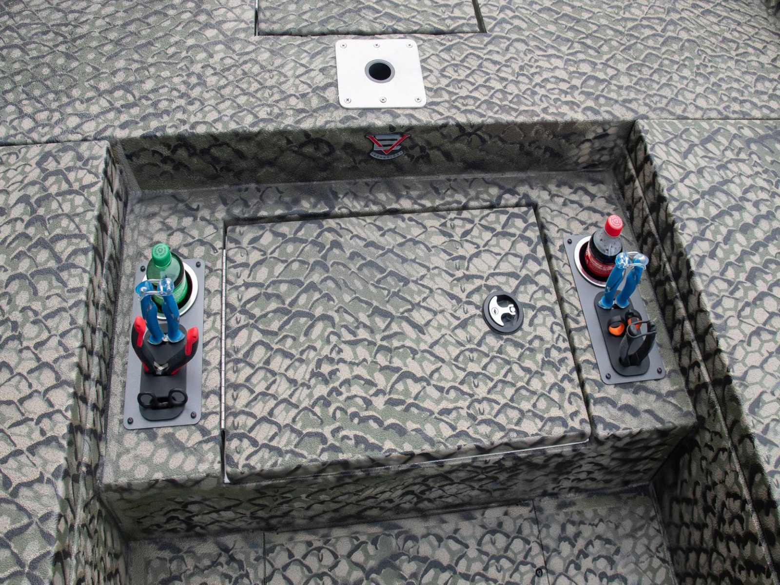 Inside, the wide open layout is engineered for quick, fluid movement bow to stern. Even at a glance, it’s easy to see the front deck is huge, far exceeding the cramped designs found in other aluminum rigs. It’s another Vexus-sized advantage accomplished by taking our stretch-formed gunnels and bringing the beam even farther forward. Ultimately, it creates a front deck so massive that, not only is there a world of room for multiple anglers up front, but gear storage dominates, and both rod compartments are built for an arsenal of sticks. Centering the forward deck, another large storage box includes a reinforced lid, insulated and gel-coated interior, compression latch, and an available recessed tray for the trolling motor pedal.