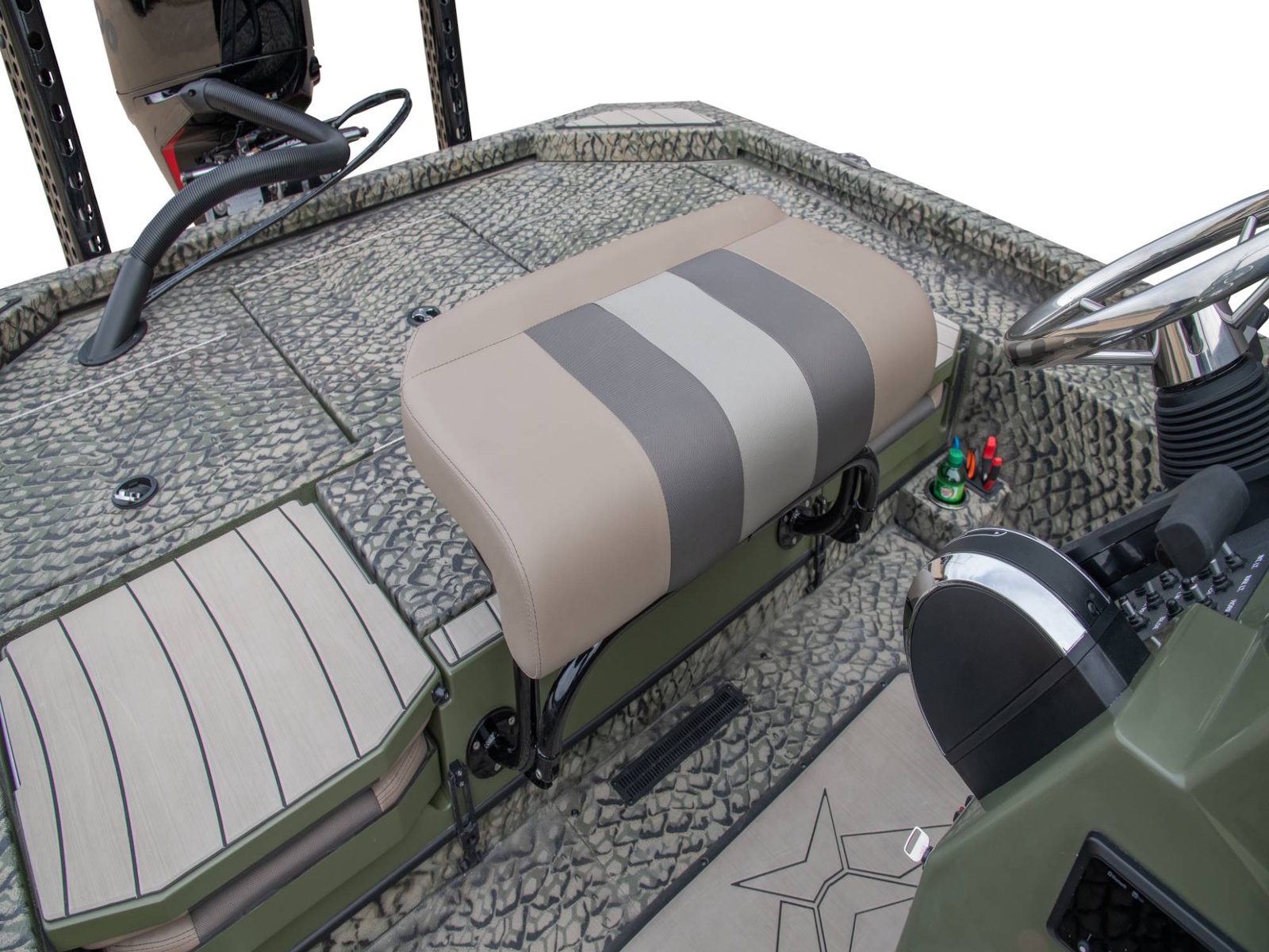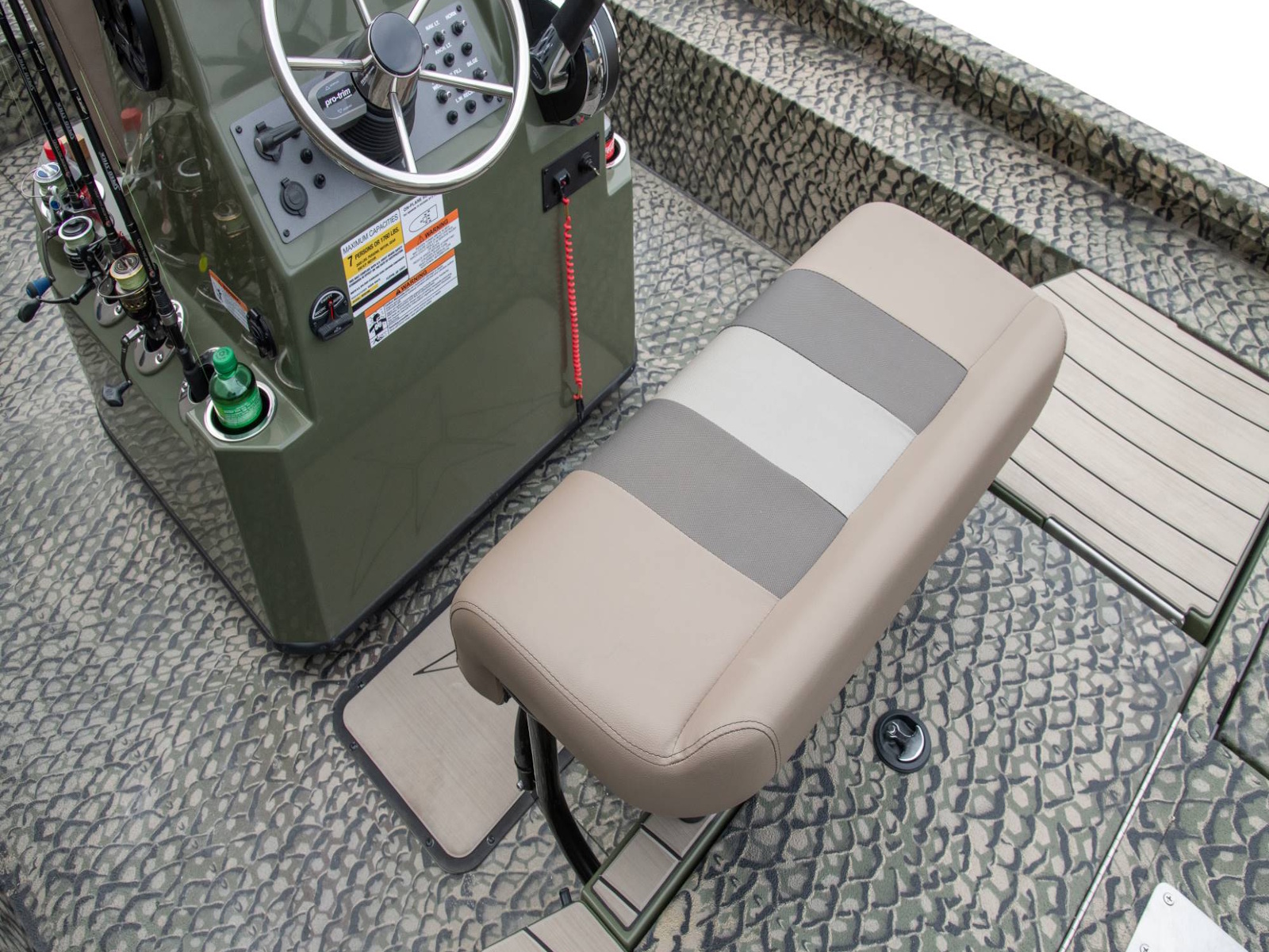 Our custom driver’s seat provides exceptional comfort, stability, and support for long days on the water. There’s even an integrated fold-down footrest and anti-fatigue mat for additional comfort.