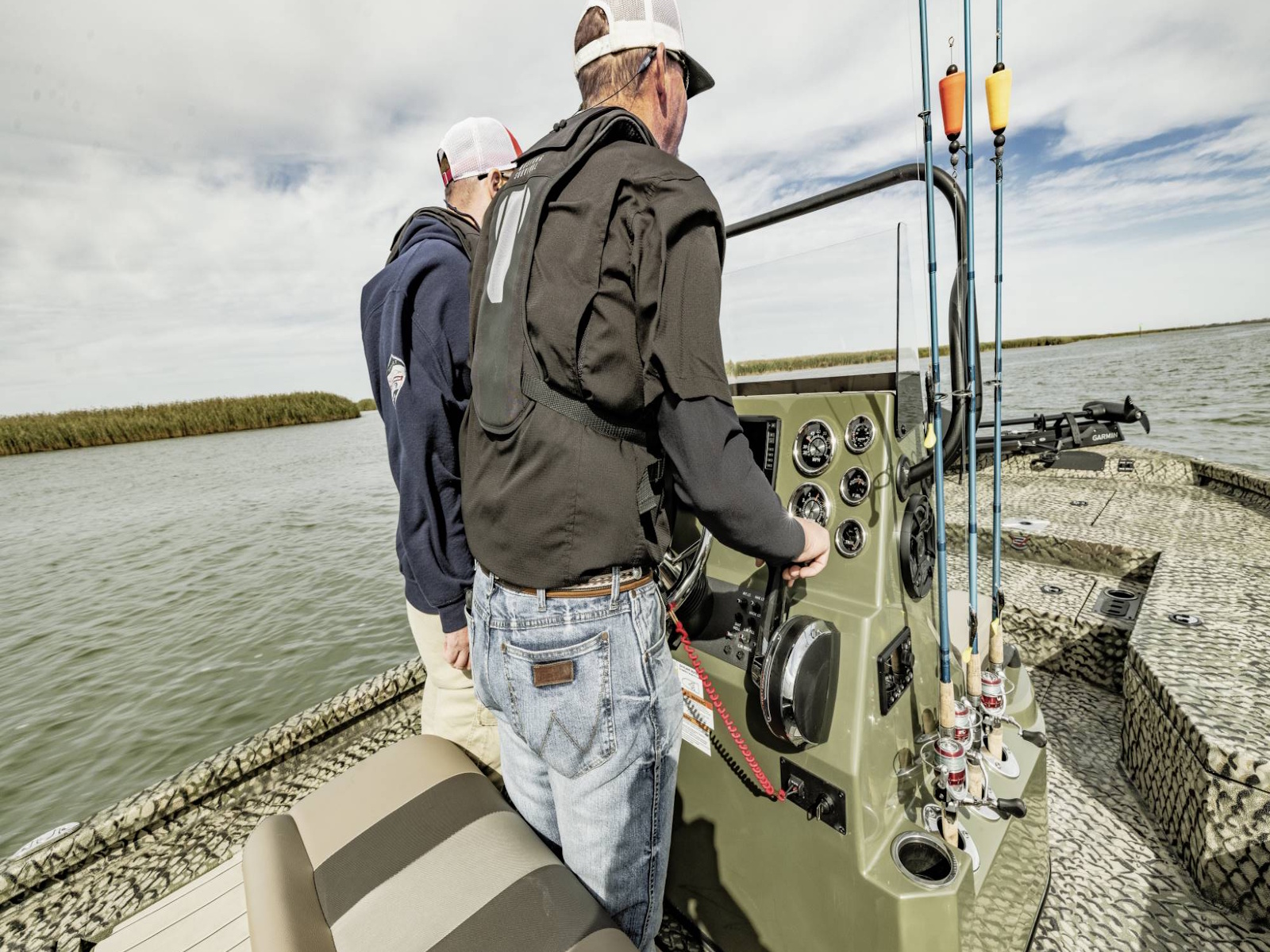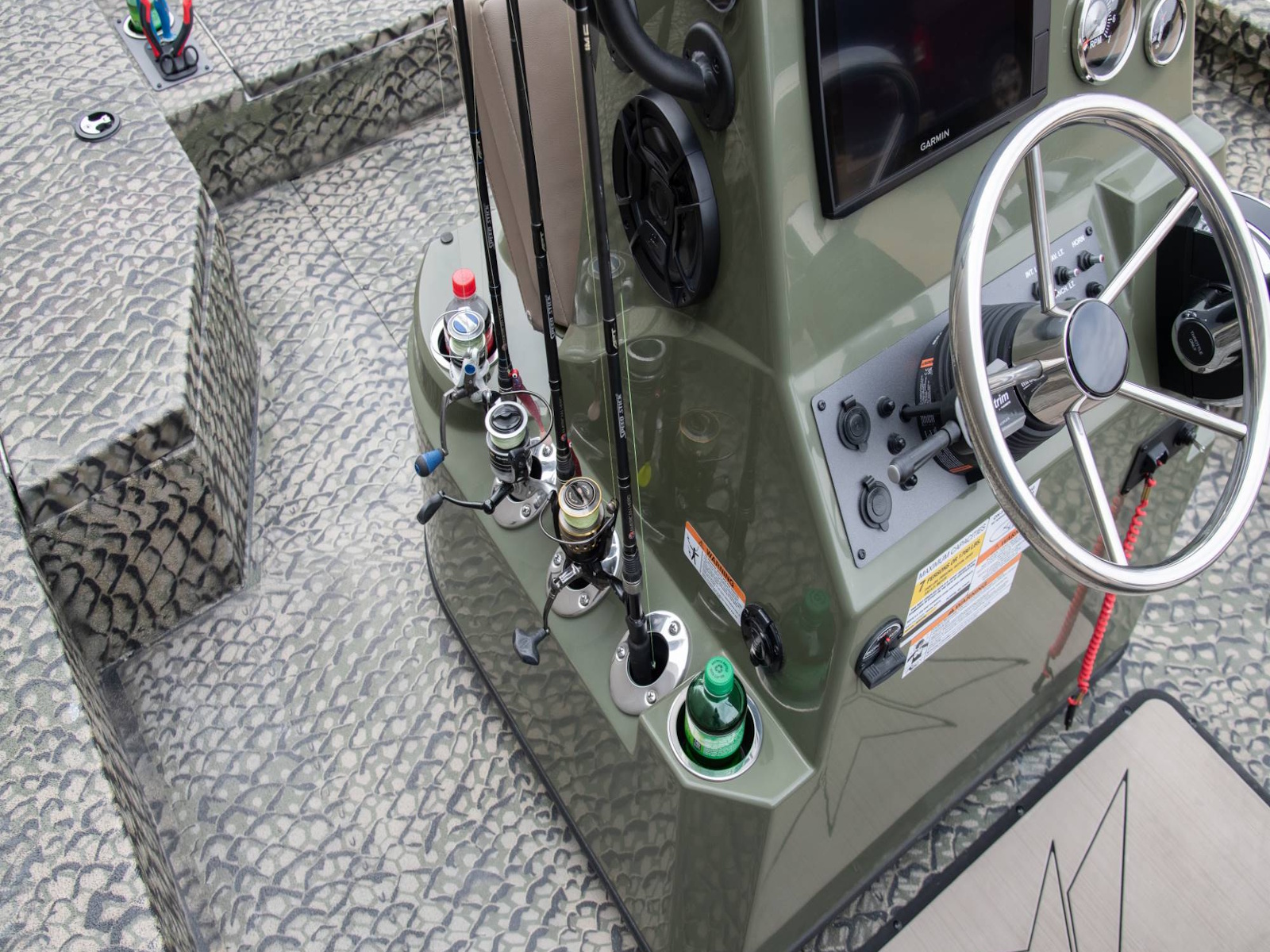 Serving double duty as a step to the front deck, another reinforced fiberglass gear storage is surrounded by a double set of tool holders. Forty-four gallons of fuel capacity are positioned below the cockpit floor, adding to the ultra-stable, solid, and responsive feel. Ultimately, every part of the design has been handcrafted to reinforce your confidence on the water. The console of the 2150 is equipped with undercut toe-kicks, rod and cup holders, a charging port, grab rail, floor lighting, a host of performance instrumentation, contoured top with polyethylene mat to rest smaller items, and plenty of room for today’s larger, flush-mounted electronics. You’ll find another polyethylene mat as standard gear on the floor of the driver’s station and, inside the console, batteries, breakers, and wiring are easily accessed. Just in front of it all, an aerated baitwell is topped with a padded seat and backrest.