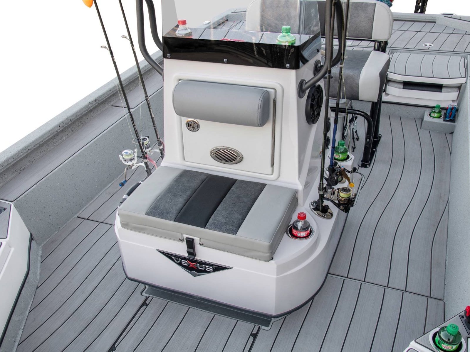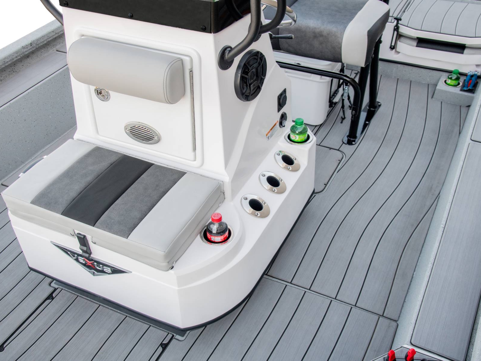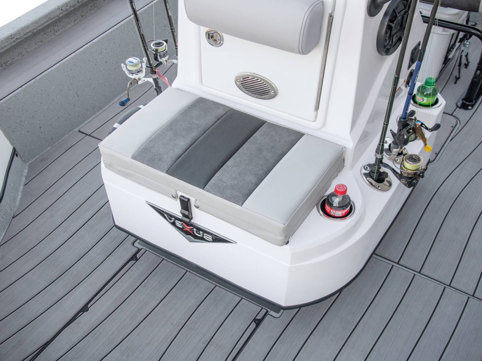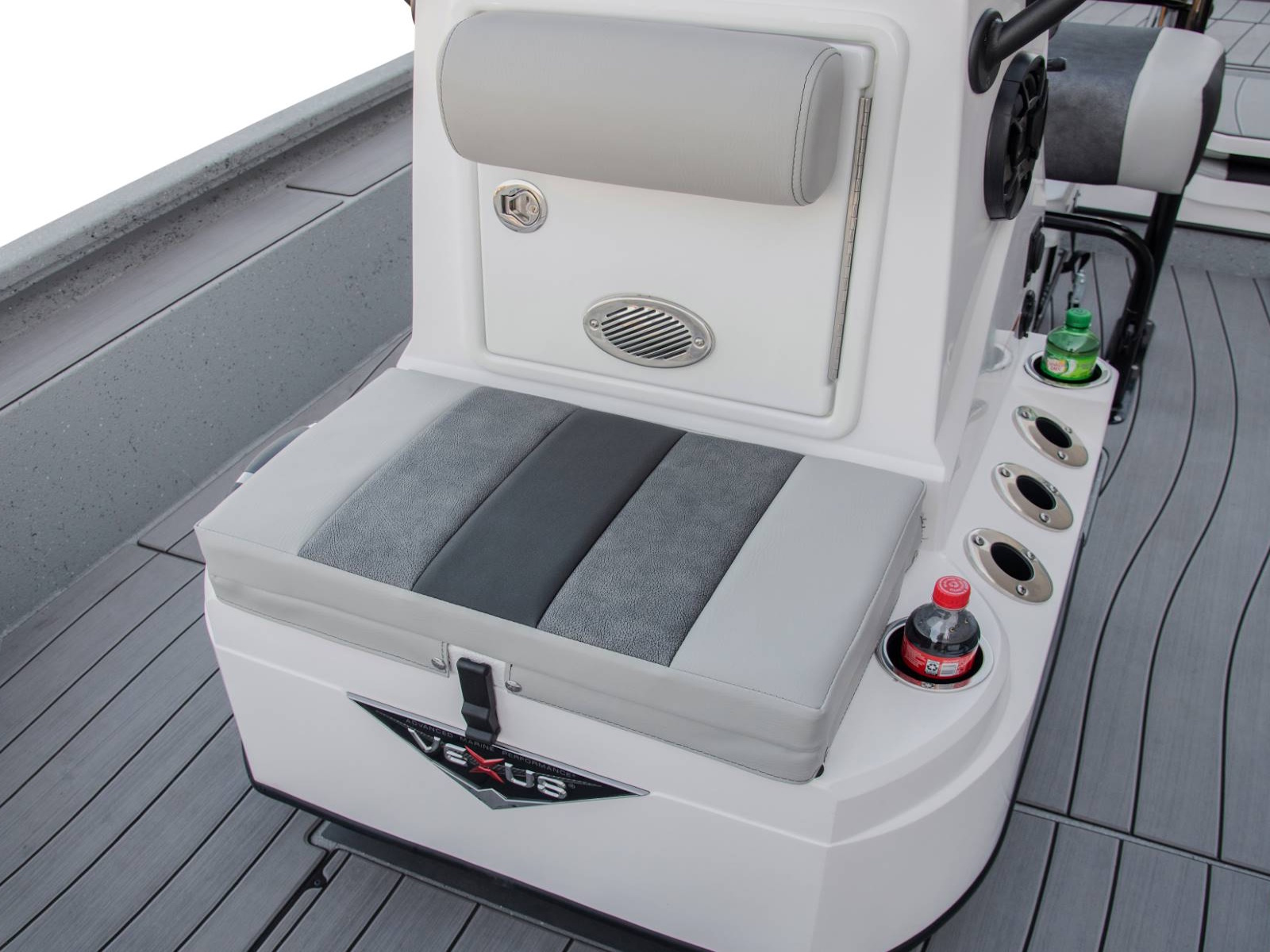 These fold-down jump seats reinforce the exceptional versatility and total performance nature of our ACX center console design. Providing exceptional comfort and added room for additional passengers, this custom feature adds even more room to an already spacious rear deck. Underneath, you'll find additional fiberglass storage that can double as a cooler.