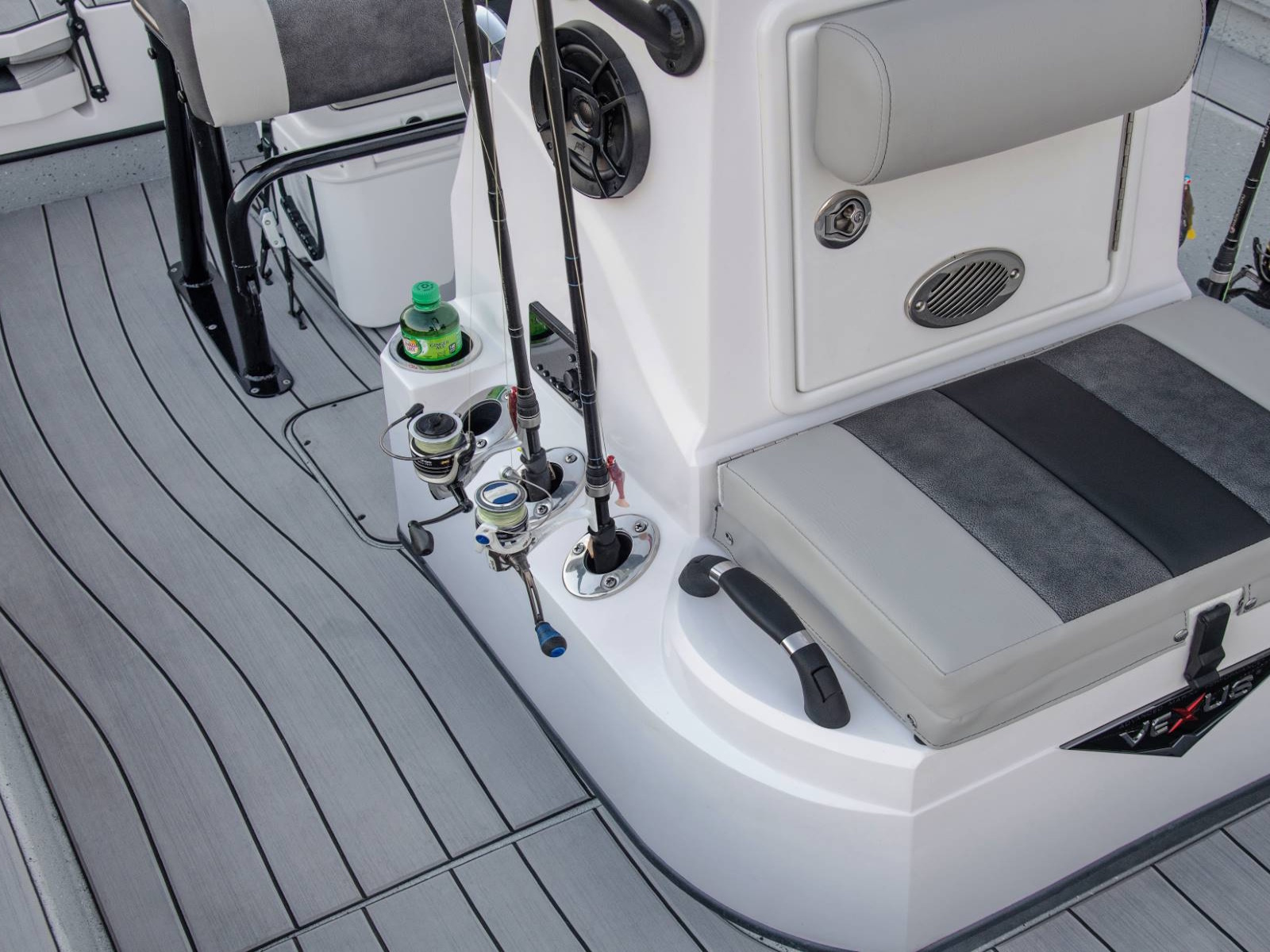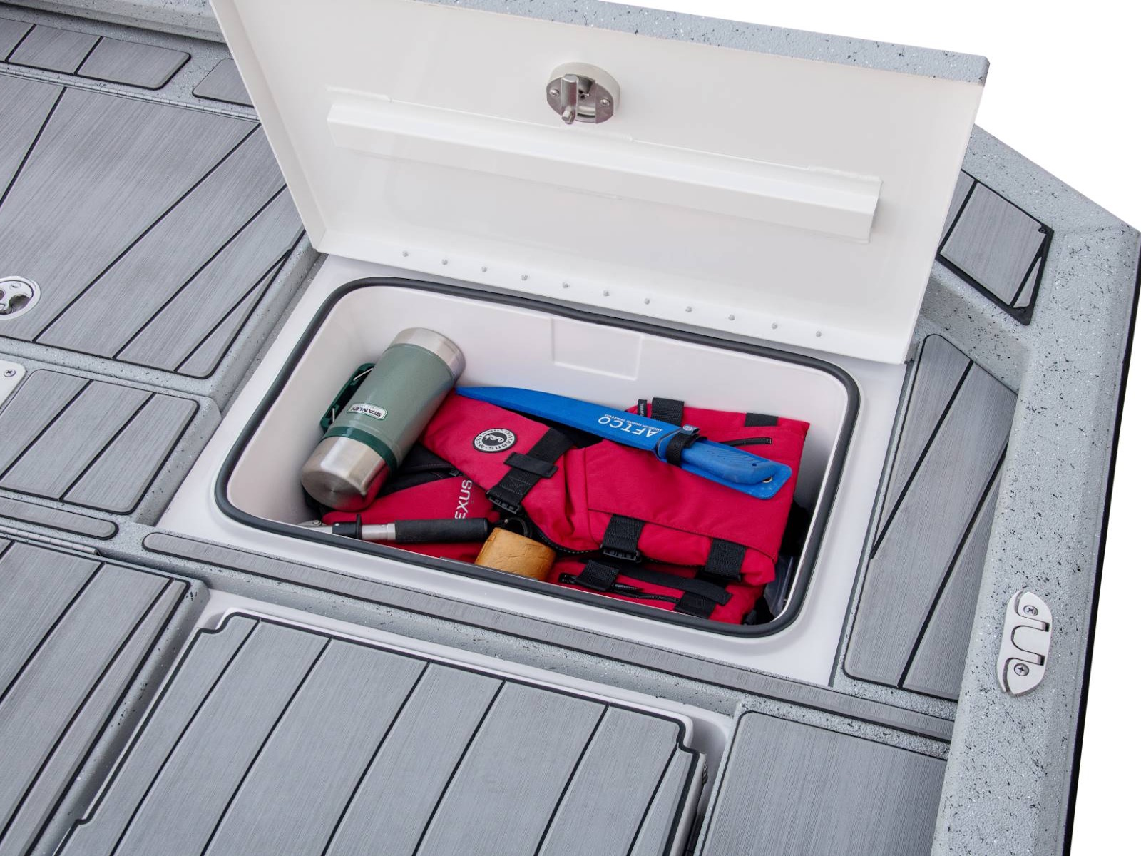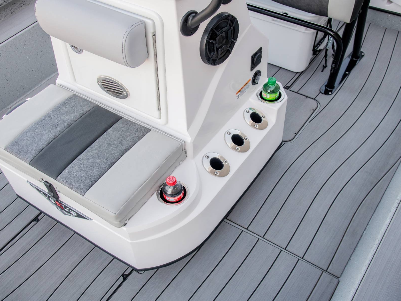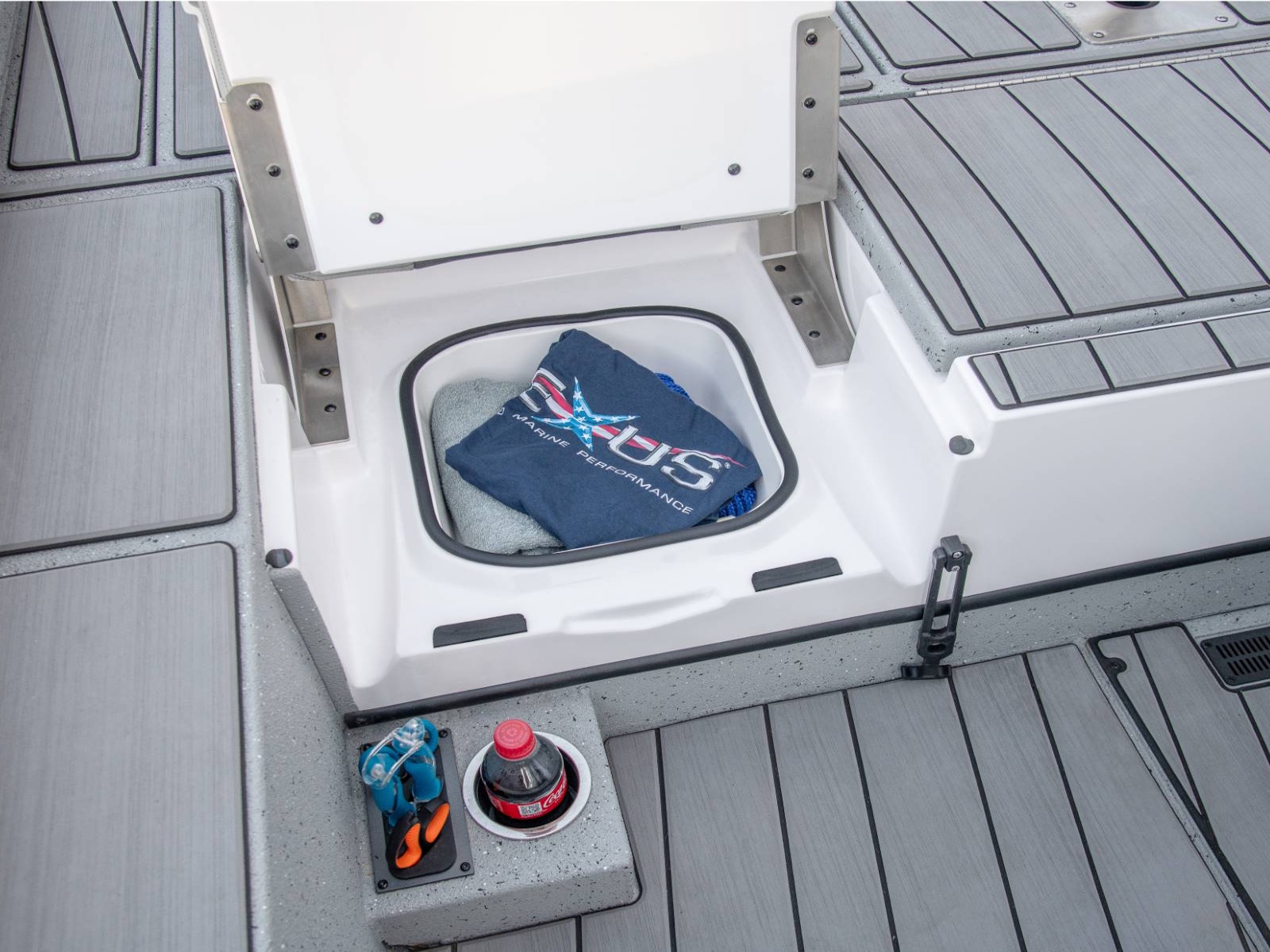 These fold-down jump seats reinforce the exceptional versatility and total performance nature of our ACX center console design. Providing exceptional comfort and added room for additional passengers, this custom feature adds even more room to an already spacious rear deck. Underneath, you'll find additional fiberglass storage that can double as a cooler.