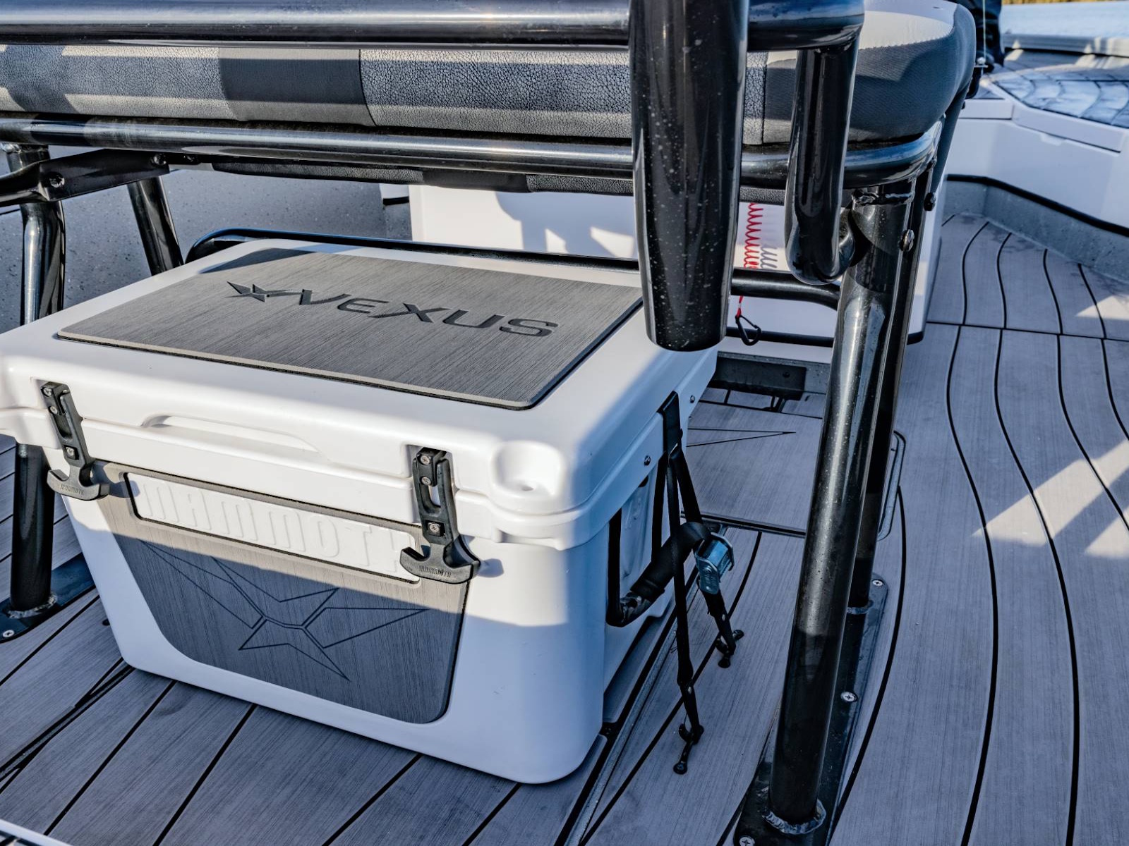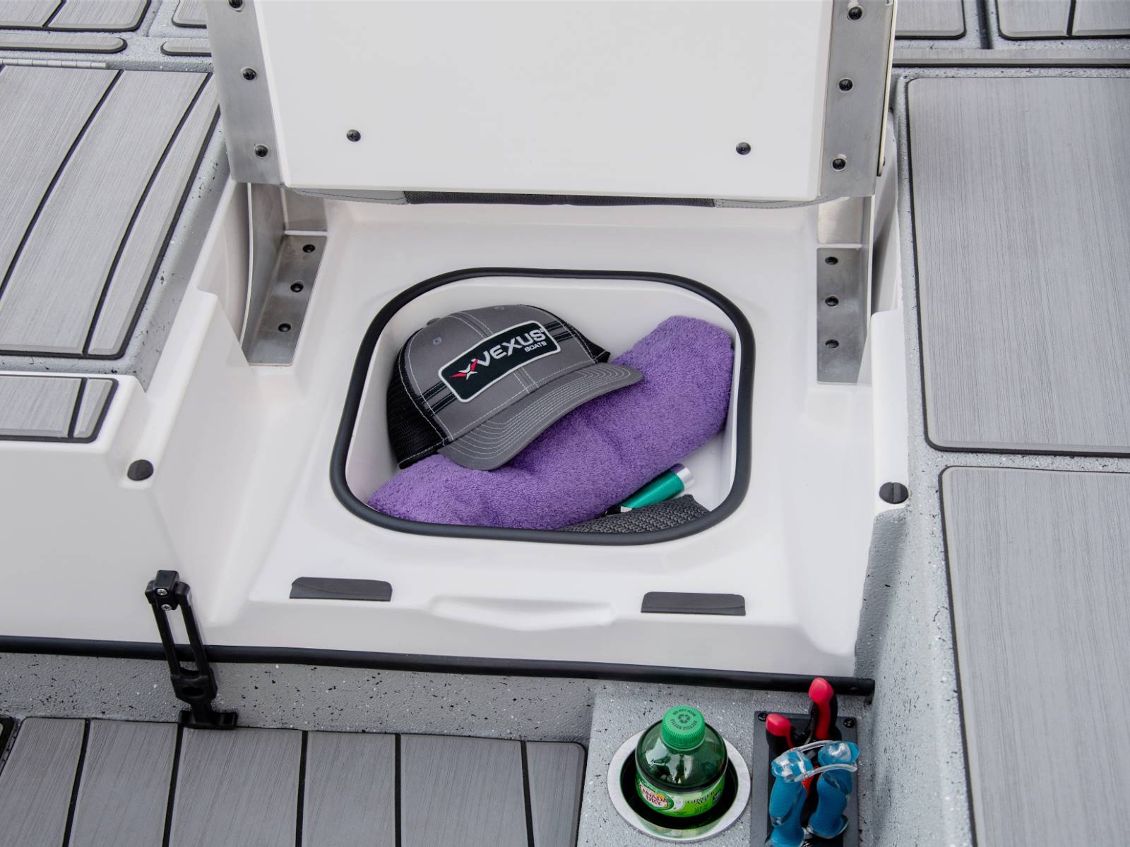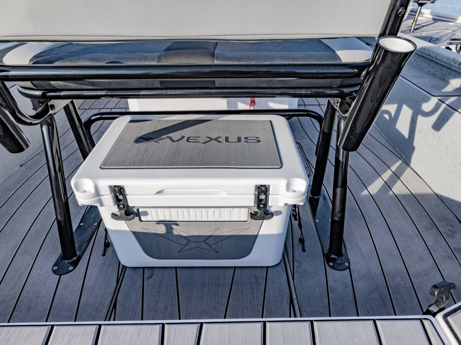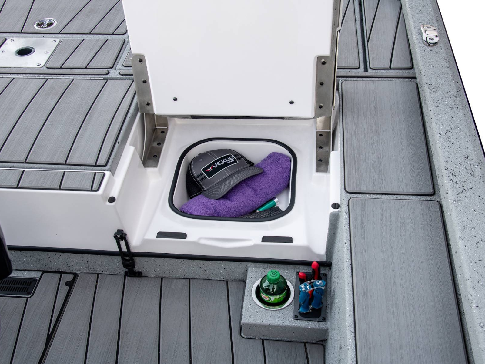 These fold-down jump seats reinforce the exceptional versatility and total performance nature of our ACX center console design. Providing exceptional comfort and added room for additional passengers, this custom feature adds even more room to an already spacious rear deck. Underneath, you'll find additional fiberglass storage that can double as a cooler.