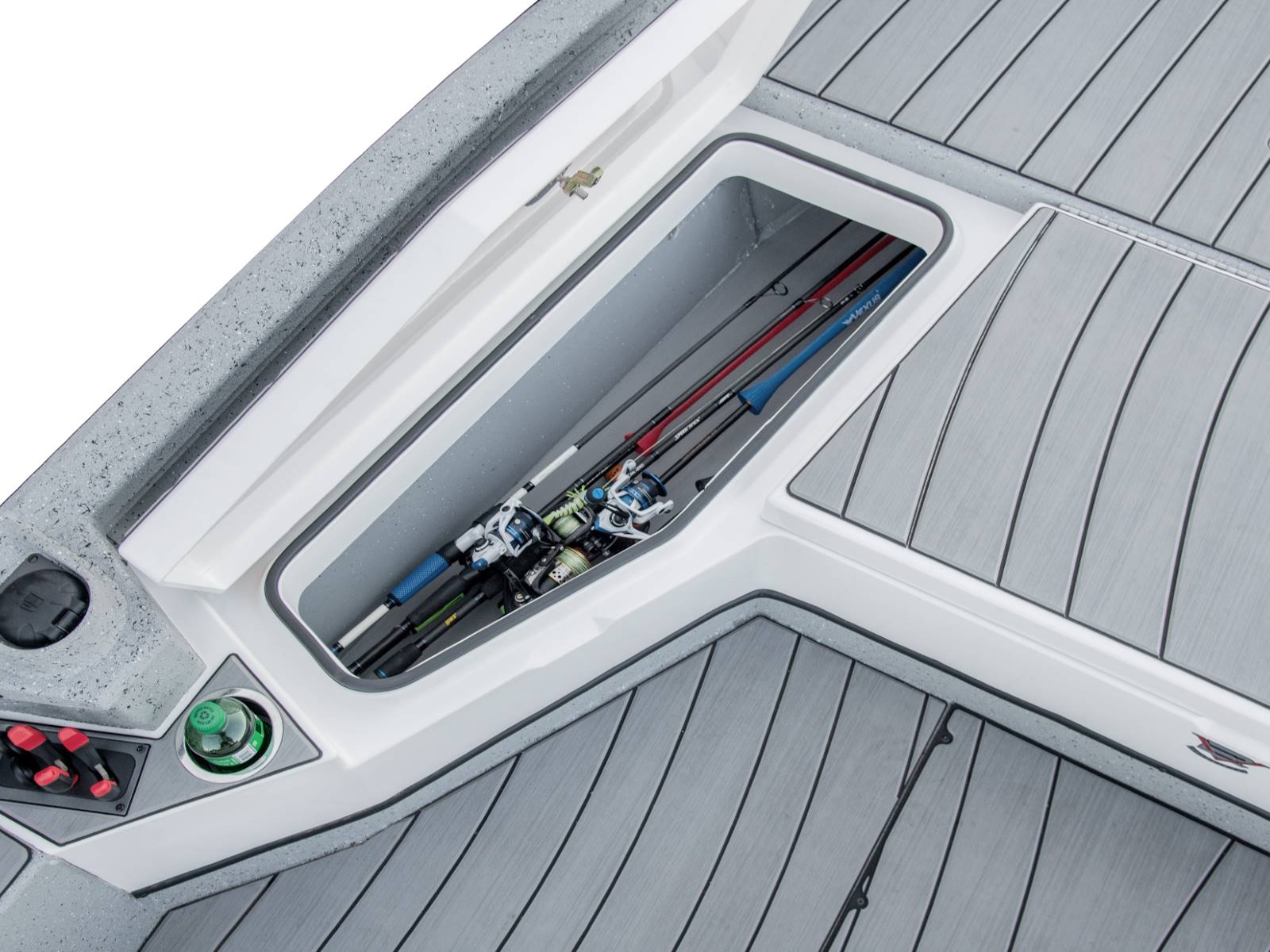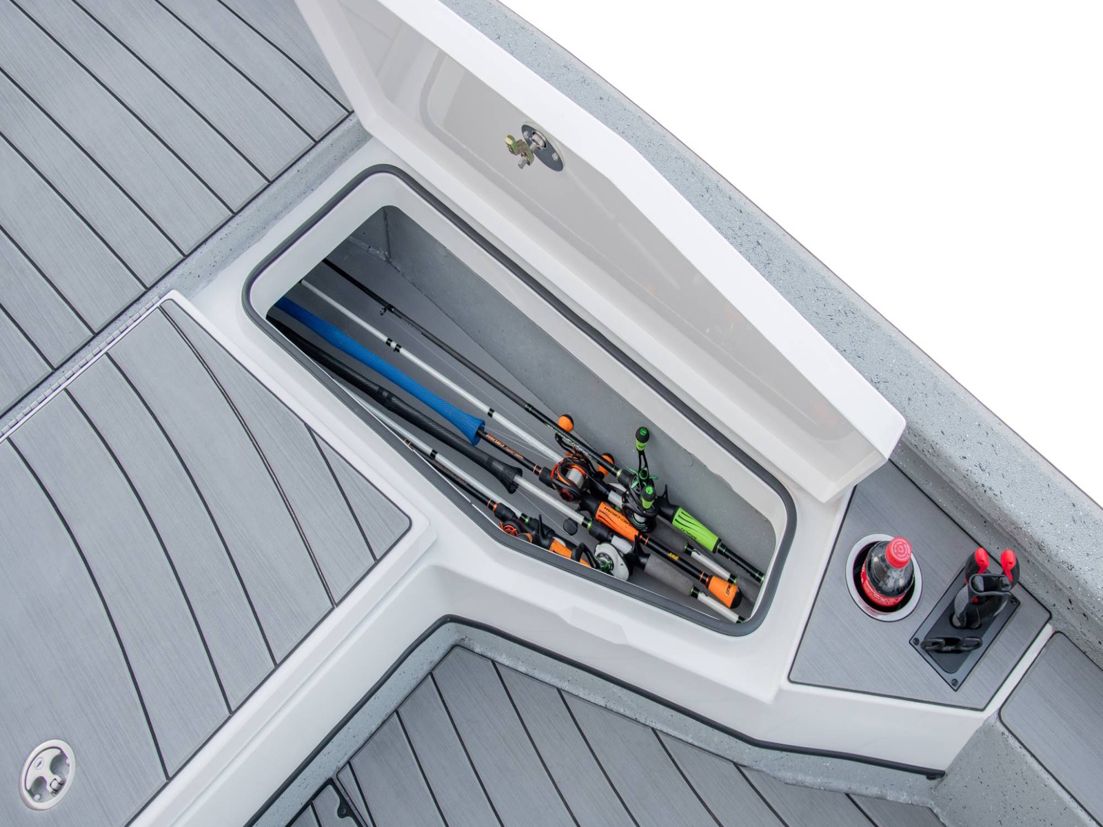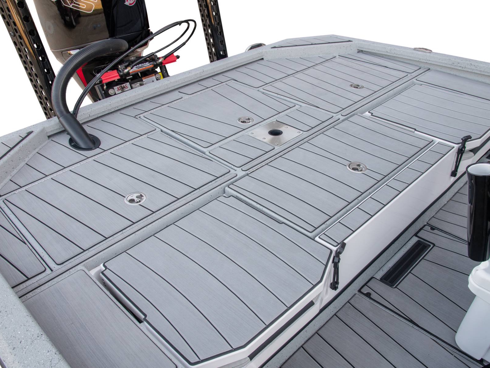 The rear deck includes a pair of custom jump seats with room for additional storage or another pair of coolers. Centering the aft deck, our tournament-inspired livewell includes a smooth, gel-coated interior, filter screens, recirculating aeration, and a built-in pump-out feature. There’s even more storage on both sides of the rear deck. The oversized fiberglass boxes are huge and include our Dri-Max™ Rapid Water Evac system to help keep the storages dry. The rearmost power compartment is engineered to house the crank battery and master power switch, as well as pumps when adding accessories like shallow water anchors and a hydraulic set back plate.