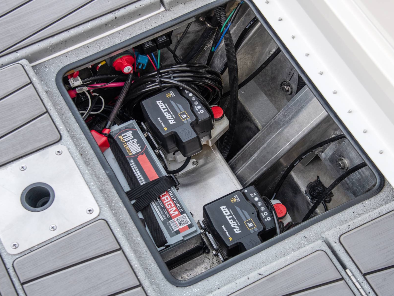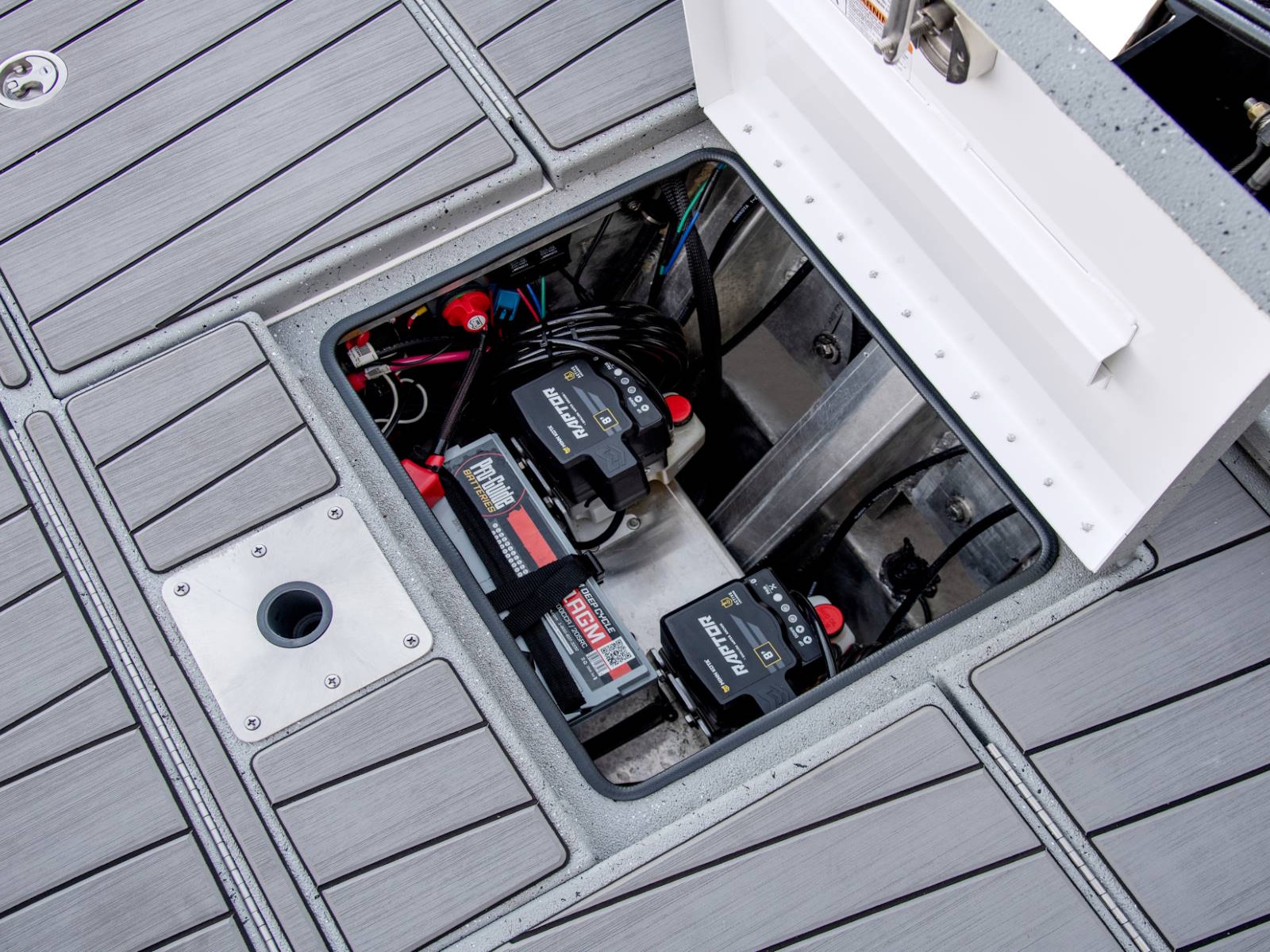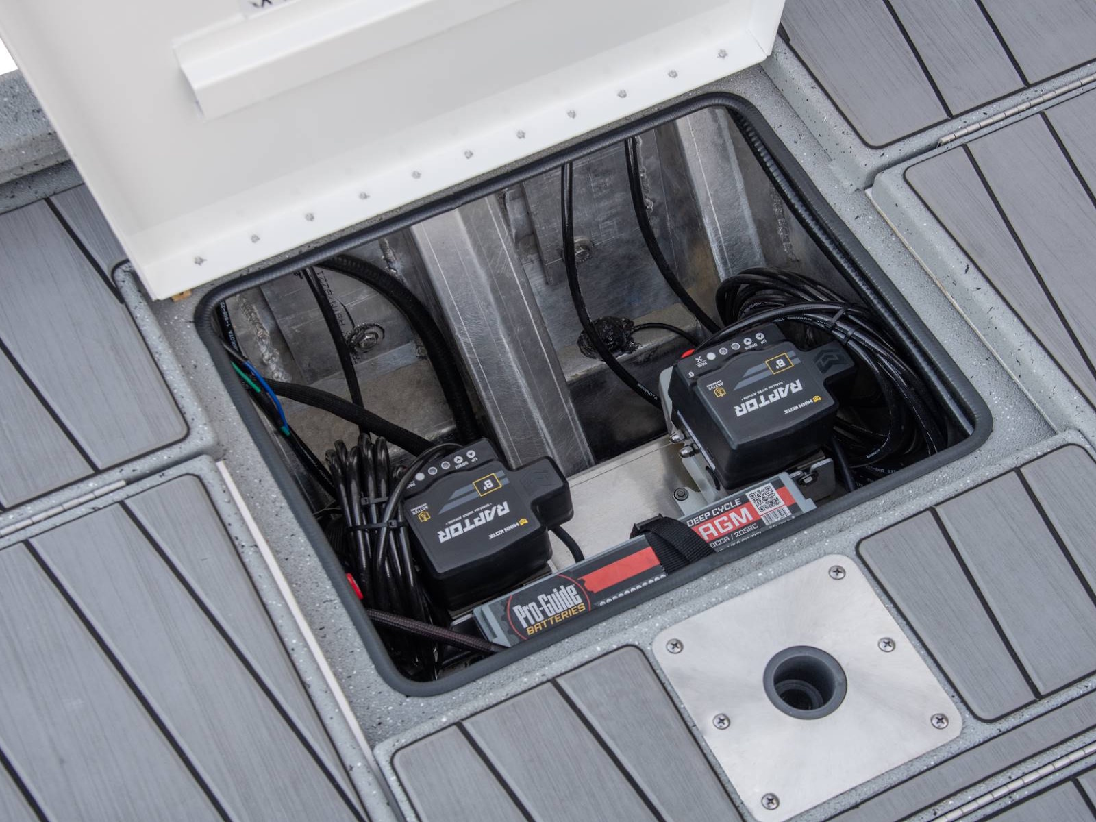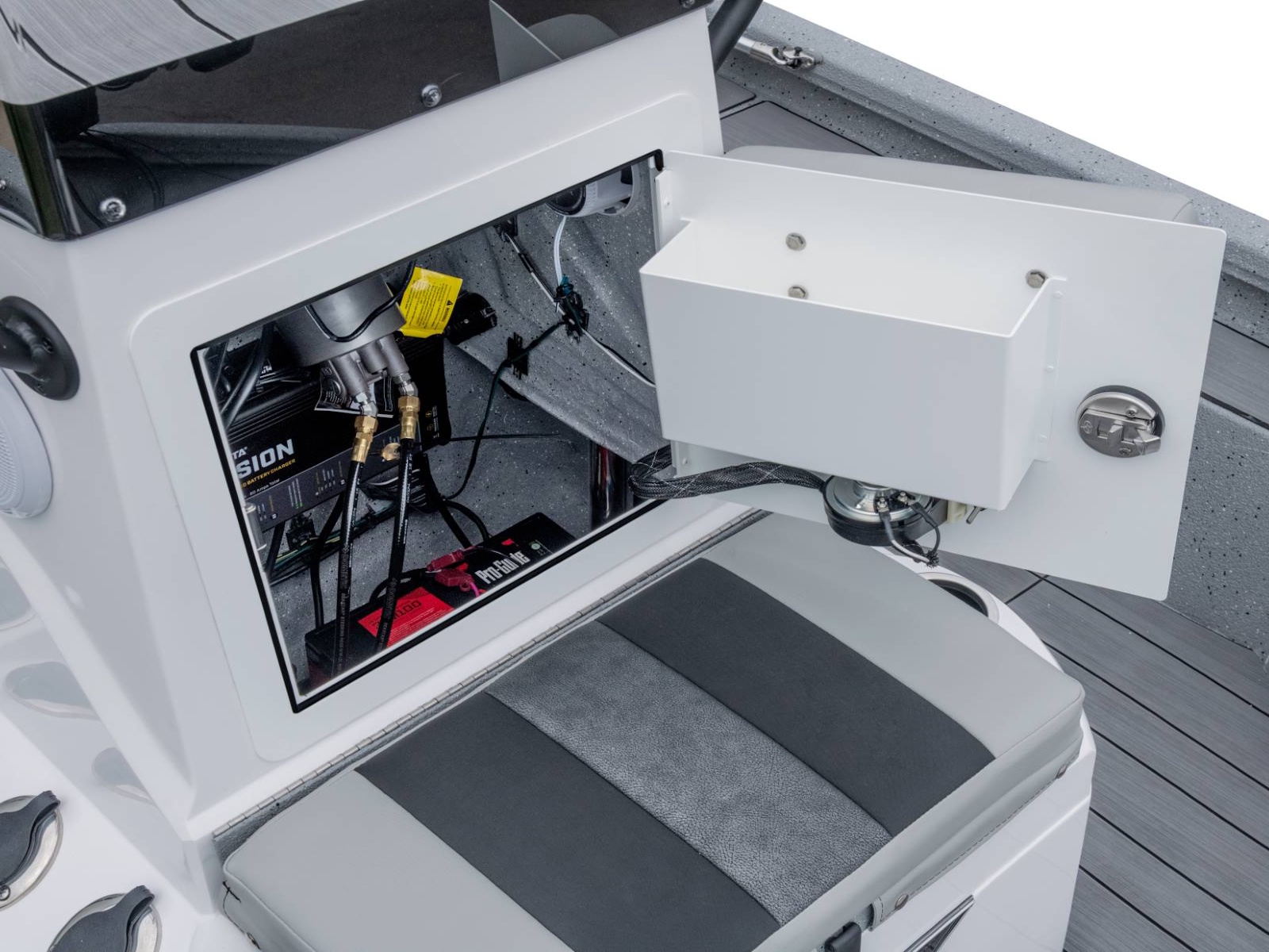 The rear deck includes a pair of custom jump seats with room for additional storage or another pair of coolers. Centering the aft deck, our tournament-inspired livewell includes a smooth, gel-coated interior, filter screens, recirculating aeration, and a built-in pump-out feature. There’s even more storage on both sides of the rear deck. The oversized fiberglass boxes are huge and include our Dri-Max™ Rapid Water Evac system to help keep the storages dry. The rearmost power compartment is engineered to house the crank battery and master power switch, as well as pumps when adding accessories like shallow water anchors and a hydraulic set back plate.