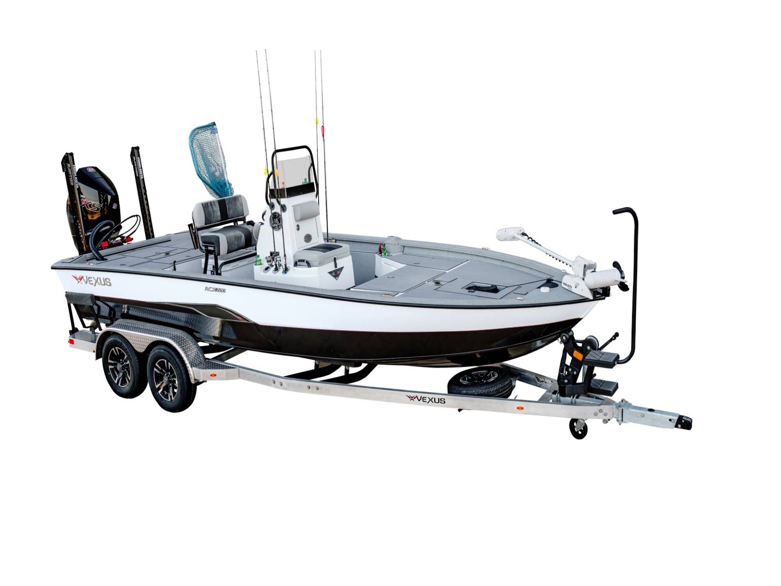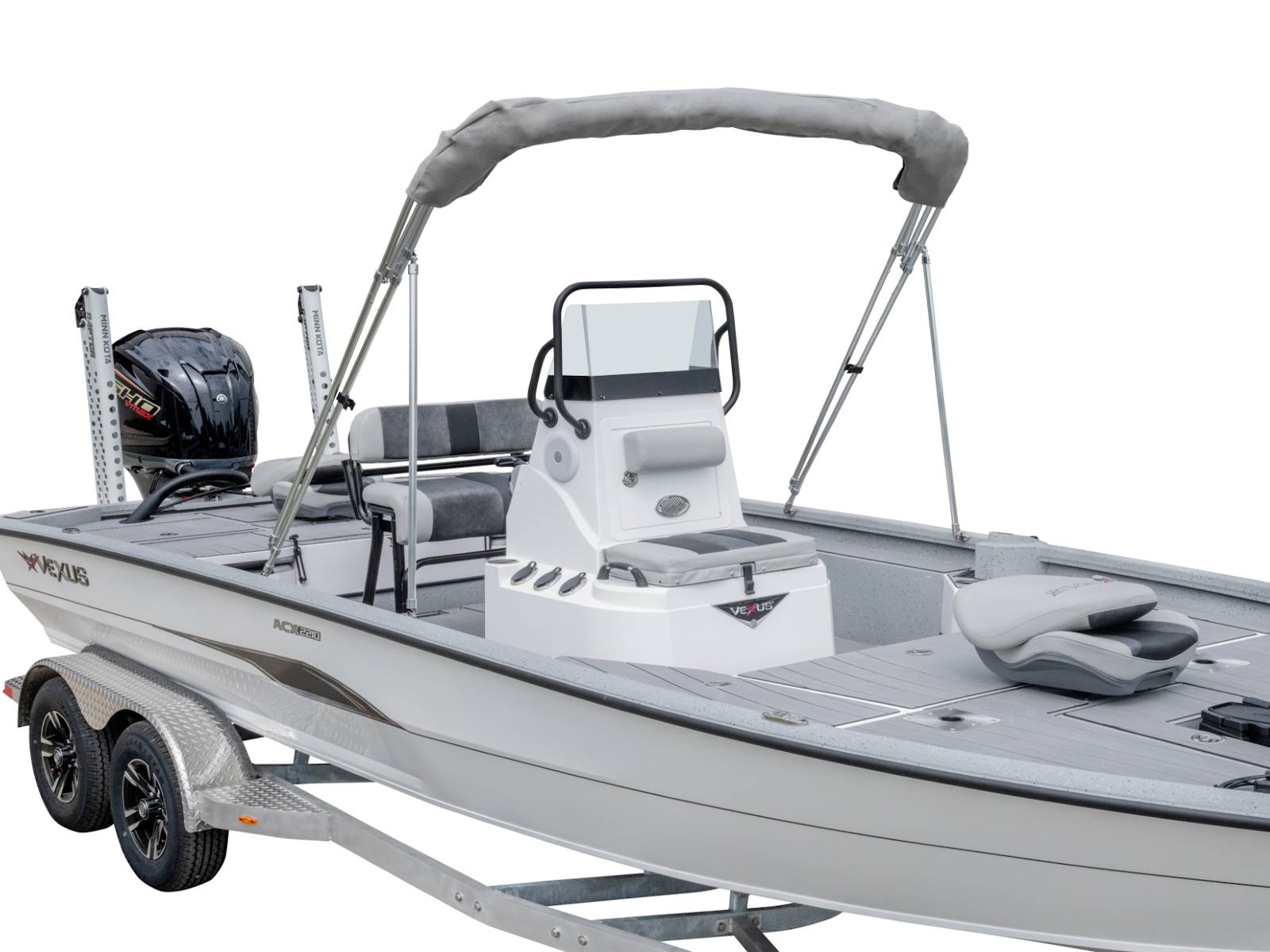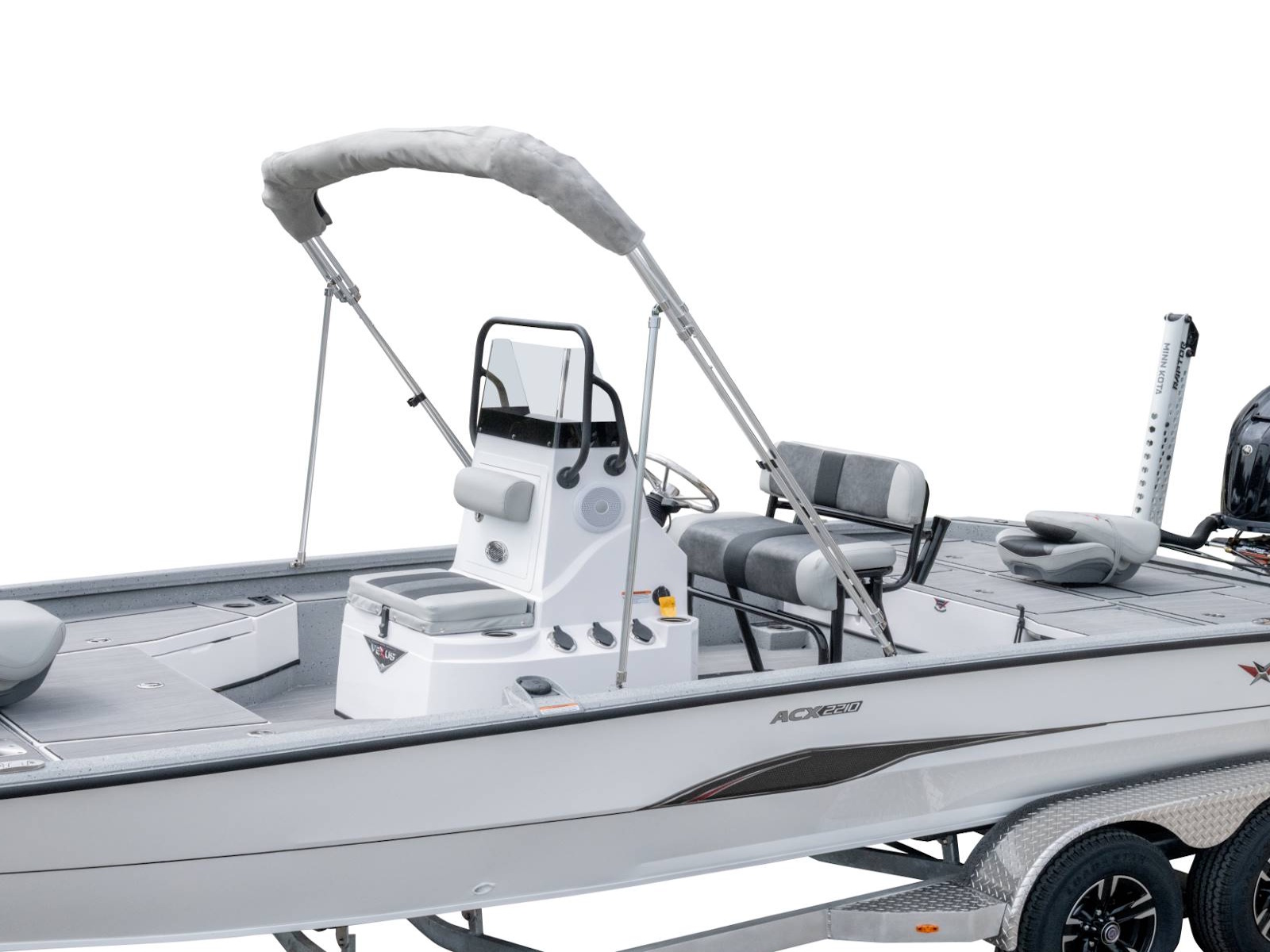 With more deck room, more rod and gear space, more fuel capacity, more reinforced fiberglass parts, more color options, more tool holders, more horsepower, and more performance, as well as an incredible level of fit and finish, this is the feature packed, ACX2210. Coupled with an available T-top, your choice of outboards, and electronics as well as a custom aluminum trailer with 4” C-channel frame, 14” aluminum wheels, swing-away tongue, diamond plate fenders and step pads, hydraulic surge brakes on both axles, hybrid oil hubs, custom-fitted bunks, and more, this ultra-versatile rig is built to be the best design you can land on!