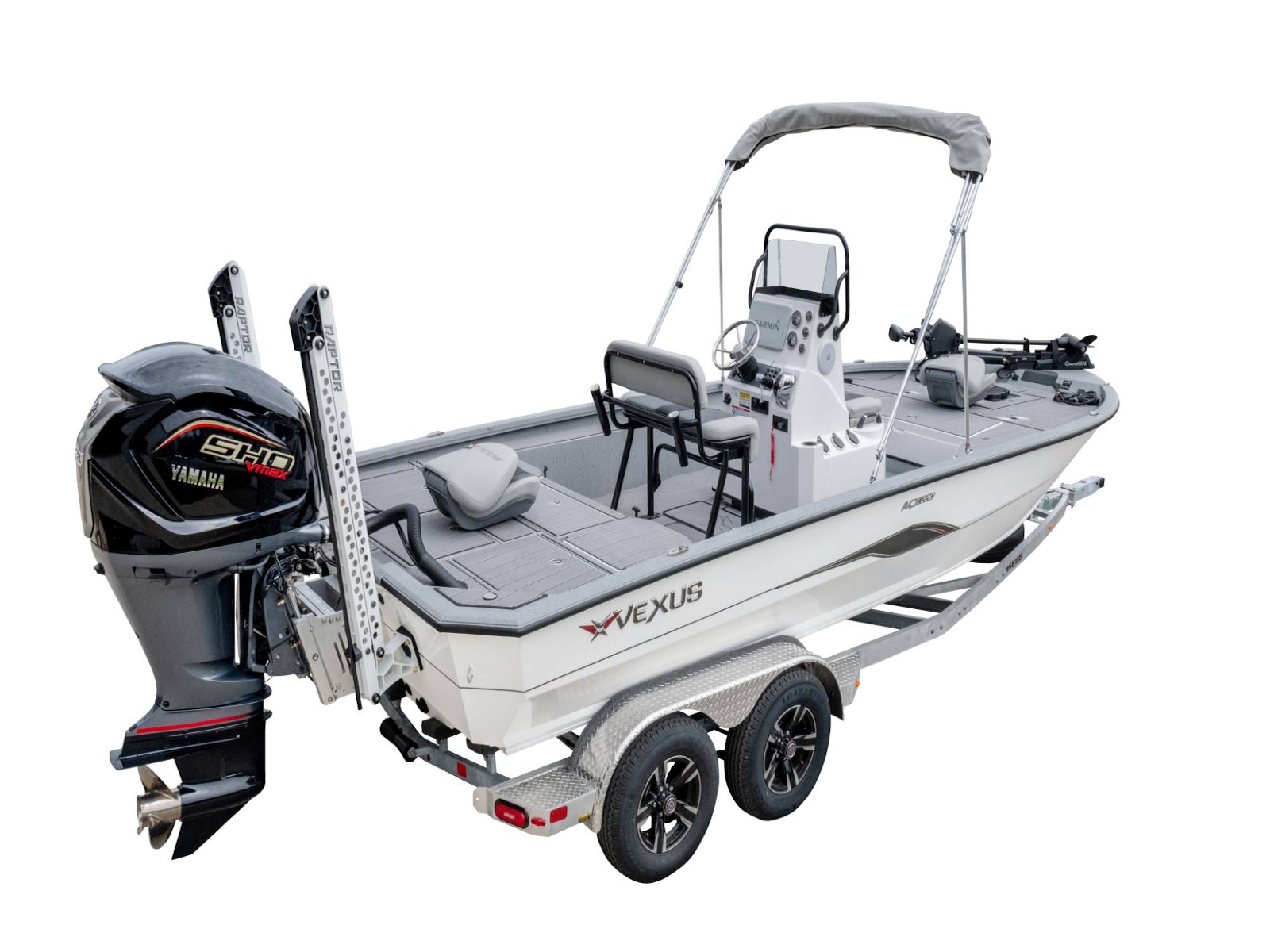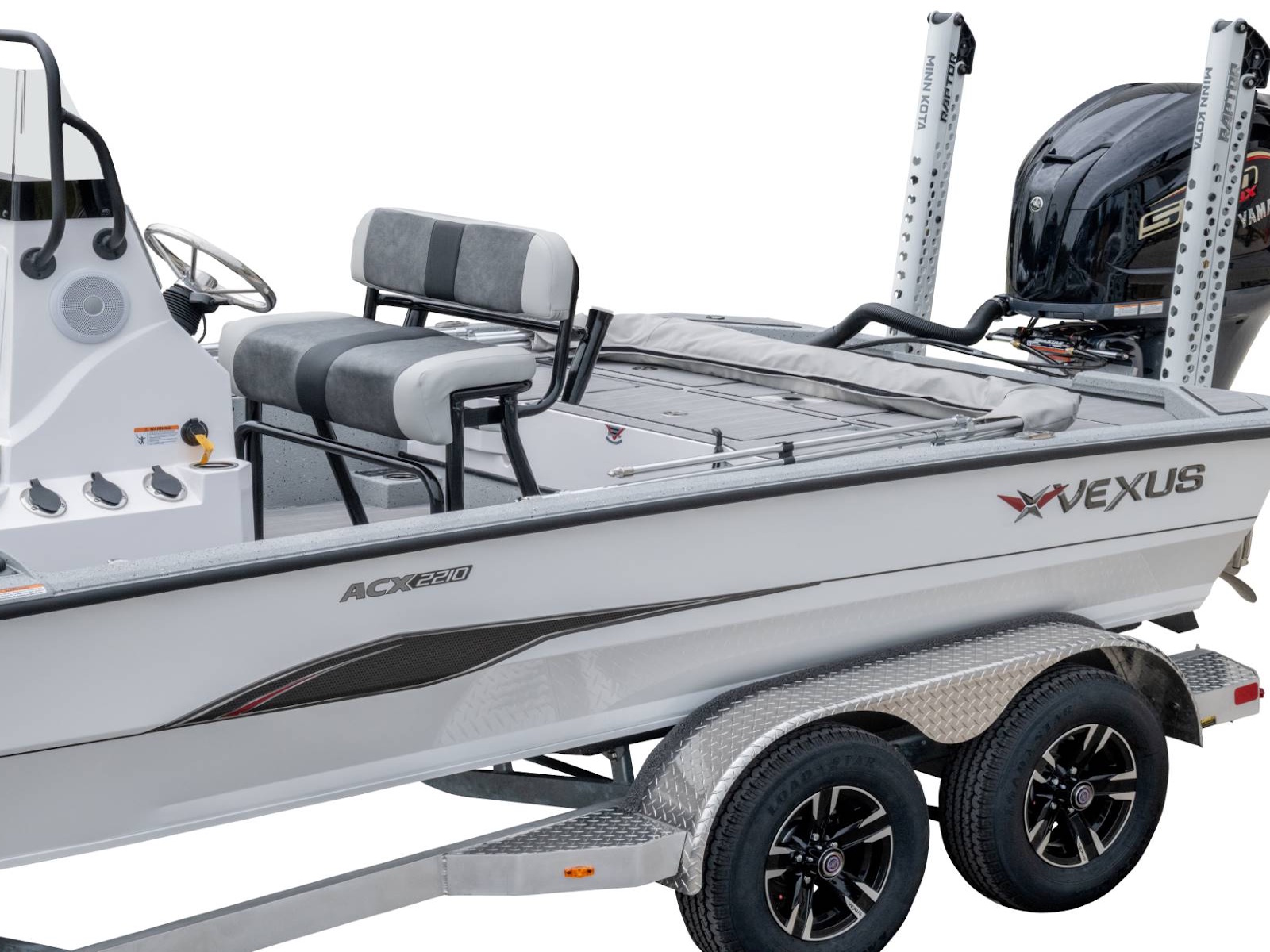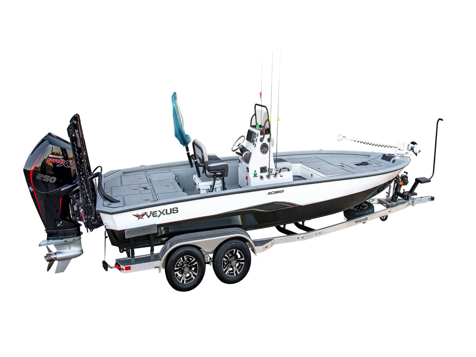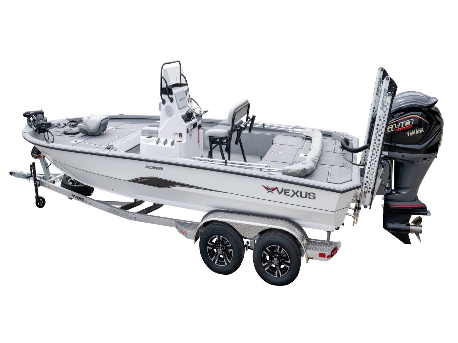 With more deck room, more rod and gear space, more fuel capacity, more reinforced fiberglass parts, more color options, more tool holders, more horsepower, and more performance, as well as an incredible level of fit and finish, this is the feature packed, ACX2210. Coupled with an available T-top, your choice of outboards, and electronics as well as a custom aluminum trailer with 4” C-channel frame, 14” aluminum wheels, swing-away tongue, diamond plate fenders and step pads, hydraulic surge brakes on both axles, hybrid oil hubs, custom-fitted bunks, and more, this ultra-versatile rig is built to be the best design you can land on!