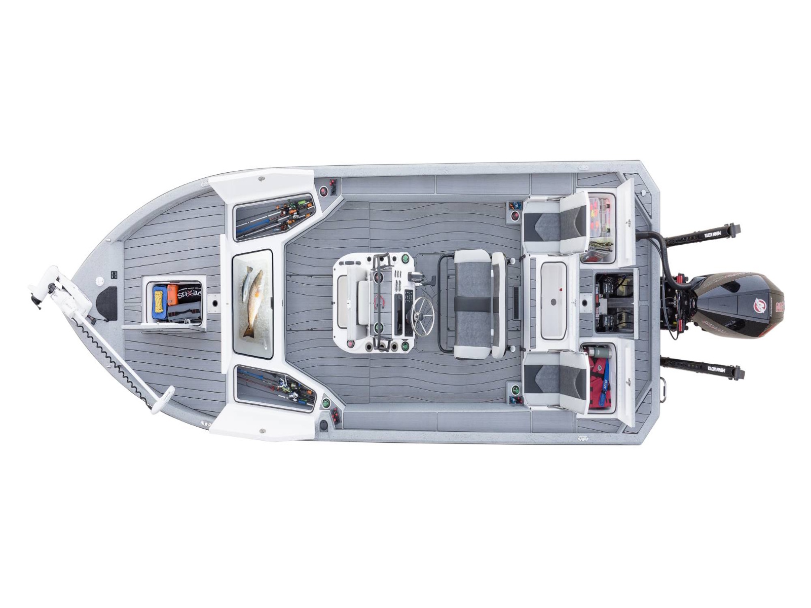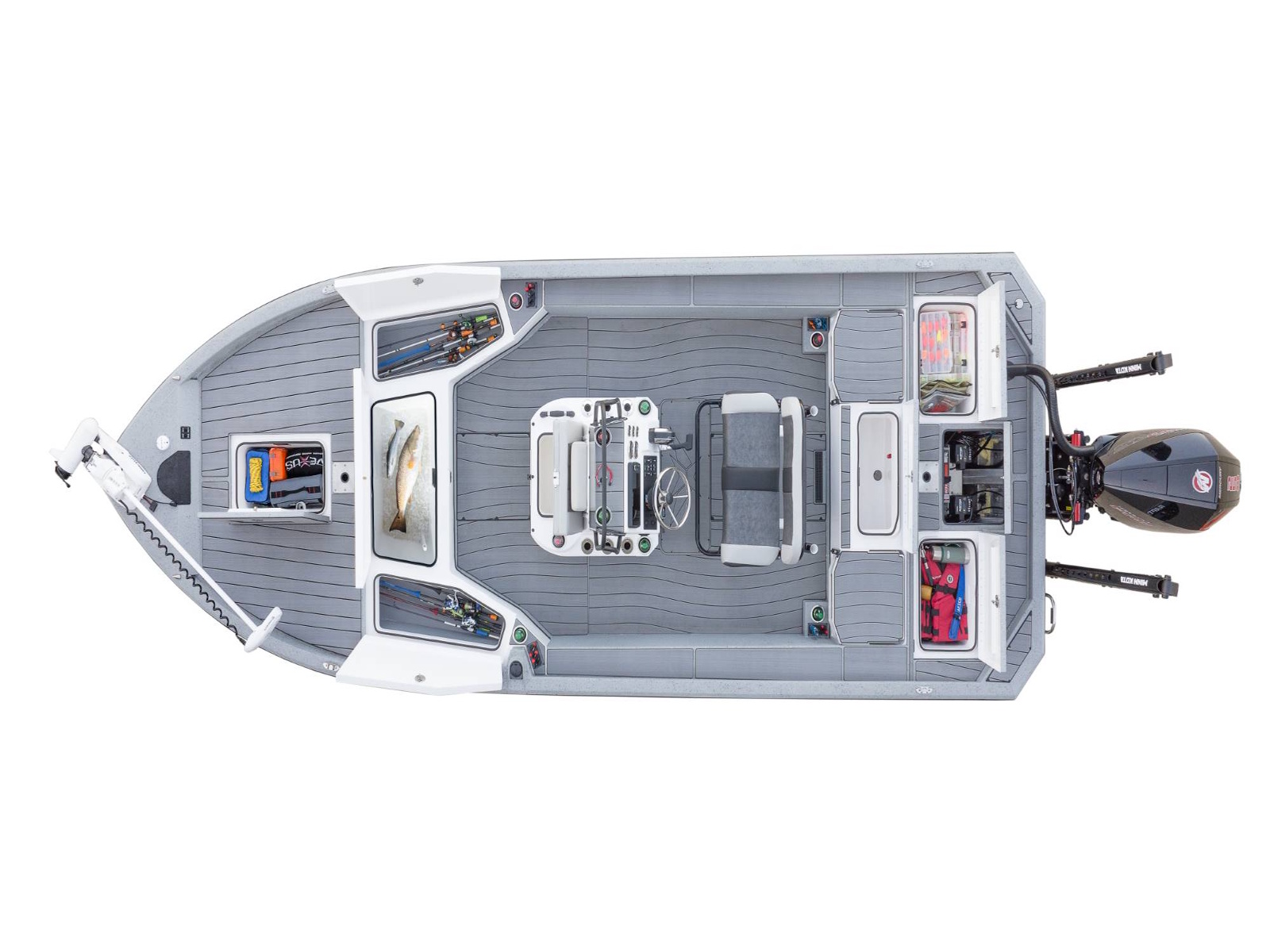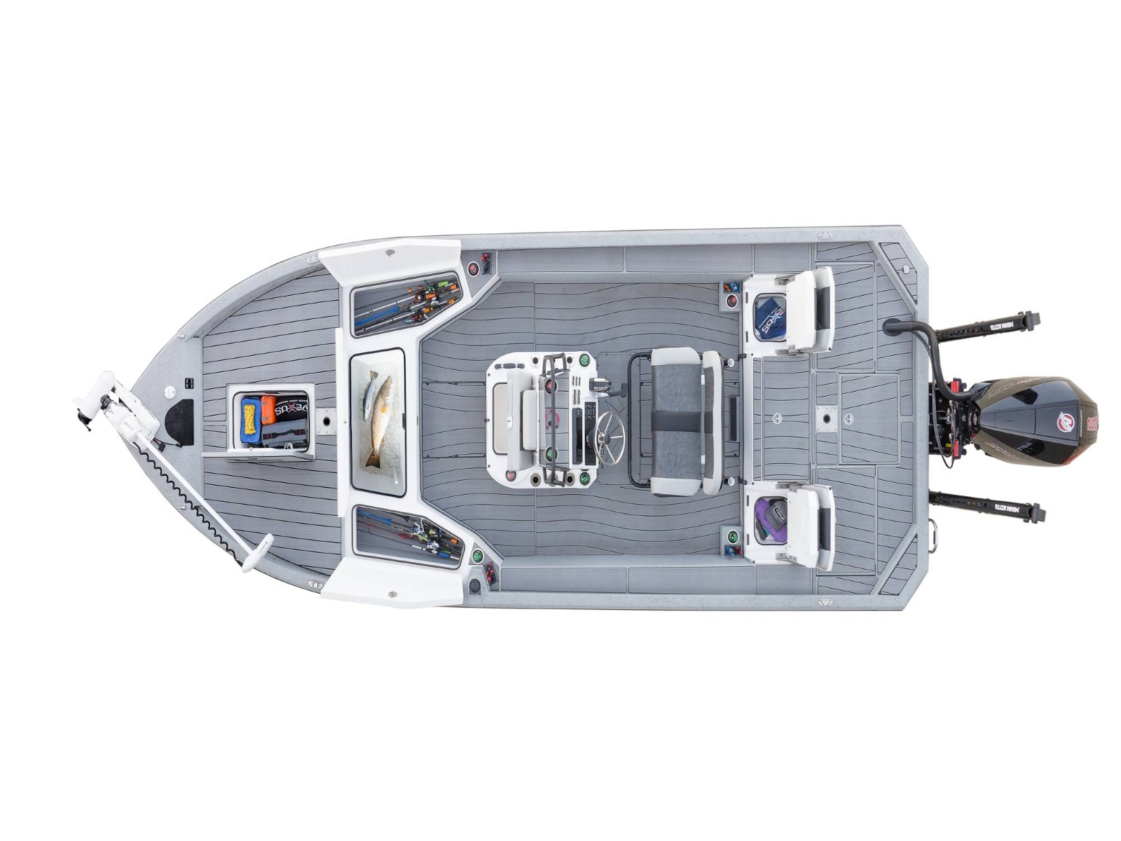 Up front, the deck is so large that installation of three-across seat bases is available. The broad-beamed design also features integrated NAV lights, bow switches, and plenty of room for a wide choice of factory-installed electronics. Centering the deck, a forward storage box includes an insulated and gel-coated compartment with a compression latch, raised moisture barriers, and rubber trim seal for optimum protection from water and weather. Likewise, the forward lid is available with a recessed tray if a flush-mounted trolling motor pedal is preferred. Balancing the front deck, a pair of 8’ rod boxes include a padded polyethylene liner along with added depth for a wealth of your favorite sticks. In between those compartments is a large, insulated fish box with our FreshVent™ drain.