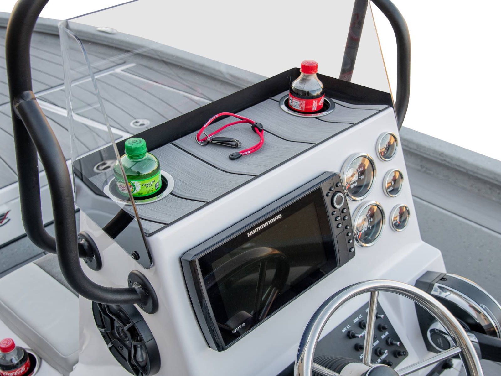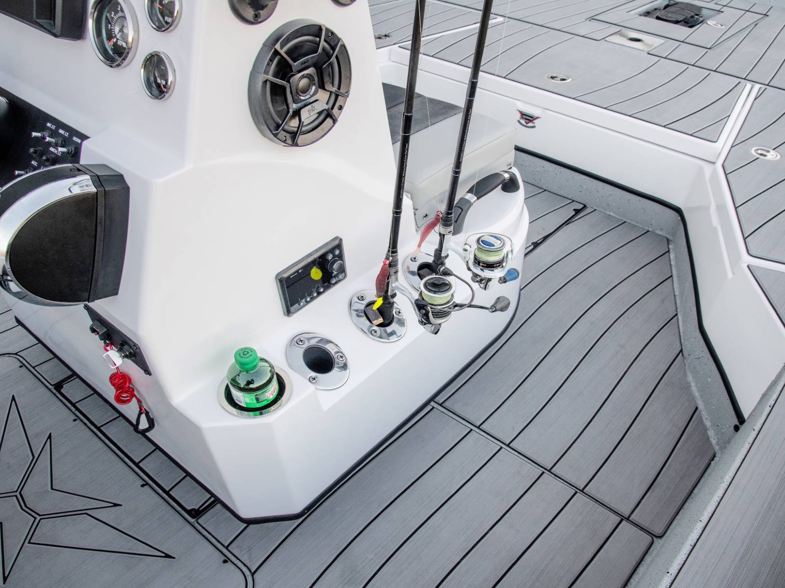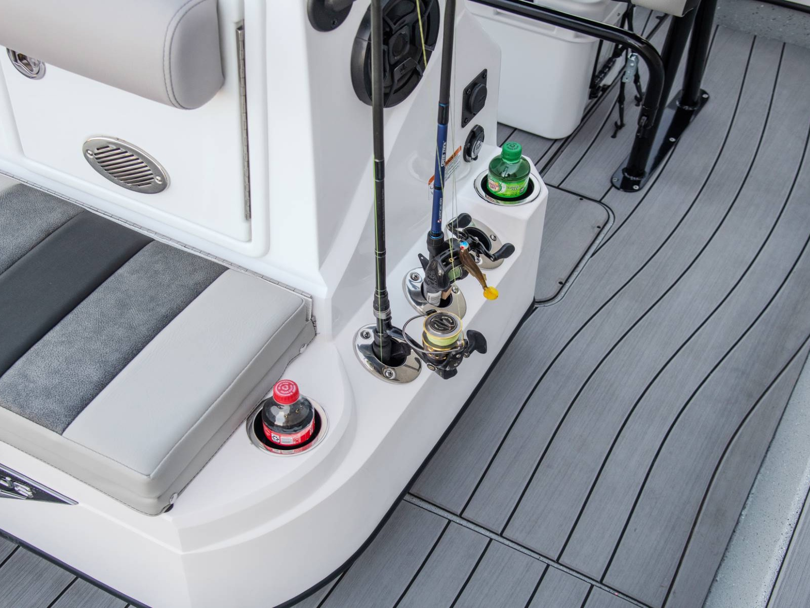 We don't simply screw our console to the floor. It's mounted to a fiberglass island, providing a toe rail that increases floor space and hides strip LED lighting. Inside, you'll find easy access to your battery charger and rigging. We even go so far as to mount the charger plug outside the console, saving that unnecessary climb back into the boat when the day is done. At the front of the console, you'll find an integrated baitwell with additional seating on top. Cupholders, rod holders, windshield, and grab rail make this console a true workstation.